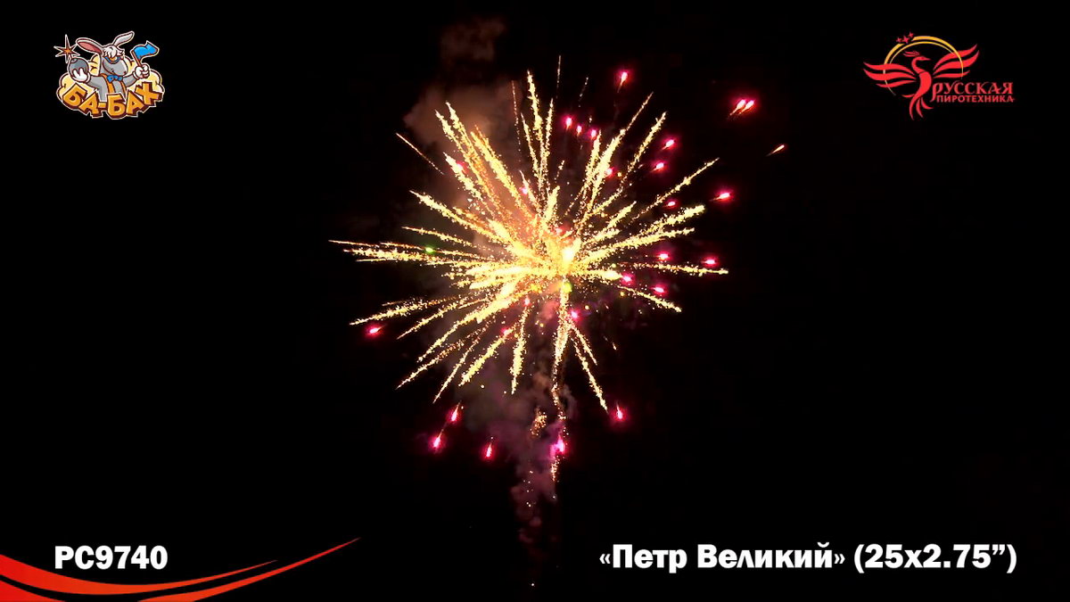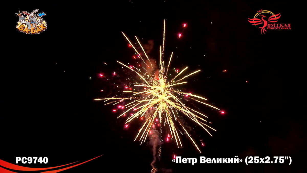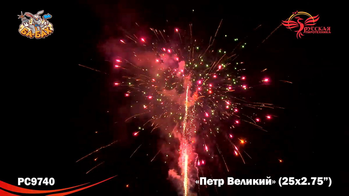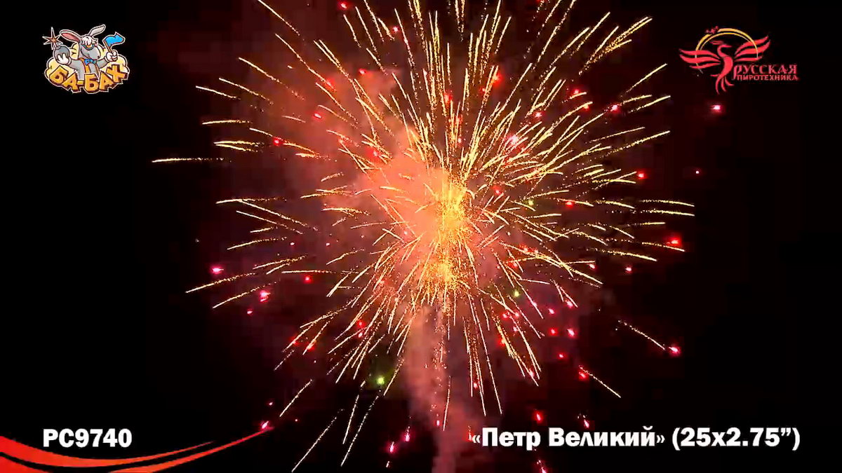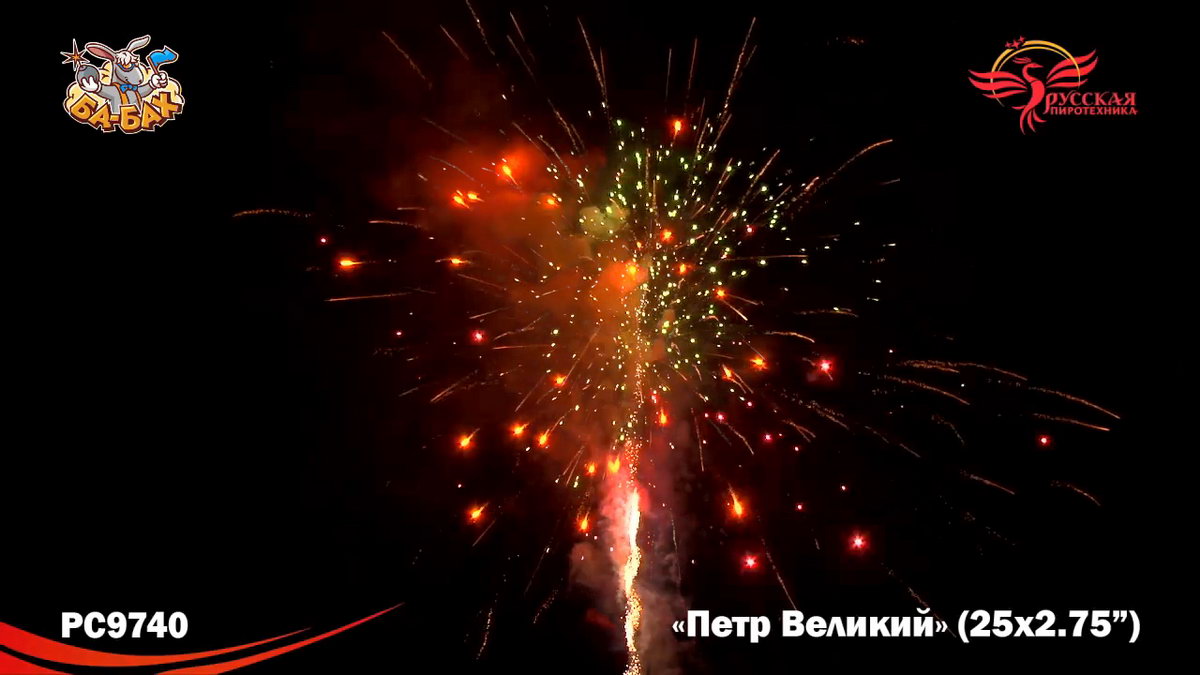 Великой исторической фигуре должен быть посвящен самый грандиозный и мощный салют. Чтож, можем констатировать, что мастера фейерверочных искусств из "Русской Пиротехники" не ударили в грязь лицом! "Петр Великий" - поражающий воображение своей мощью салют невероятного, огромного калибра 2,75 дюйма. Каждый залп фейерверк - как залп Царь-Пушки: еще долго отдается эхом, а небо будет полностью закрыто сияющим дождем золотых и разноцветных искр, комет, трасс и мерцания. Воинская слава, победы, достижения России при Петре 1 - все это получило достойное воплощение в огромной и мощной батарее "Петр Великий".