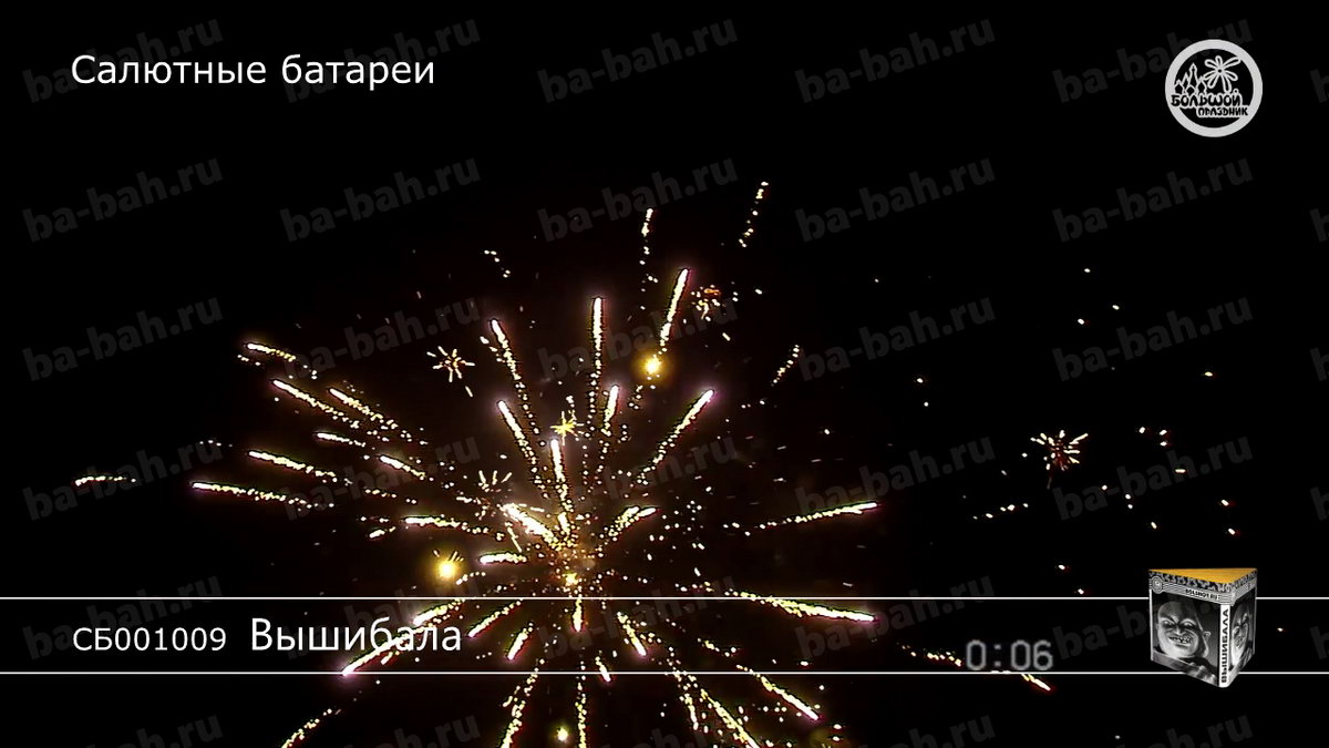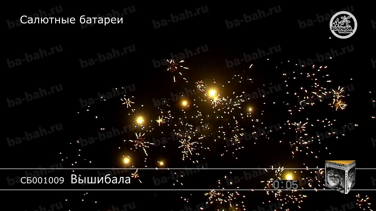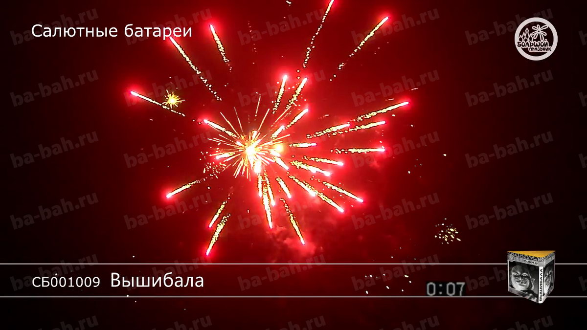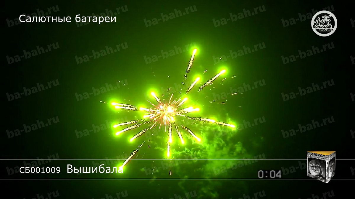 Фейерверк "Вышибала" - это 9 залпов с красивыми эффектами: кометы с искристыми шлейфами, синие звезды, серебристые рыбки. Этот салют - пример того, как обманчива порой бывает внешность: угрюмый Вышибала может выпучивать глаза и строить страшные рожи, но в душе он добряк, и хочет всего лишь подарить замечательное, хоть и маленькое, пирошоу.