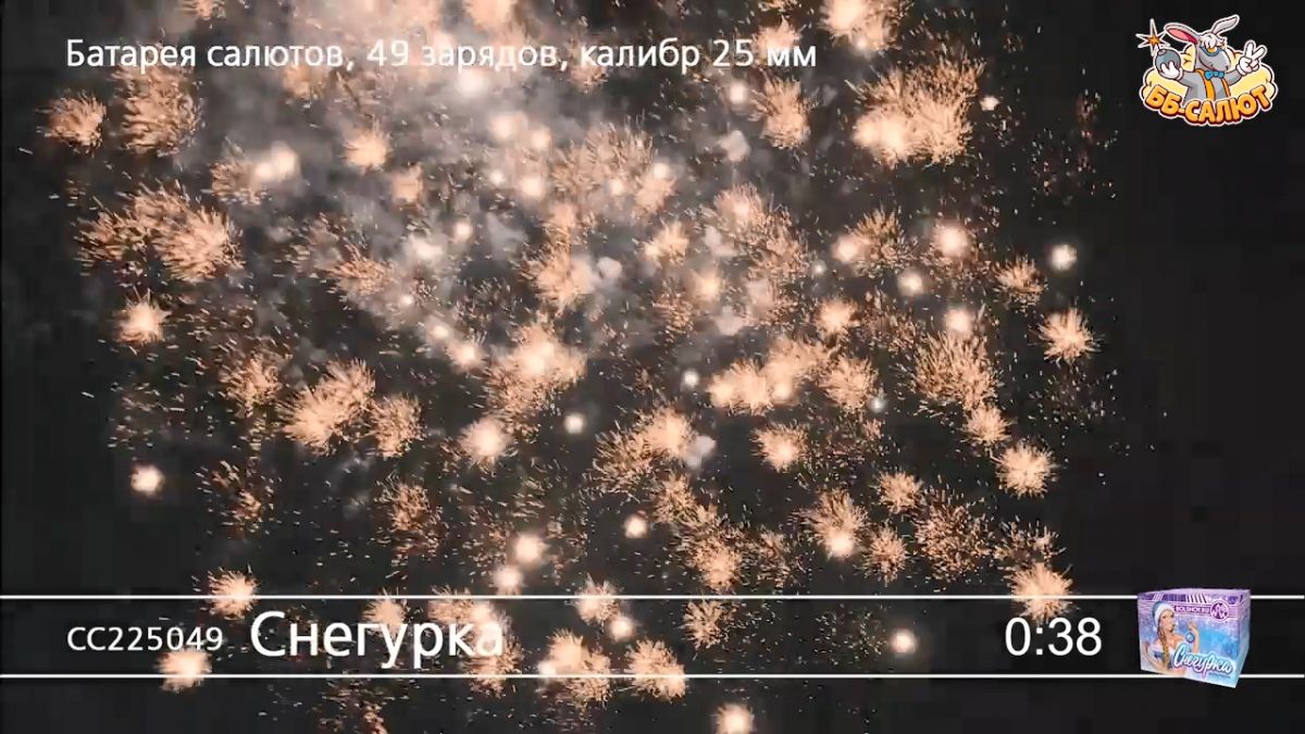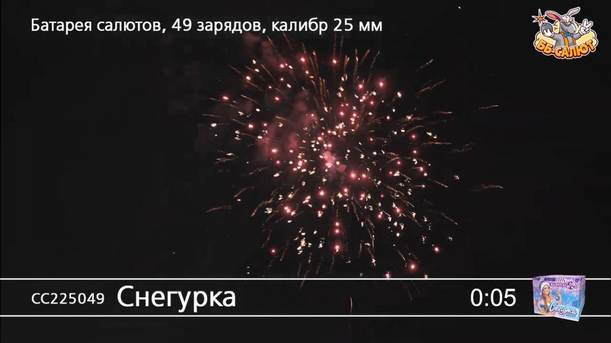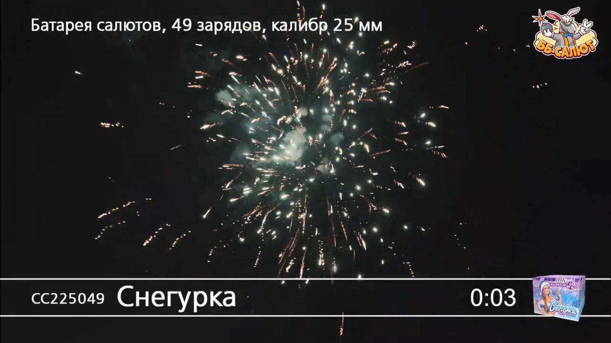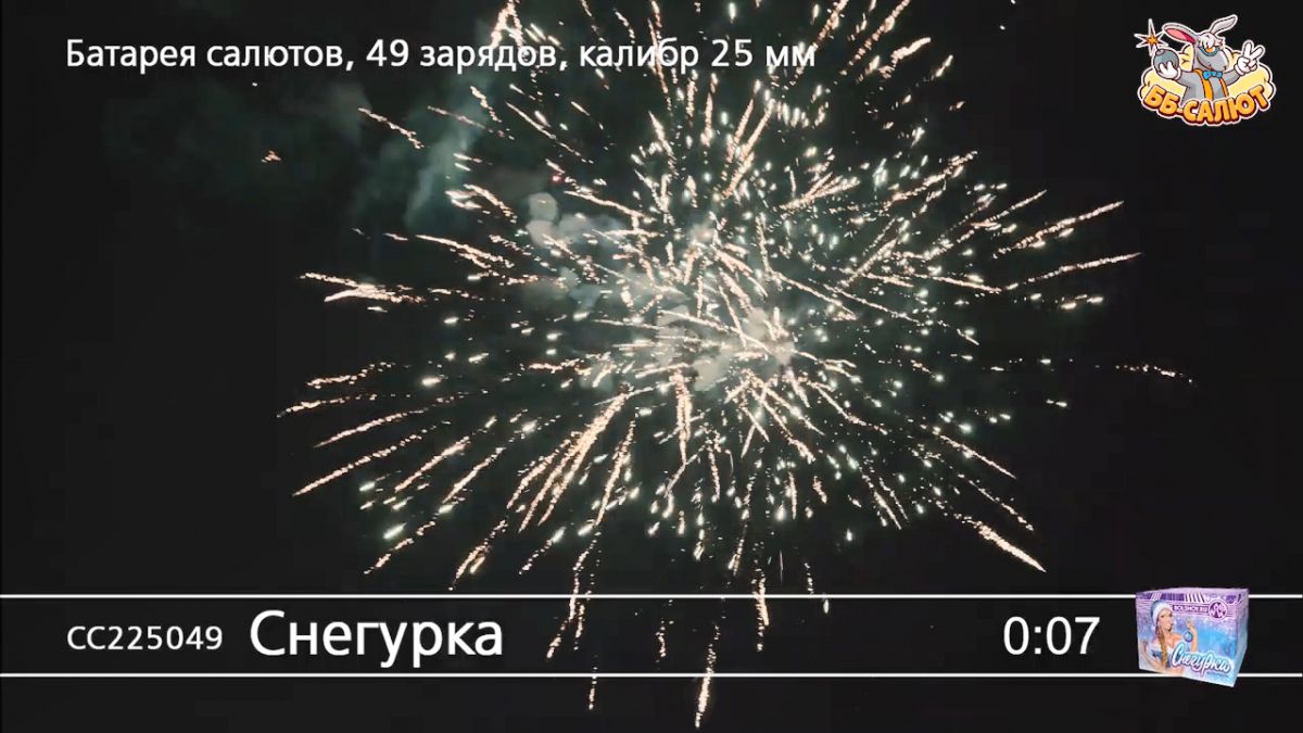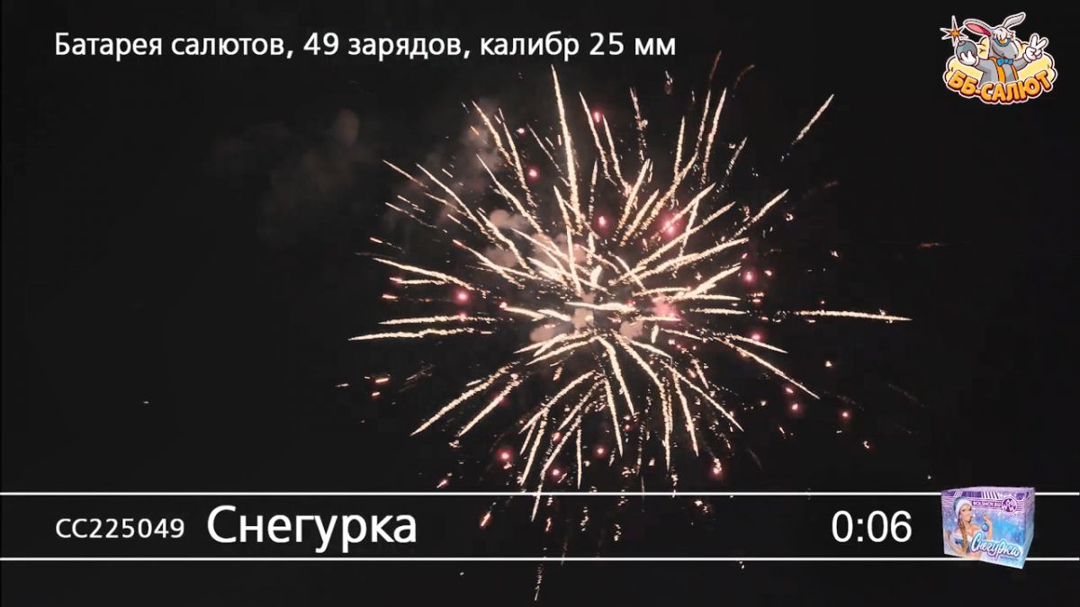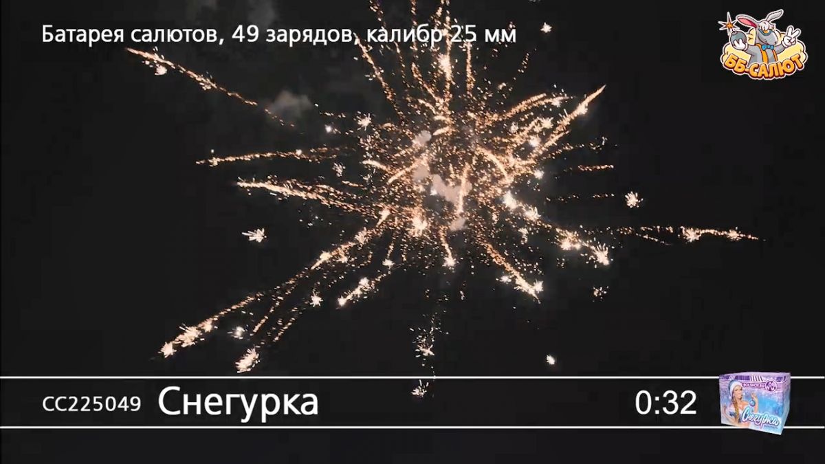 Сне-гу-ро-чка! вот что кричат ребятишки на праздновании Нового года. Эту снежную умницу-красавицу любят все. Она - незаменимая помощница Деда Мороза, самое главное украшение праздника. Таким же незаменимым украшением станут для Вас фейерверки от "Большого праздника" - яркие и мощные! Салютная батарея "Снегурка" - это фиолетовые, зеленые, парчовые, золотые и белые огненные волны, а также множество золтистых хризантем, рассыпающих звездные искры!