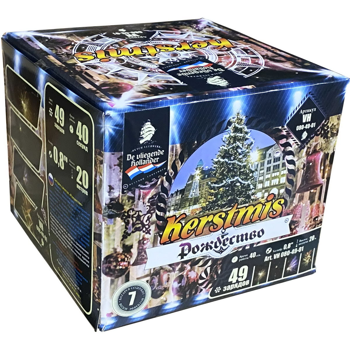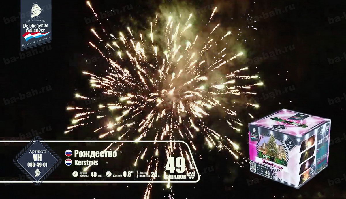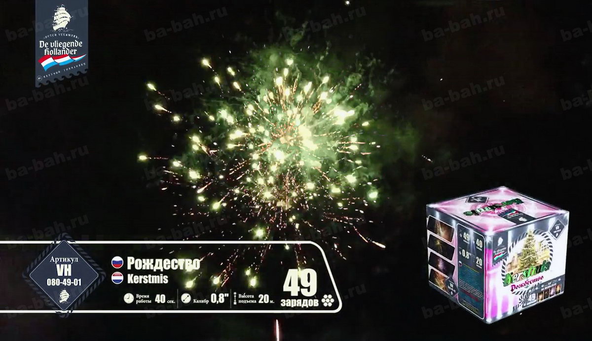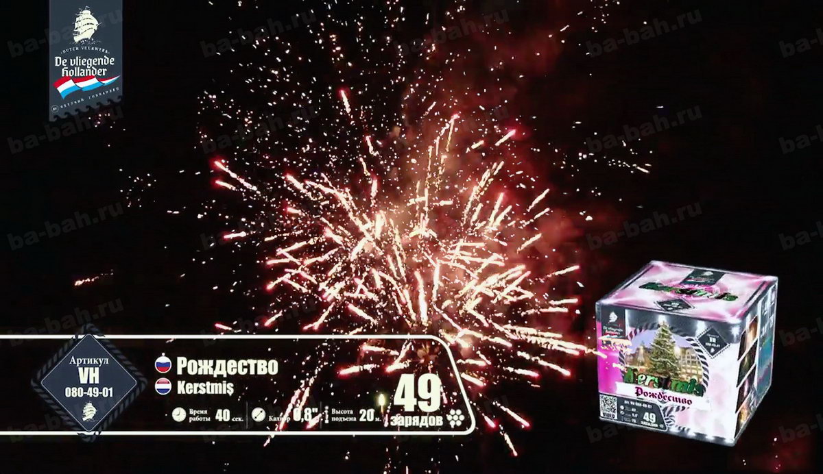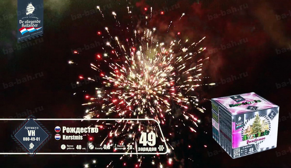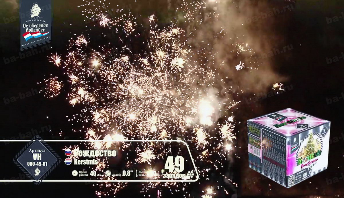 Ему бы чуть больше залпов, и фейерверк "Рождество" мог претендовать на почетное звание супер-фейерверков! Когда запускаешь салют, кажется, что выпустил в небо сразу несколько коробок больших фейерверков. В чем его уникальность? Дело все в том, что наш фейерверк - иностранец, и приехал он из далекой Голландии, где, к сожалению, увидеть и запустить салют можно только в ночь на Рождество. Именно поэтому, он вместил в себя практически все самые незабываемые и невообразимые сочетания эффектов. Разноцветные сферы сменяются мерцающими звездами и, не успевая закончить свое представление, тут же осыпаются треском и россыпями щедрого бриллиантового дождя, в который врываются с писком и шумом множество пиротехнических, забавно виляющих шлейфами, змеек. Этот фейерверк настолько динамичный, шумный и яркий, что Вы еще долго будете находиться под действием этого феерического кабаре!