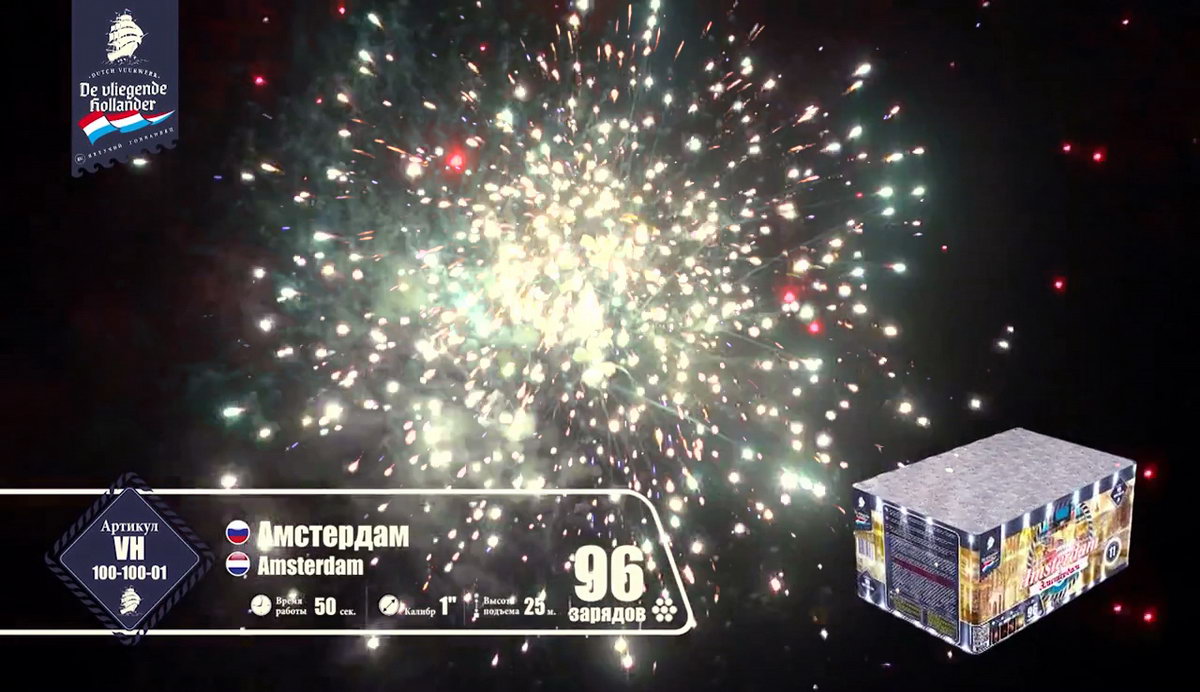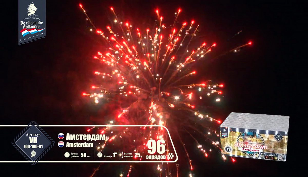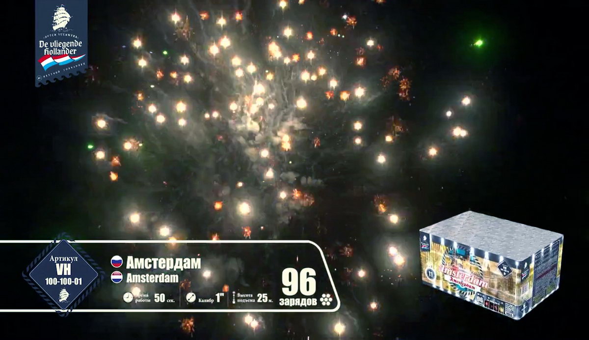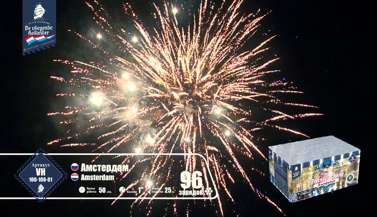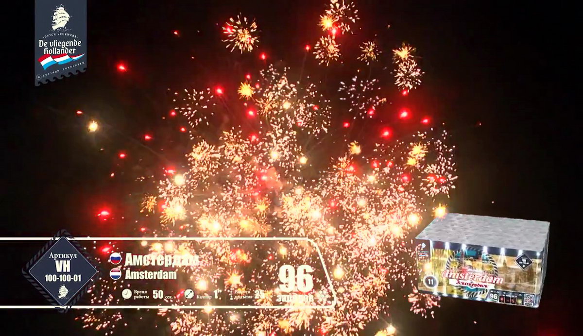 Иностранный хвастун, марка "Летучий Голландец" из далеких Нидерландов, так и норовит привить нам интерес к своей родине. Все расхваливает ее живописные красоты, а теперь и до самой столицы добралась. Посмотрим, насколько интересен в пиротехническом исполнении далекий город Амстердам! Воздушные сферы синих и алых огней, зеленых изумрудов, переходящих в золотое трещащее облако, зеленые, оранжевые и алые драгоценные камни в сочетании с огненными стрелами разлетаются настолько быстро, что не успеваешь перевести дух от предыдущего залпа. Облако нежных мерцающих белоснежных вспышек, жужжащие шмели и золотые огни, множество золотистых стрел с малиновыми огнями, которые разрываются огромным колючим искристым облаком, золотые массивные пальмы с синими звездами. Далее следует необычное сочетание в одной сфере лимонных, синих и розовых огней - воплощение изысканной красоты Амстердама! Алые кометы с трещащими шуршащими хвостами, рыжие огни, переходящие в синее и белоснежное мерцание, алые и синие камни. И это еще не все! Пышные пальмы с разноцветными огнями, превосходные утонченные оранжевые линии с синими глубокими жемчужинами, переходящие в трещащие разрывы и вспышки. Что-то невообразимое будет дальше! Быстрая смена розовых, желтых, синих огней, трещащих мерцающих хвостов алых комет, огненных пальм и мерцающих вспышек, алых крупных заманчивых бусин и пушистое облако золотых россыпей тонких мелких искр! Салют оставляет очень романтичное и гармоничное впечатление. А необычные сочетания красок и форм делают его еще более привлекательным. Пиротехнический привет из голландской столицы на реке Амстел запомнится не хуже, чем визит в этот замечательный европейский город!