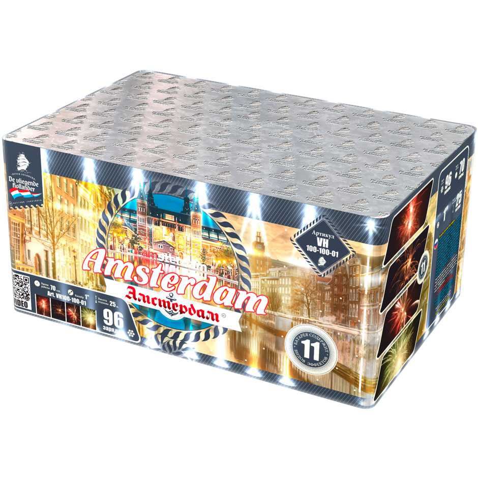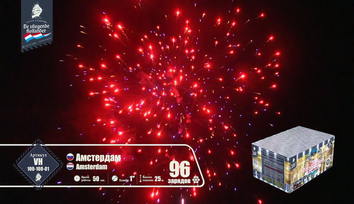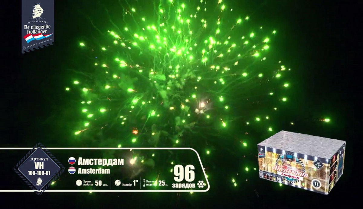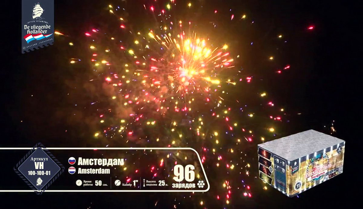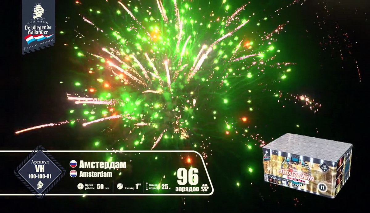 Иностранный хвастун, марка "Летучий Голландец" из далеких Нидерландов, так и норовит привить нам интерес к своей родине. Все расхваливает ее живописные красоты, а теперь и до самой столицы добралась. Посмотрим, насколько интересен в пиротехническом исполнении далекий город Амстердам! Воздушные сферы синих и алых огней, зеленых изумрудов, переходящих в золотое трещащее облако, зеленые, оранжевые и алые драгоценные камни в сочетании с огненными стрелами разлетаются настолько быстро, что не успеваешь перевести дух от предыдущего залпа. Облако нежных мерцающих белоснежных вспышек, жужжащие шмели и золотые огни, множество золотистых стрел с малиновыми огнями, которые разрываются огромным колючим искристым облаком, золотые массивные пальмы с синими звездами. Далее следует необычное сочетание в одной сфере лимонных, синих и розовых огней - воплощение изысканной красоты Амстердама! Алые кометы с трещащими шуршащими хвостами, рыжие огни, переходящие в синее и белоснежное мерцание, алые и синие камни. И это еще не все! Пышные пальмы с разноцветными огнями, превосходные утонченные оранжевые линии с синими глубокими жемчужинами, переходящие в трещащие разрывы и вспышки. Что-то невообразимое будет дальше! Быстрая смена розовых, желтых, синих огней, трещащих мерцающих хвостов алых комет, огненных пальм и мерцающих вспышек, алых крупных заманчивых бусин и пушистое облако золотых россыпей тонких мелких искр! Салют оставляет очень романтичное и гармоничное впечатление. А необычные сочетания красок и форм делают его еще более привлекательным. Пиротехнический привет из голландской столицы на реке Амстел запомнится не хуже, чем визит в этот замечательный европейский город!