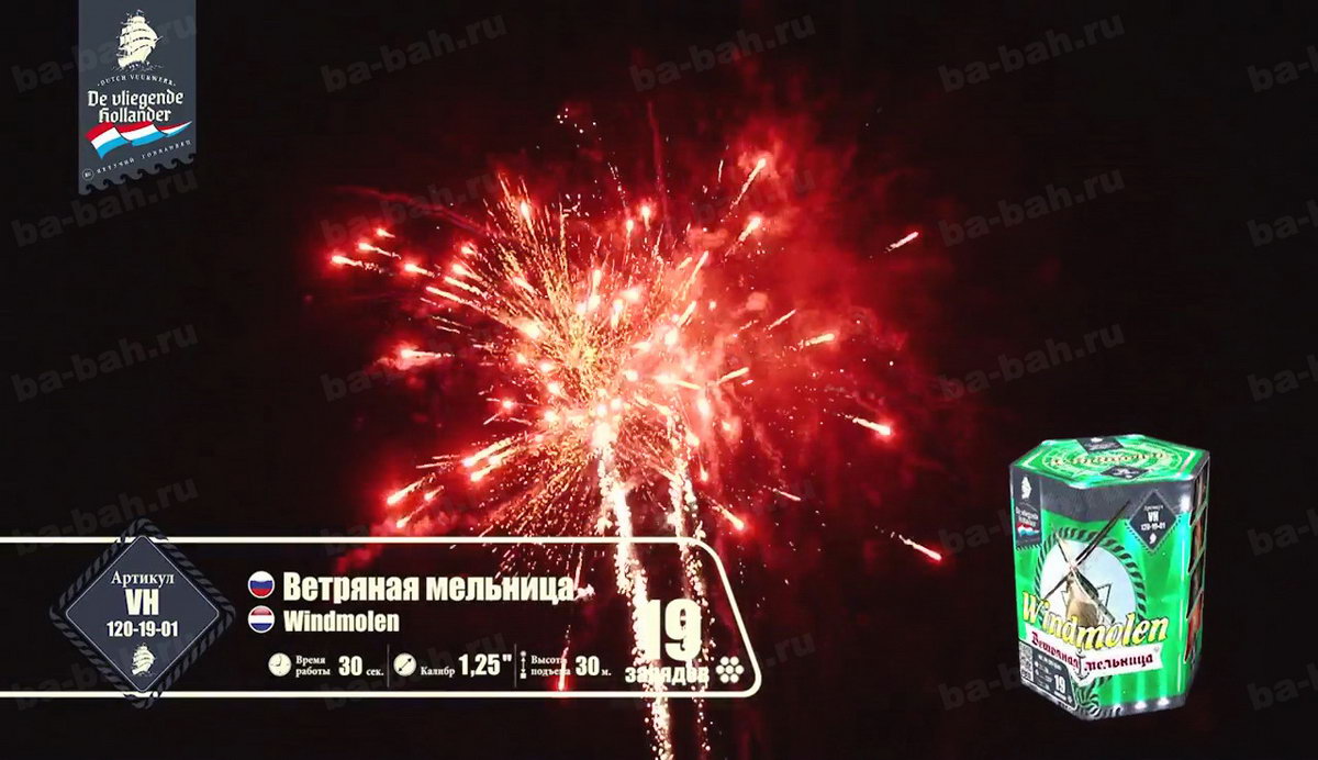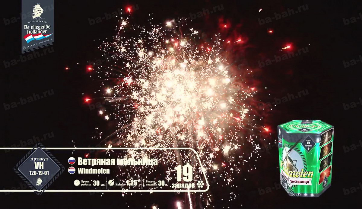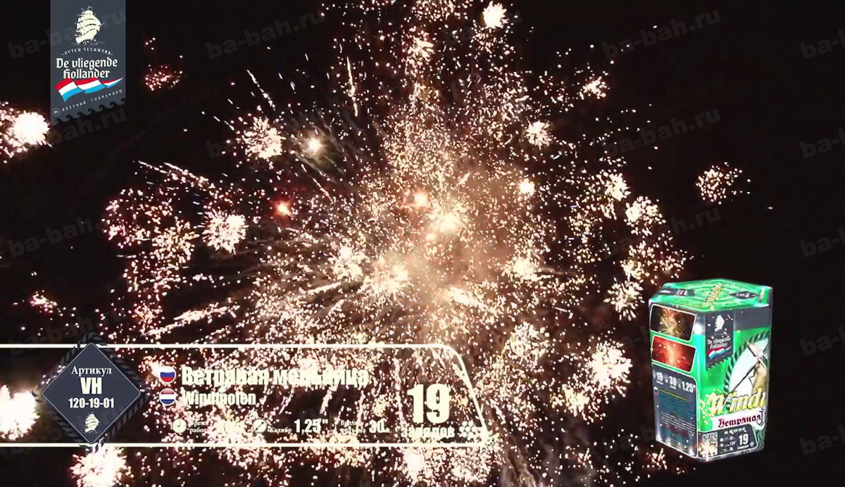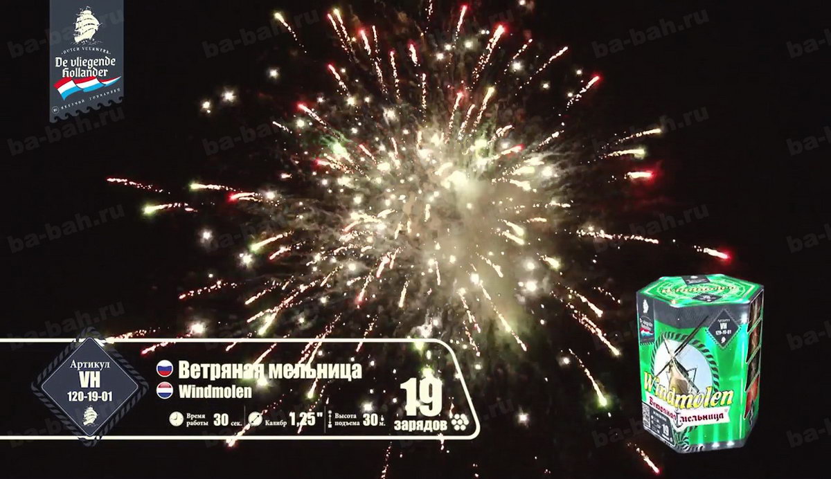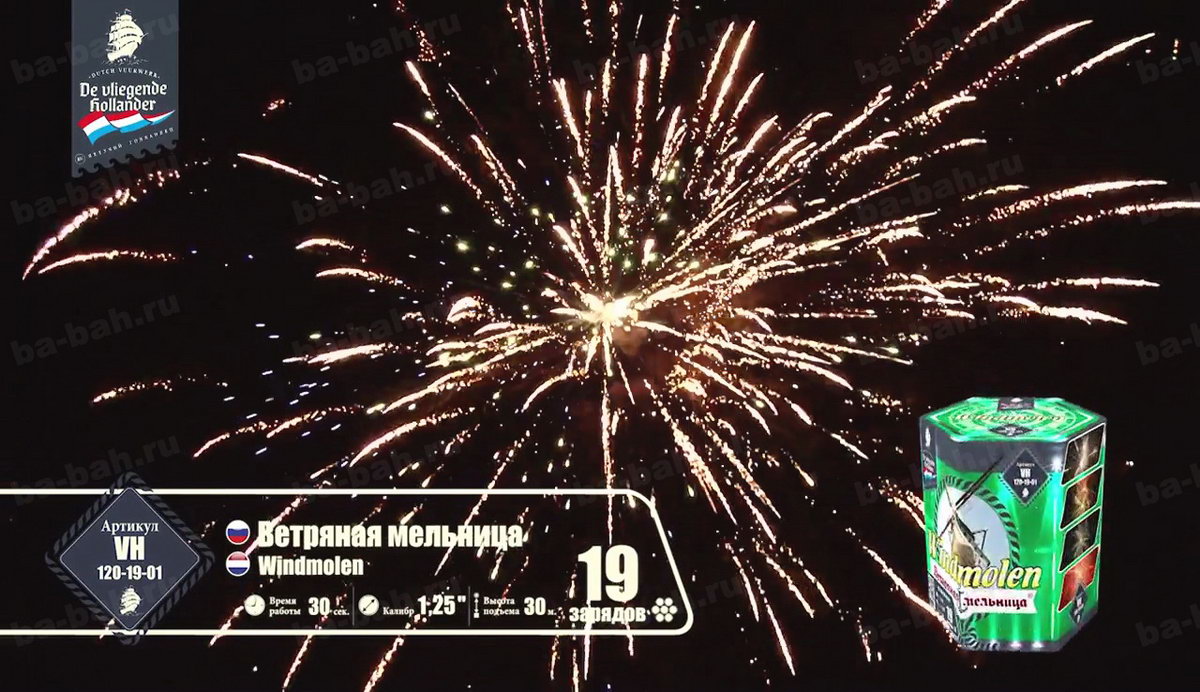 Салют "Ветряная мельница" - это борьба двух стихий: ветра и воды. В Голландии, откуда родом наш фейерверк, применение мельниц, больших и маленьких, используется для удержания под контролем воды с помощью ее перекачивания. Крылья нашей мельницы - золотые тонкие шлейфы, которые оставляют после себя небольшие кометы. Брызги разноцветных огней, как вода, они так и норовят заполнить собой все вокруг. Шумные искры, трещащие огни напоминают морской прибой - воспоминание о славном морском прошлом Голландии, а вспыхивающие нежные звезды, как отражение бликов яркого солнечного свет на водной глади. Изящные юркие змейки, словно водные потоки, так и пытаются обойти мельничные преграды, юлят и упираются в крылья золотых комет. Эта мельница - не простая, она надежно охраняет ночную небесную равнину от взбалмошных пиротехнических проказников.