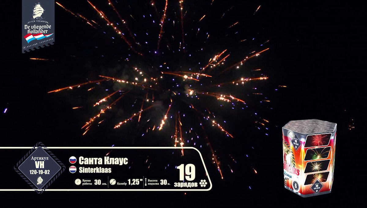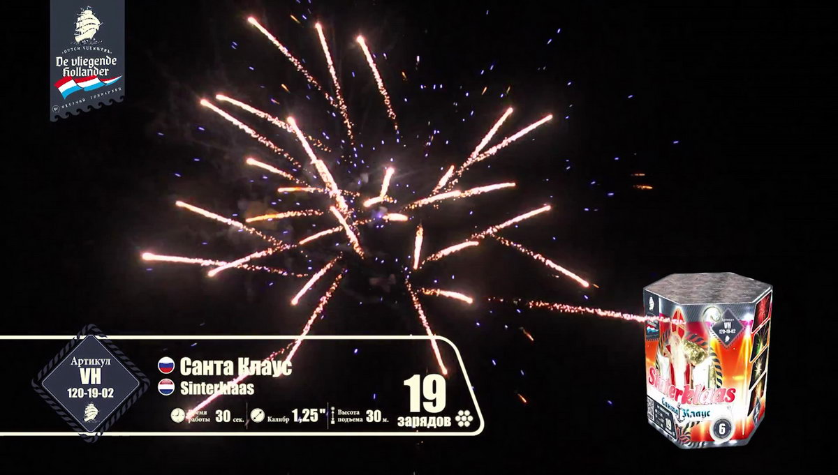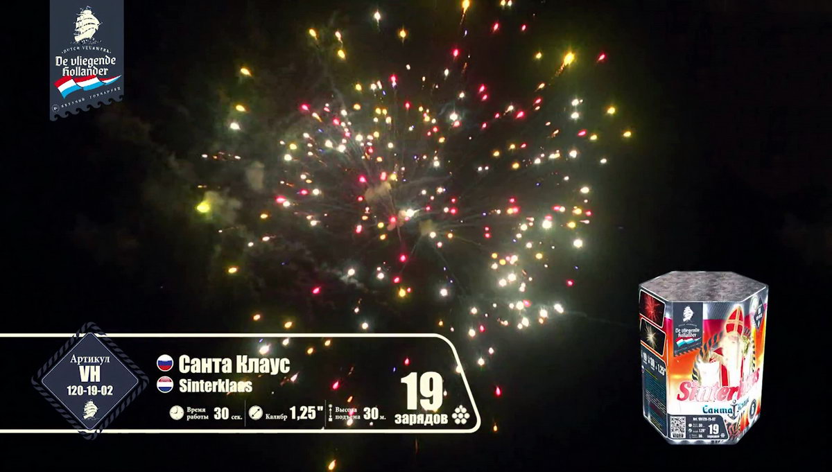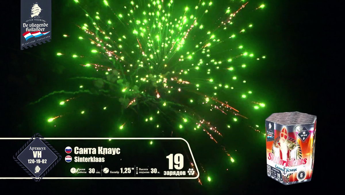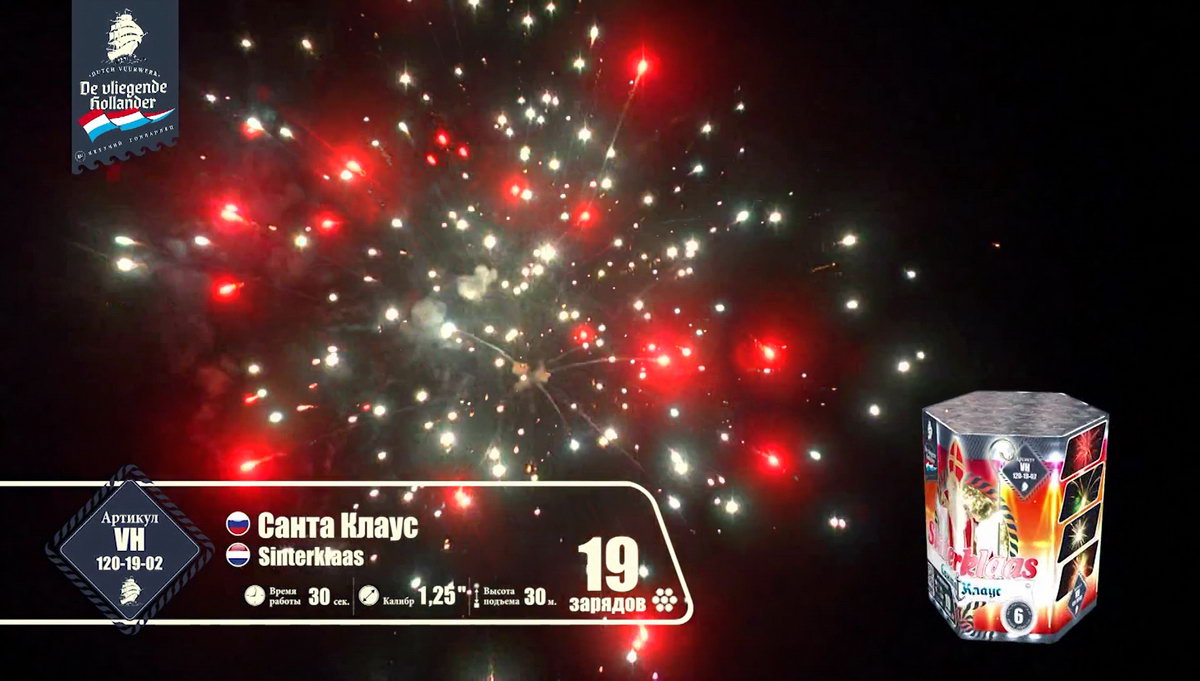 Фейерверк "Санта-Клаус" - щедрый и яркий! Когда смотришь на него, то складывается ощущение, будто из мешка вытряхнули море сверкающих подарков и раскидали по ночному небу. Конечно же, здесь присутствуют любимые цветовые сочетания Санта-Клауса - красный и зеленый, и рассыпано по элементам много серебра и золота. Без них никуда! Искрятся белоснежные хризантемы, расцветая в зеленых лепестках звезд, вспыхивают яркие синие каменья, роскошными сферами расцветают невероятные фантастические пионы. Заключительным залпом еще раз расцветут пионы, на этот раз в королевском синем и алом цвете и растворятся в белых звездных мерцающих облаках!