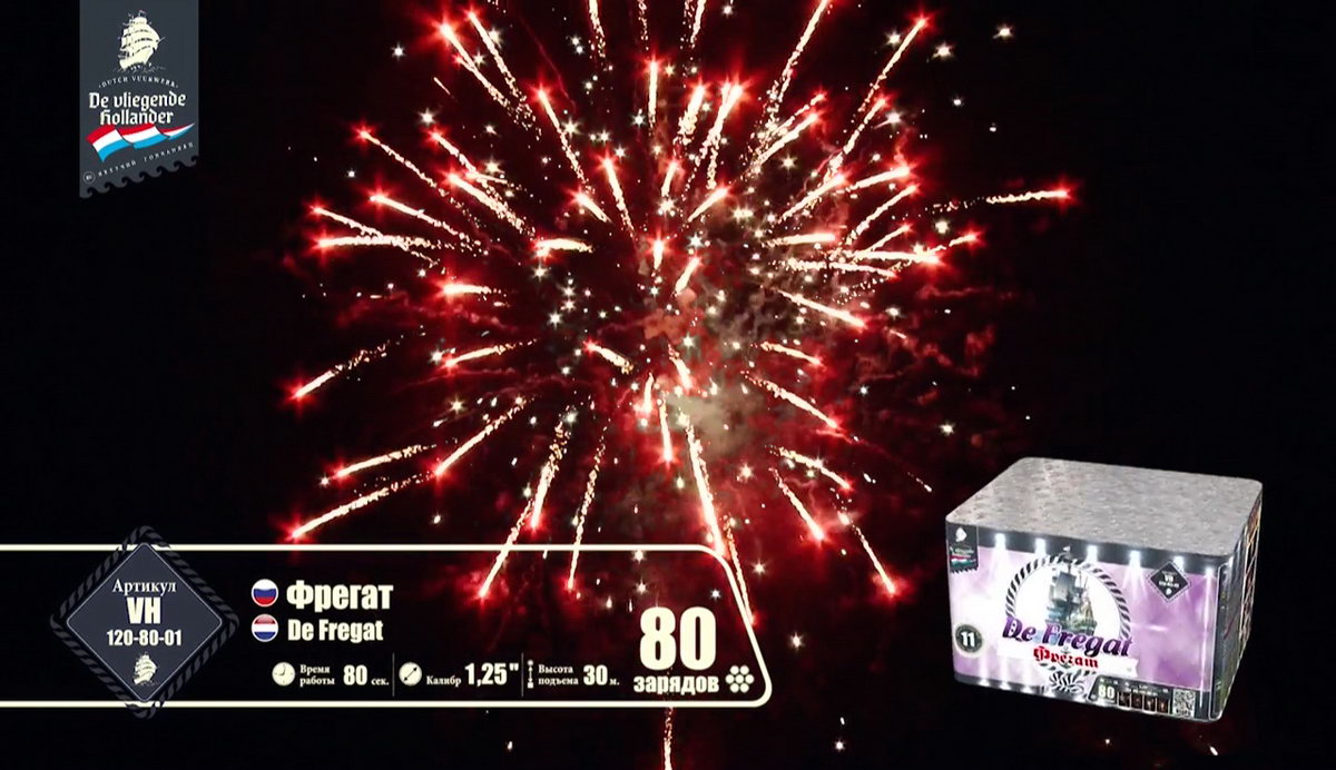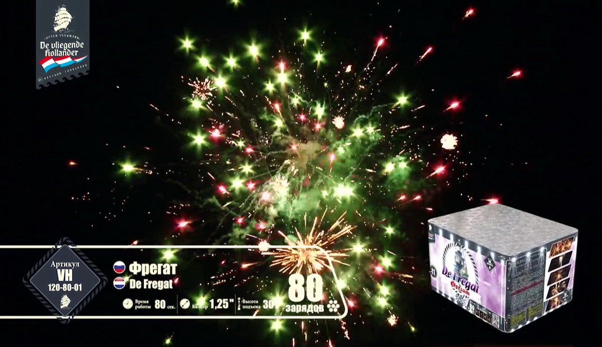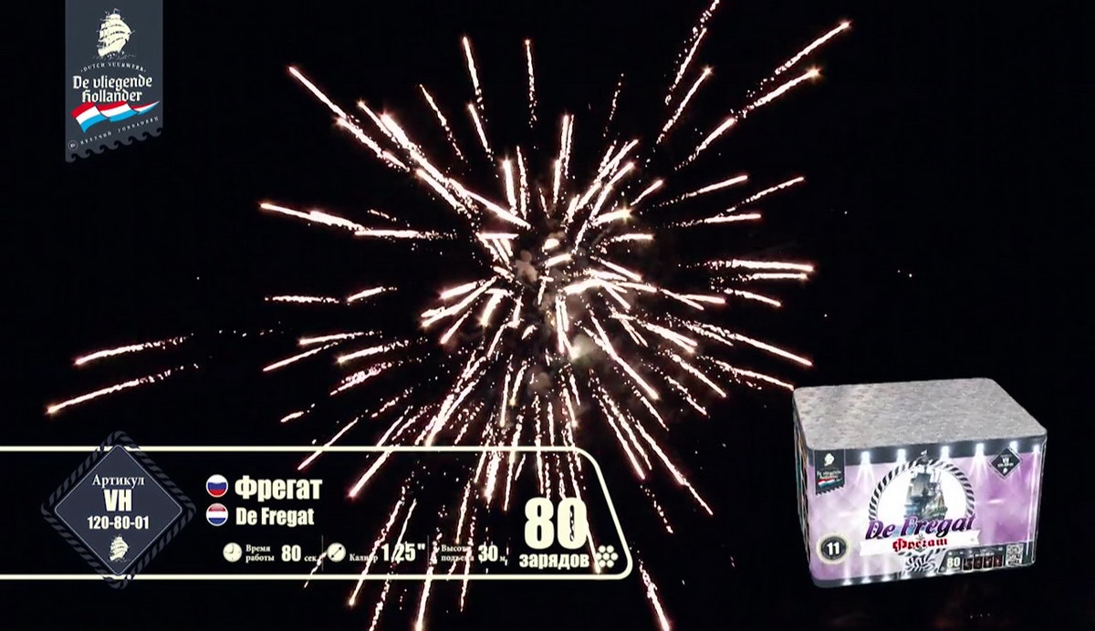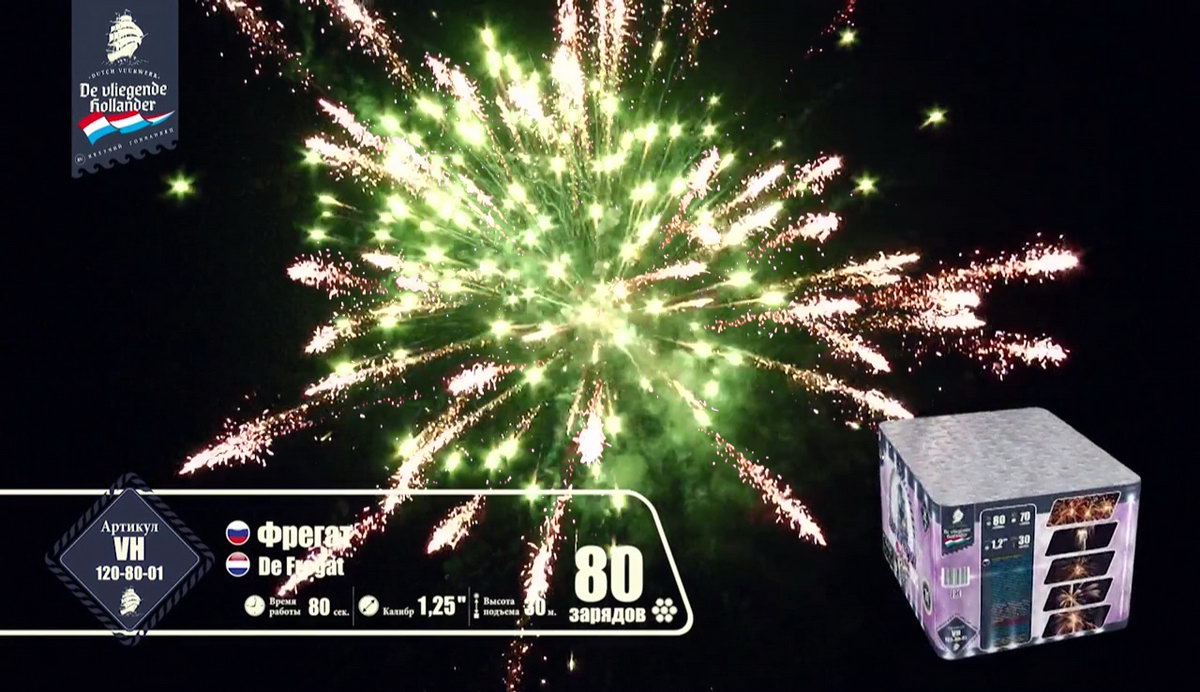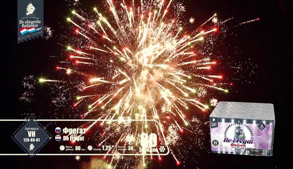 Мощный, но шустрый трехмачтовый "Фрегат" поднял паруса, закатил в трюмы чугунные пушки, просушил порох и подкатил ядра, и теперь готов к выполнению секретного задания, которое ему было приказано выполнить мастерами морской обороны и пиротехнического дела. Отправимся с ним в опасную разведку и выясним, чем звездные пиротехнические светила хотят завоевать наши сердца. Но сначала оденем тельняшки, вооружимся биноклями и будем внимательно следить за происходящим. Первыми выходят навстречу паруснику агрессивные алые и зеленые кометы с золотыми небольшими шлейфами, хитро подмигивая мерцающими оранжевыми огоньками. А вот и злобные малиновые и крупные зеленые огни выбрасывают боевые облака перламутровых острых, громко трещащих искр. Сменяют этих шумных негостеприимных жителей малиновые кометы с золотистыми шлейфами и белоснежным мерцанием. А после них можно наблюдать появление букетов ароматных белых лилий, пиротехнических рыбок, которые повисают в небе и мерцают восхитительными звездами. Золотые стрелы сменяются шумными искристыми перламутровыми пальмами и зелеными огнями. А вот и подарки от добродушных жителей неба: букеты с белоснежными и синими цветами и блуждающими огнями. Как же они хороши! И праздничный торжественный салют по прибытии фрегата в порт! Золотые трещащие облака и разноцветные огни зажег для парусника портовый город. Все в его честь, ведь с заданием он справился, ура смелым морякам!