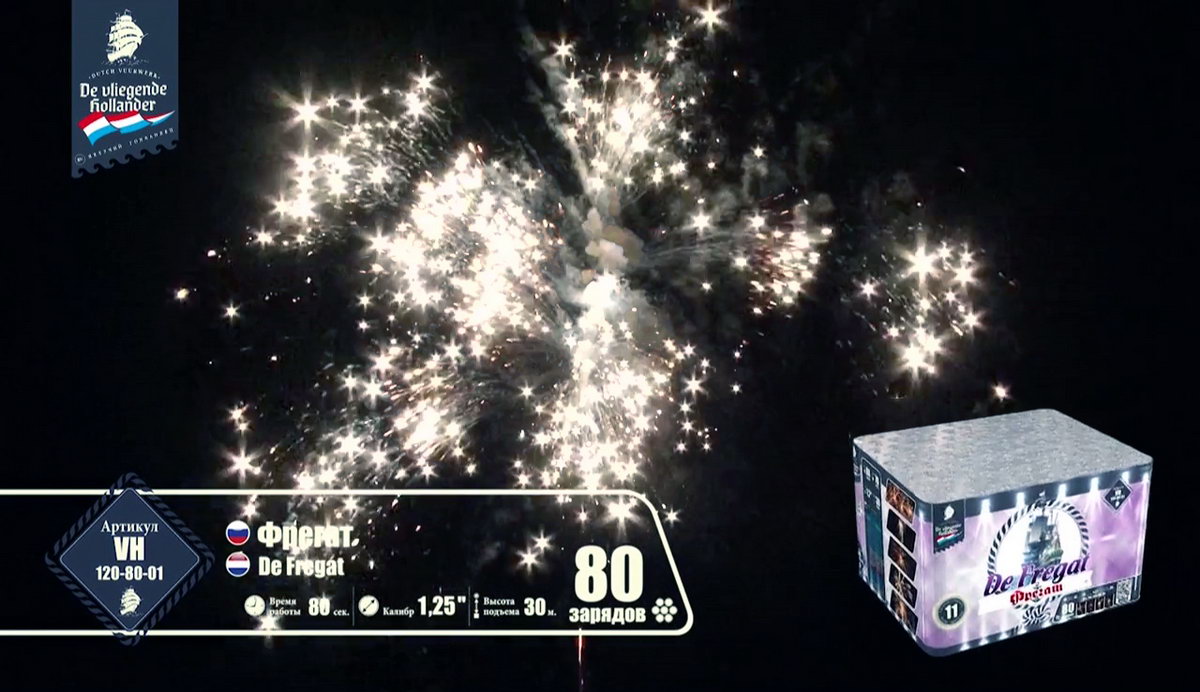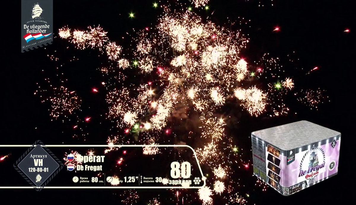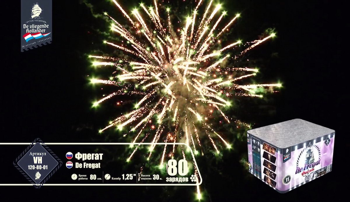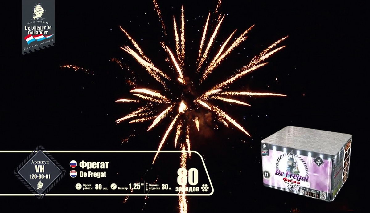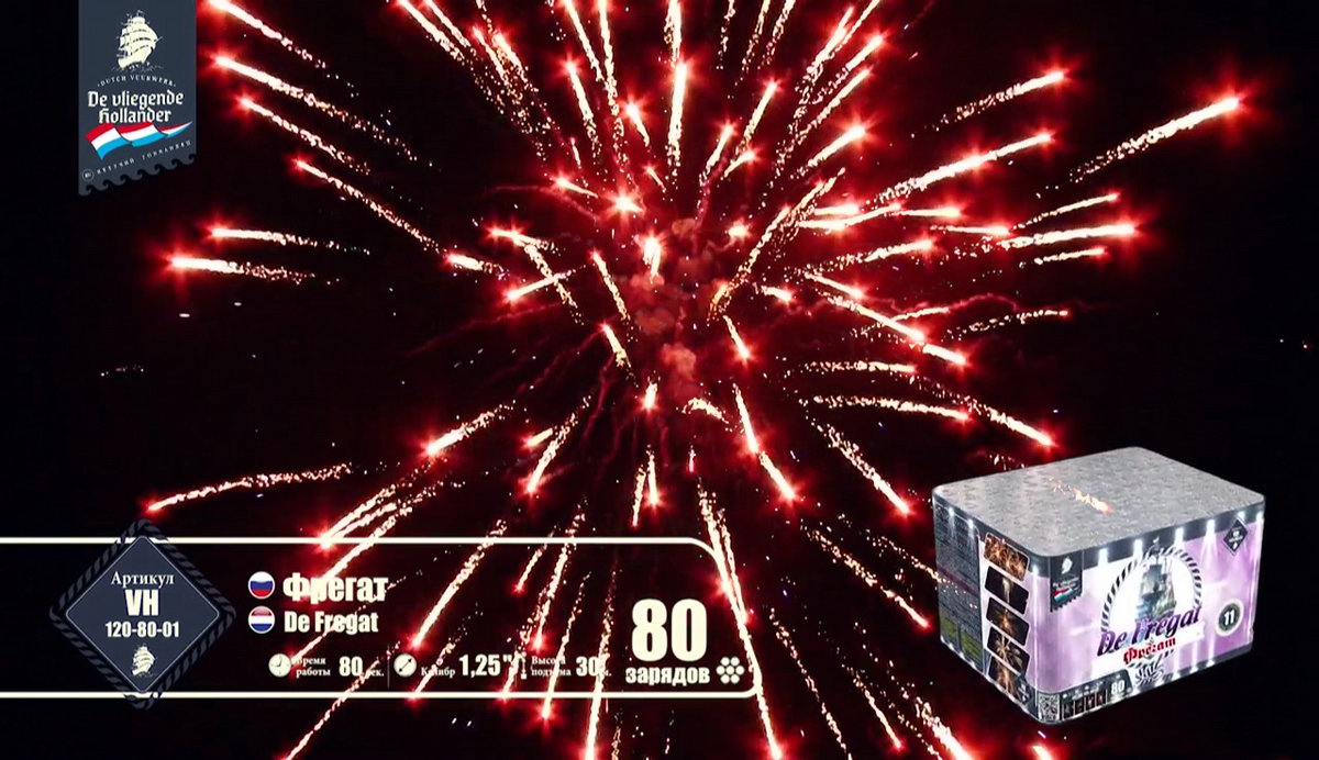 Мощный, но шустрый трехмачтовый "Фрегат" поднял паруса, закатил в трюмы чугунные пушки, просушил порох и подкатил ядра, и теперь готов к выполнению секретного задания, которое ему было приказано выполнить мастерами морской обороны и пиротехнического дела. Отправимся с ним в опасную разведку и выясним, чем звездные пиротехнические светила хотят завоевать наши сердца. Но сначала оденем тельняшки, вооружимся биноклями и будем внимательно следить за происходящим. Первыми выходят навстречу паруснику агрессивные алые и зеленые кометы с золотыми небольшими шлейфами, хитро подмигивая мерцающими оранжевыми огоньками. А вот и злобные малиновые и крупные зеленые огни выбрасывают боевые облака перламутровых острых, громко трещащих искр. Сменяют этих шумных негостеприимных жителей малиновые кометы с золотистыми шлейфами и белоснежным мерцанием. А после них можно наблюдать появление букетов ароматных белых лилий, пиротехнических рыбок, которые повисают в небе и мерцают восхитительными звездами. Золотые стрелы сменяются шумными искристыми перламутровыми пальмами и зелеными огнями. А вот и подарки от добродушных жителей неба: букеты с белоснежными и синими цветами и блуждающими огнями. Как же они хороши! И праздничный торжественный салют по прибытии фрегата в порт! Золотые трещащие облака и разноцветные огни зажег для парусника портовый город. Все в его честь, ведь с заданием он справился, ура смелым морякам!