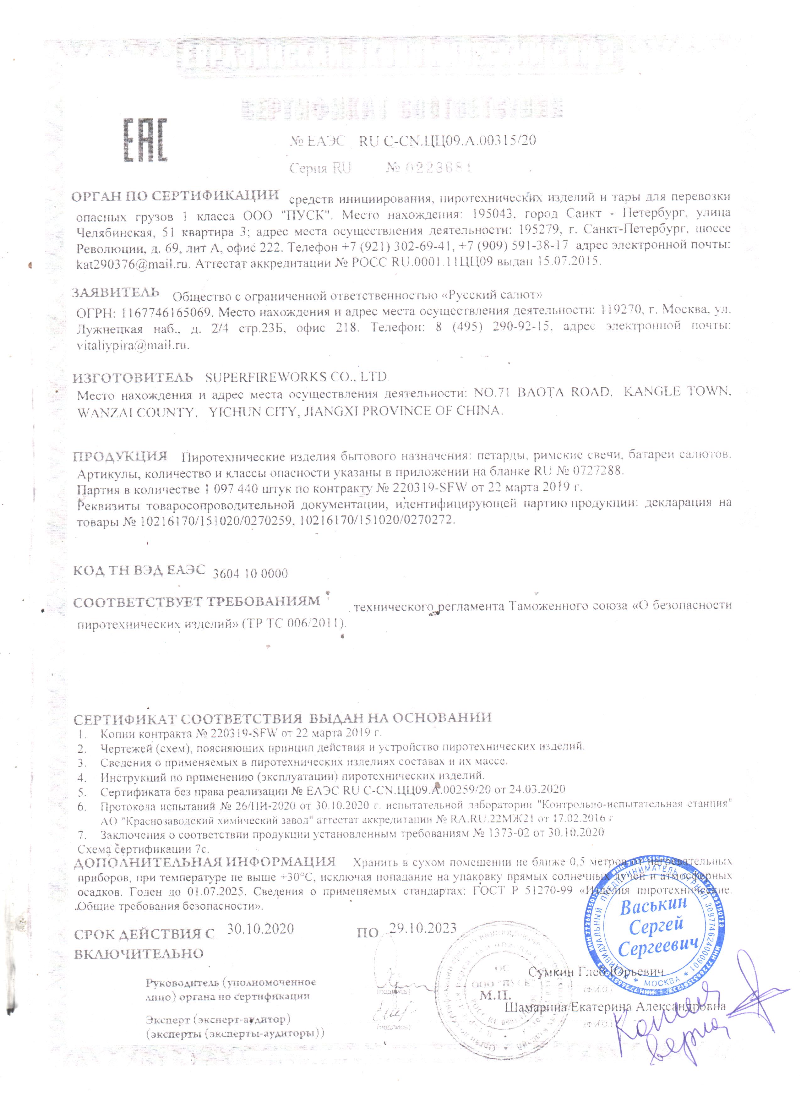 Магазин фейерверков ББ-Салют предоставляет гарантию на весь ассортимент интернет-магазина и розничных магазинов ББ-Салют! Мы торгуем пиротехникой самых лучших, проверенных торговых марок. Все изделия сертифицированы для продажи на территории России и имеют актуальный срок годности.