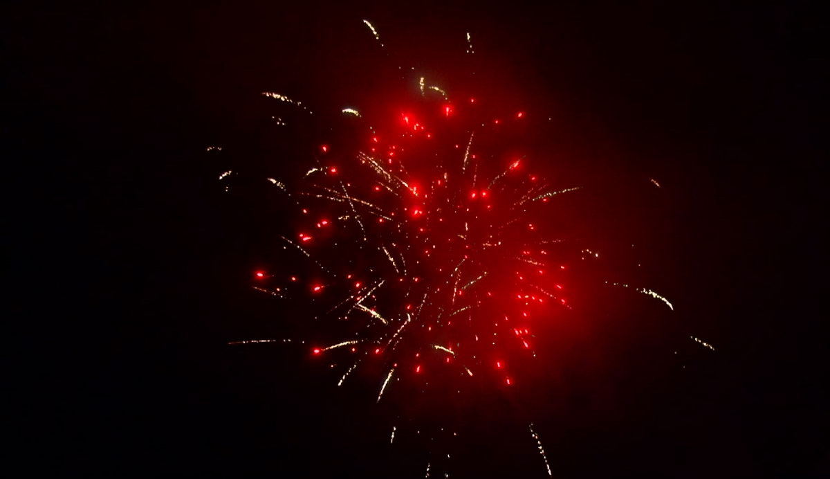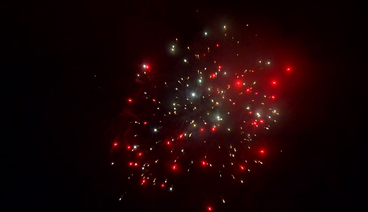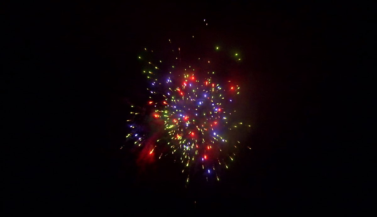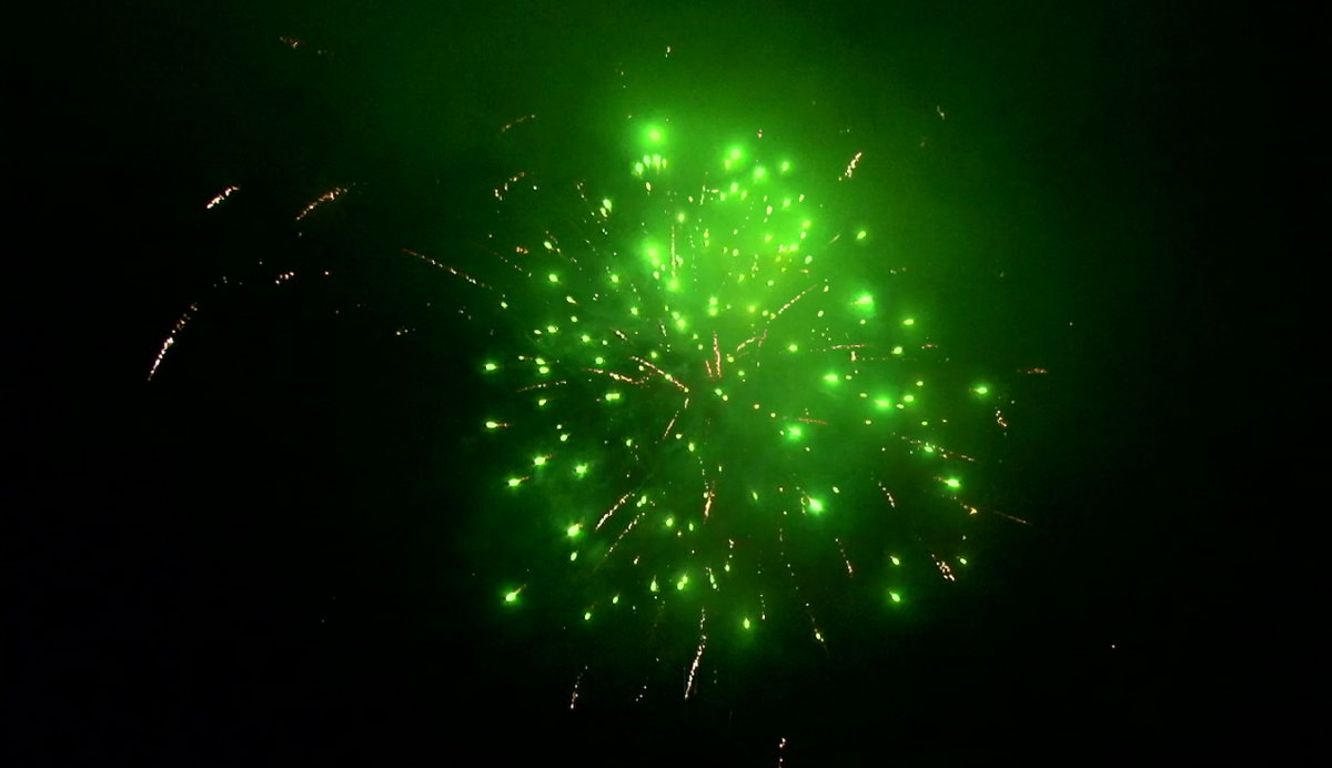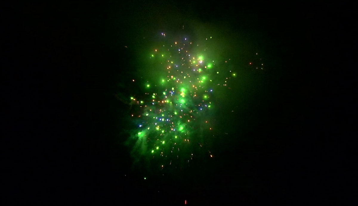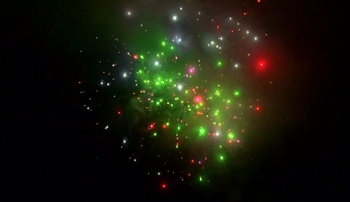 1. Множество серебряных ниспадающих нитей (парча) и красные звезды. 2. Множество серебряных ниспадающих нитей (парча) и зеленые звезды. 3. Множество золотых ниспадающих нитей (парча), красные звезды и треск. 4. Множество золотых ниспадающих нитей (парча), зеленые звезды и треск. 5. Красно-белая мерцающая сфера (пион). 6. Фиолетово-зелено-красная мерцающая сфера (пион). 7. Красно-синяя сфера (пион) и облако треска (трещащий дождь). 8. Зелено-желтая сфера (пион) и облако треска (трещащий дождь). 9. Зелено-сине-золотая мерцающая сфера (пион). 10. Сине-красно-зеленая мерцающая сфера (пион). 11. Свистящие змейки. 12. Красно-сине-желтая сфера (пион) и облако треска (трещащий дождь).