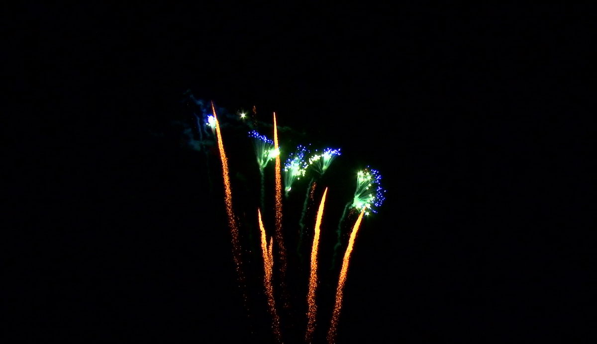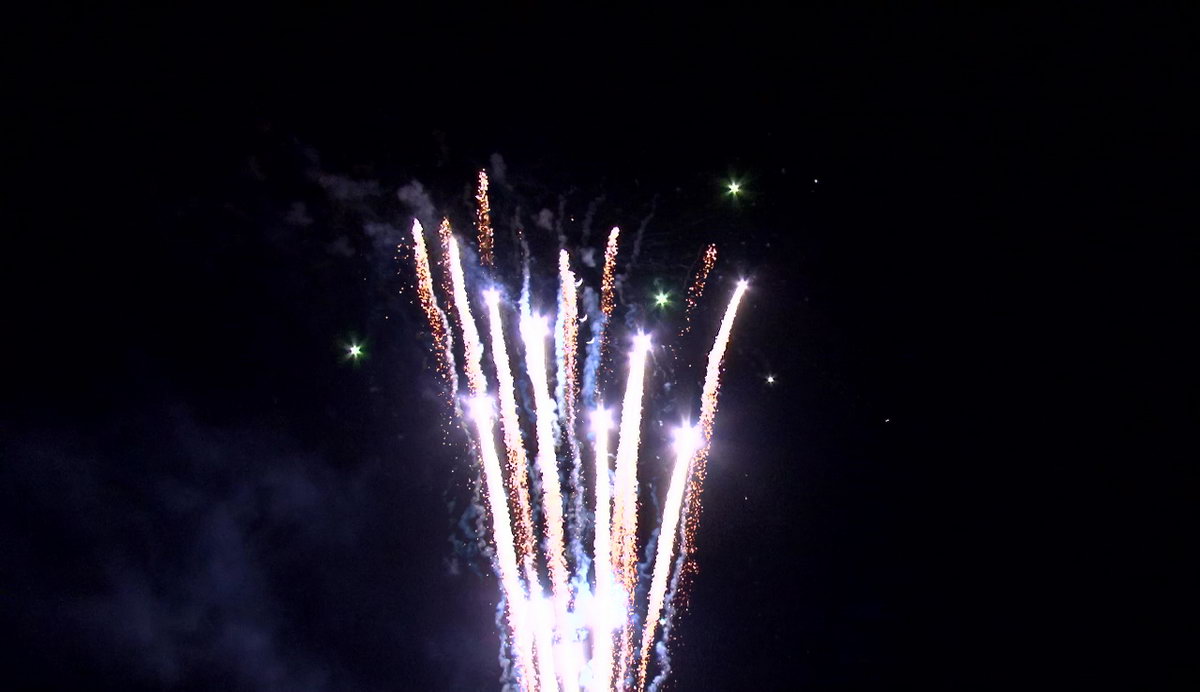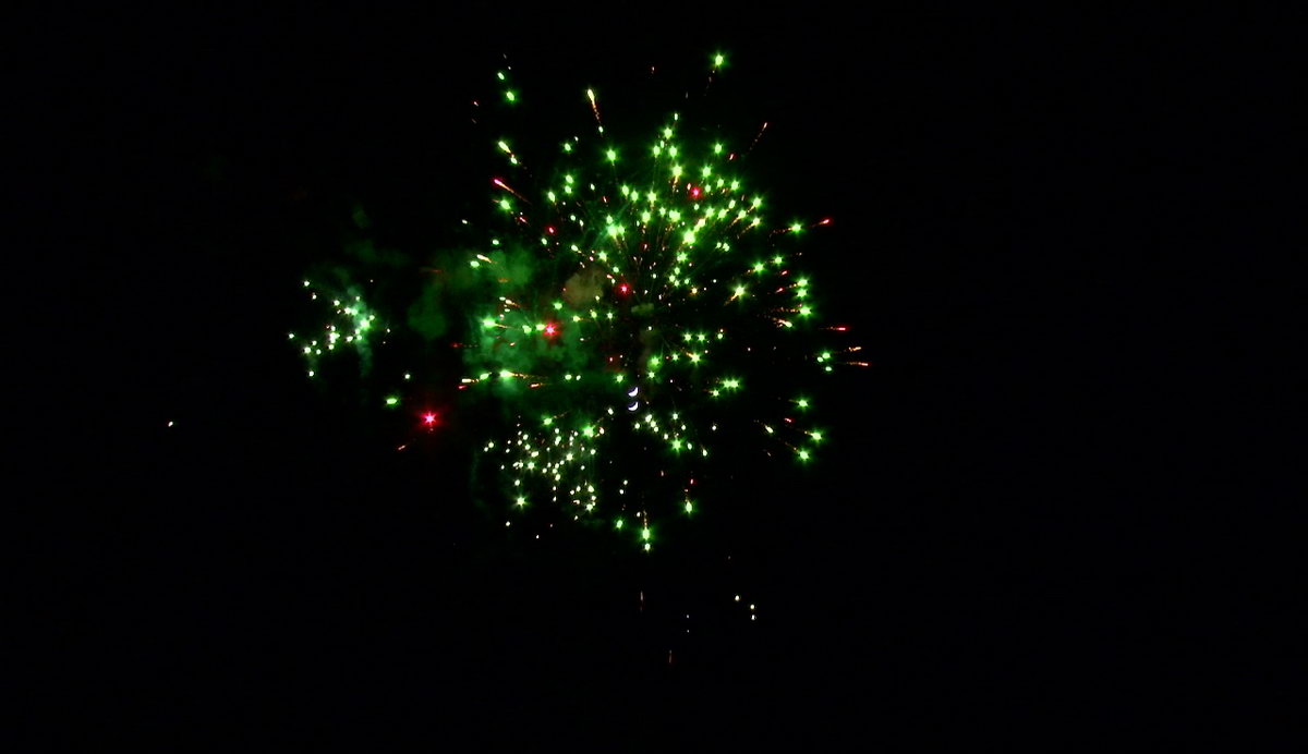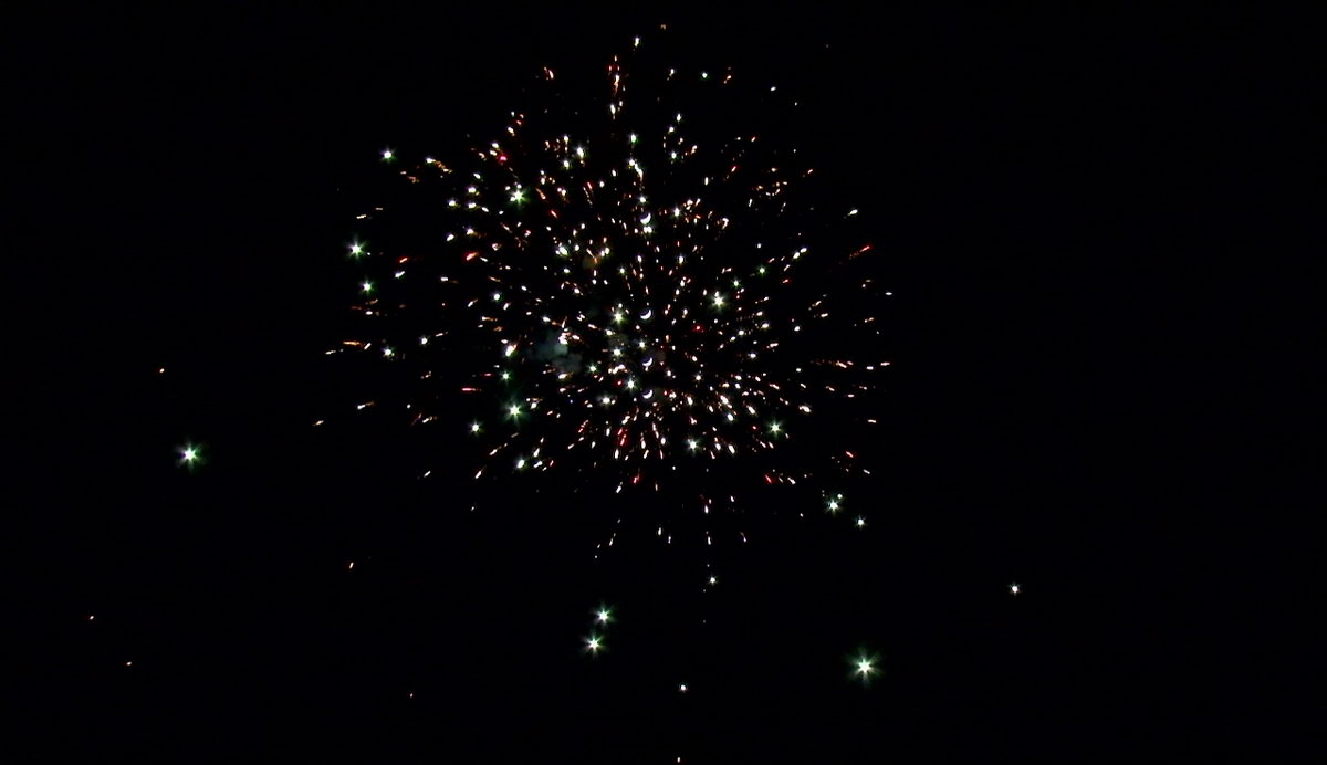 1. Сфера из красного мерцания и белого мерцания. 2. Веер Z-формы: Серебряные кометы. 3. Красно-белая мерцающая сфера (пион). 4. Веер: Золотые кометы и зелено-синие букеты падающих звезд (падающие листья). 5. Зелено-красная мерцающая сфера (пион). 6. Красно-синяя сфера (пион) и треск. 7. Трещащая комета разрывается облаком треска (трещащая хризантема).