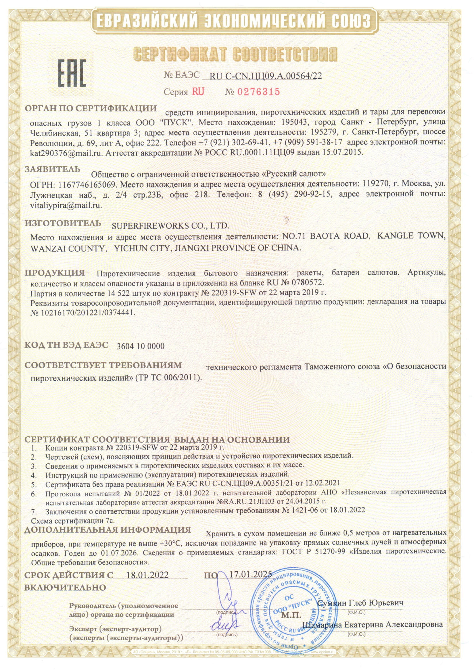 Магазин фейерверков ББ-Салют предоставляет гарантию на весь ассортимент интернет-магазина и розничных магазинов ББ-Салют! Мы торгуем пиротехникой самых лучших, проверенных торговых марок. Все изделия сертифицированы для продажи на территории России и имеют актуальный срок годности.