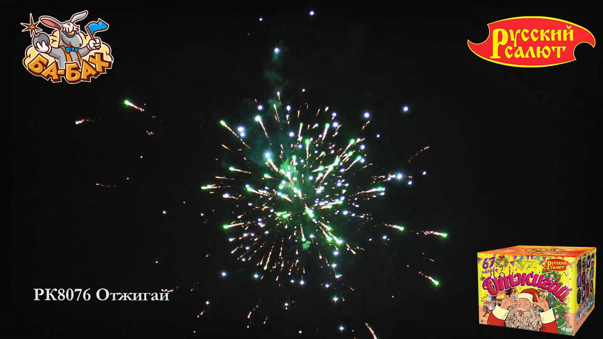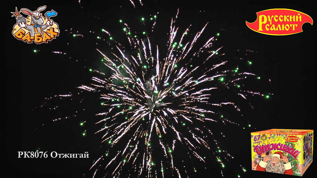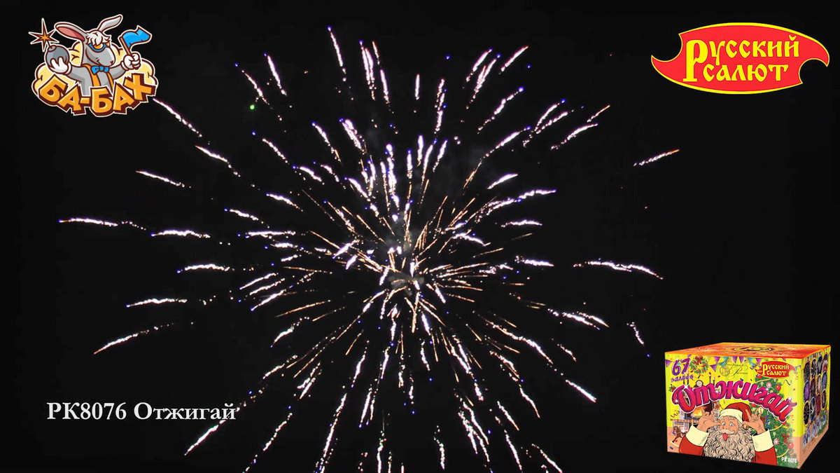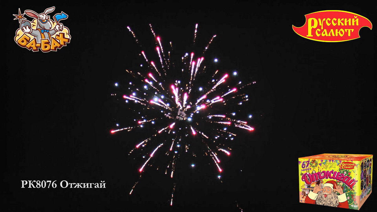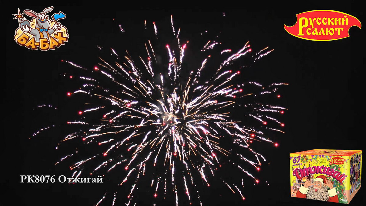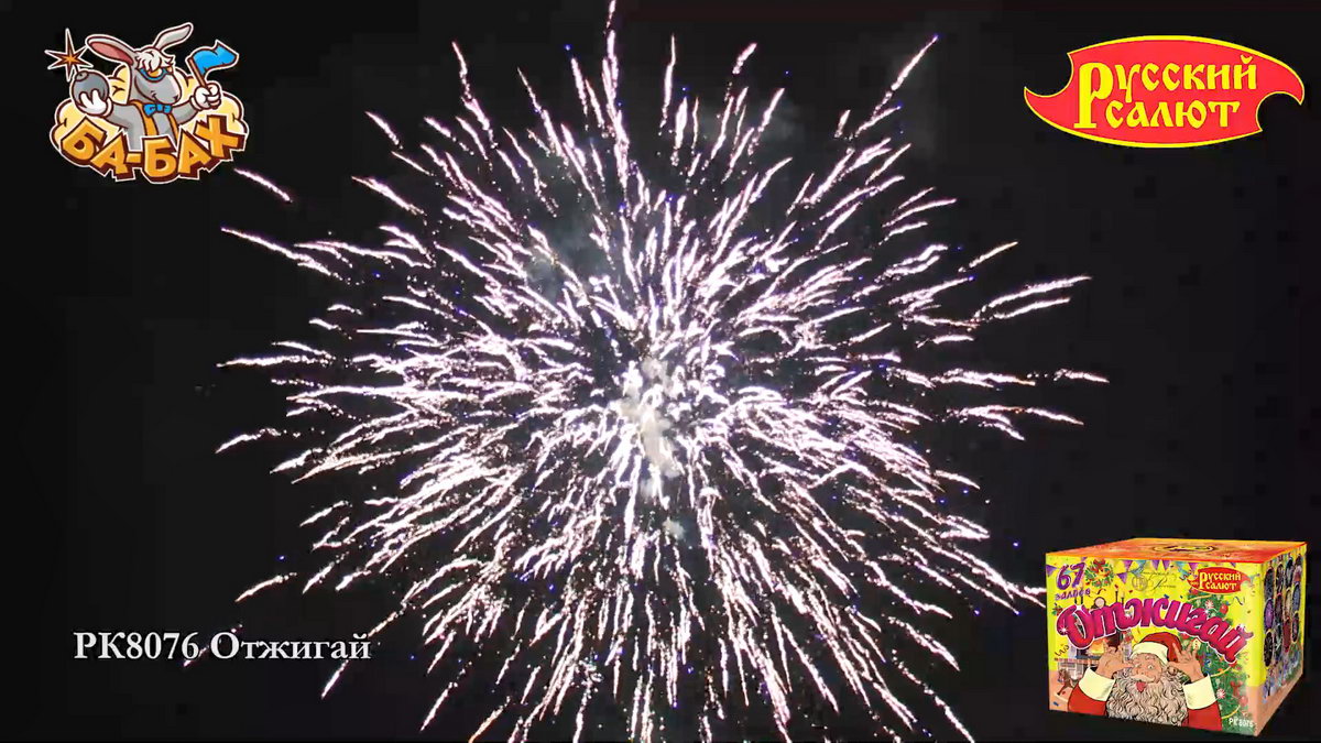 Фейерверк "Отжигай" после запуска продолжается более 60 секунд. Он вместил в себя 67 залпов, которые последовательно, один за одним сменяют друг друга на высоте 55 метров. В этом салюте использованы самые необычные оттенки, которые веют волшебством, магией и таинственностью! Изумительно смотрятся хвосты разного цвета в сочетании с белыми мерцающими огнями. Не смогут остаться без внимания и букеты из жемчужин розового, синего и красного цветов, которые затем превращаются в иву с падающими вниз стробами. Удивительно раскрываются спиральные и свистящие форсы. Особенно впечатляет завершающий залп, когда разноцветный пион трансформируется в громко трещащую хризантему с мерцающими звездами.