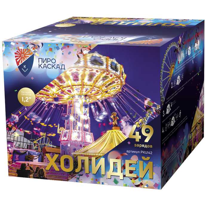 Салют "Холидей" - это настоящие каникулы для ваших глаз, притом в любое время года. Красивое пиротехническое представление, разворачивающееся в ночи - лучшее, что может отвлечь Вас от ежедневной суеты и монотонной работы. В этом жарком пиротехническом представлении собраны самые волшебные и необычные эффекты и цветовые решения! Удивите своих близких этим замечательным шоу, фейерверком калибра 1,2 дюйма на 49 зарядов - это воспоминание останется в памяти на долгие годы!