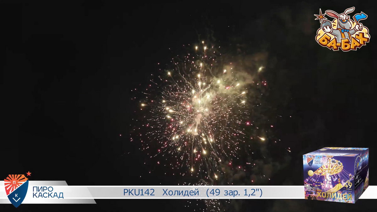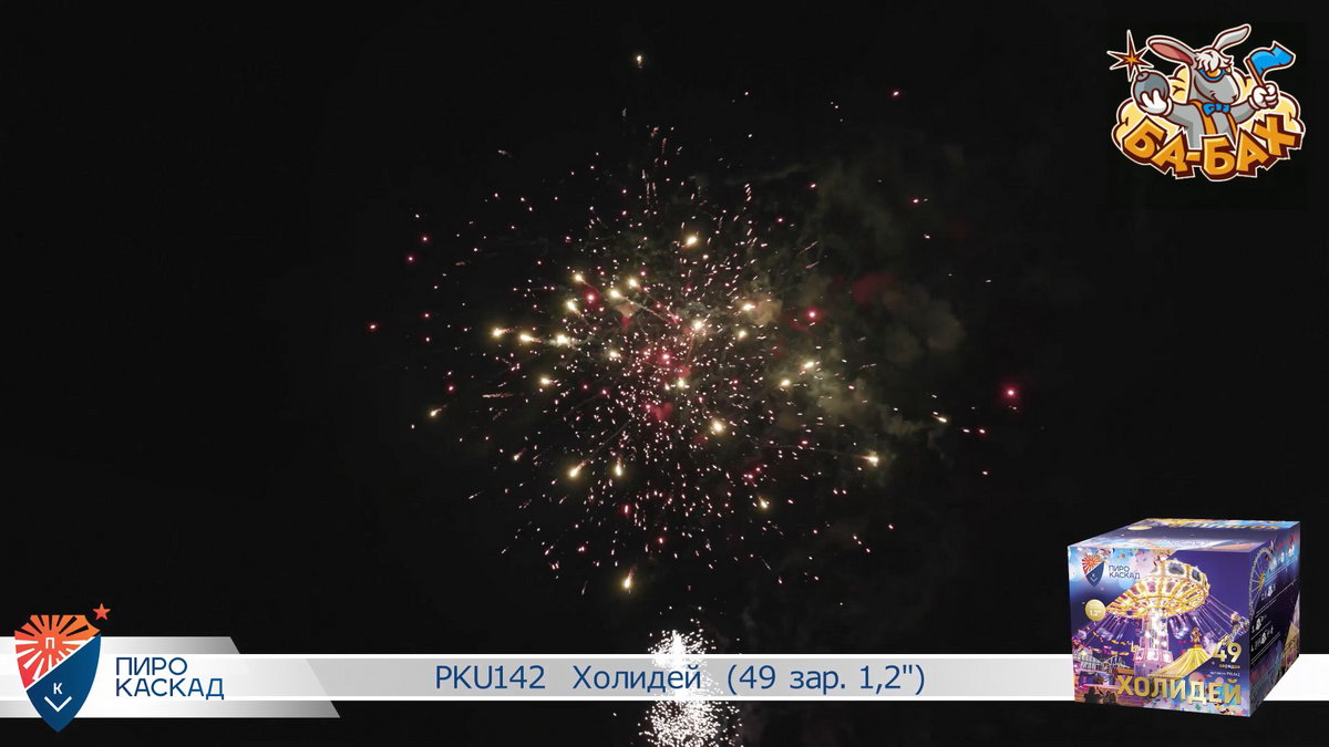 В фейерверке "Холидей" 49 красочных выстрелов, продолжительностью 30 секунд. Фейерверк двухуровневый, что добавляет эффектности происходящему: на нижнем уровне - вспыхивают яркие бурачные эффекты, это непрерывный поток серебристых искр и ярких огней, так называемый "парковый фейерверк". На верхнем, высотном уровне - мерцание огней под оглушительный треск разрывающихся звезд, розовых и синих жемчужин. И завершение салюта - одновременное появление свистящих змеек, мерцающих огней, трескающих искр. Красивейшее шоу "Холидей" поразит даже самого искушенного любителя салютов!