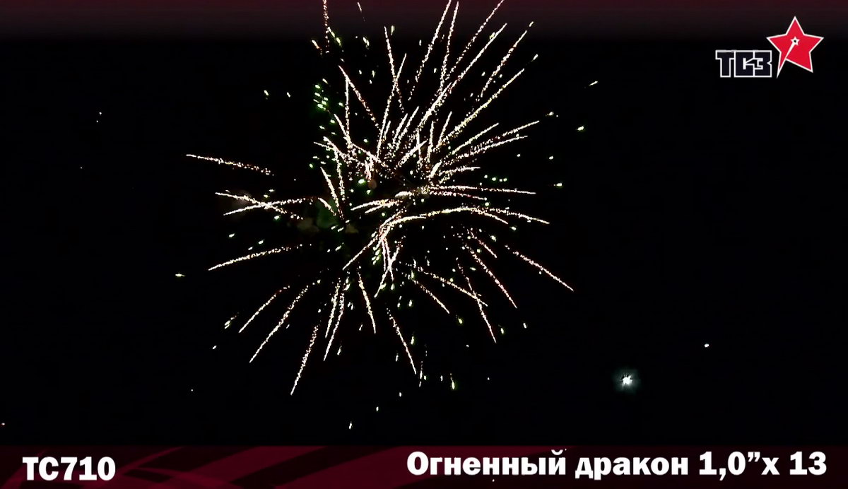 В этом фейерверке мощные разноцветные кометы взрываются сферами искрящихся золотых форсов и мерцающим серебром огненных ручьев! Этот 13-ти залповый малыш низвергает фиолетовые и золотые искры, словно настоящий огнедышащий дракон! Но не стоит его пугаться - он ручной и, закончив свое представление, мирно исчезает в темноте ночи, оставив после себя легкий треск и исчезающие в небе золотые искорки.