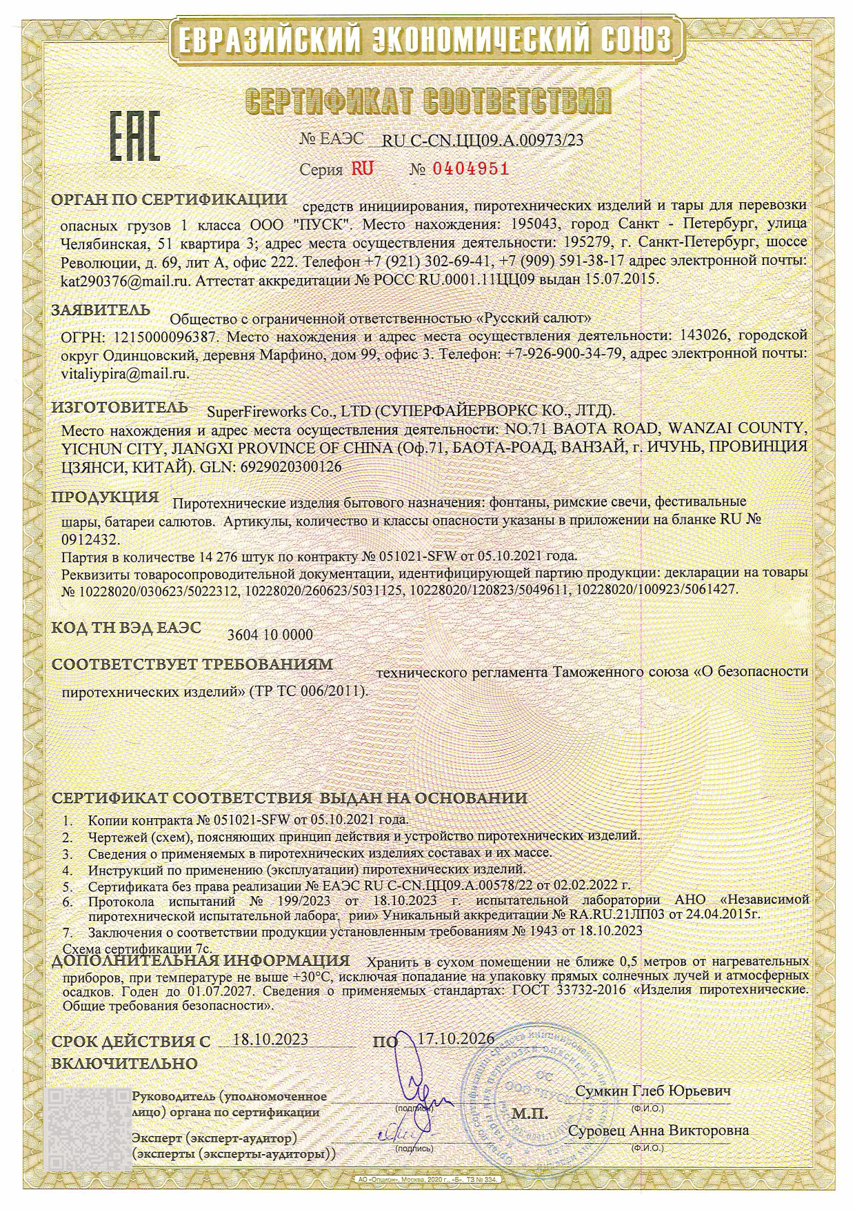 Магазин фейерверков ББ-Салют предоставляет гарантию на весь ассортимент интернет-магазина и розничных магазинов ББ-Салют! Мы торгуем пиротехникой самых лучших, проверенных торговых марок. Все изделия сертифицированы для продажи на территории России и имеют актуальный срок годности.