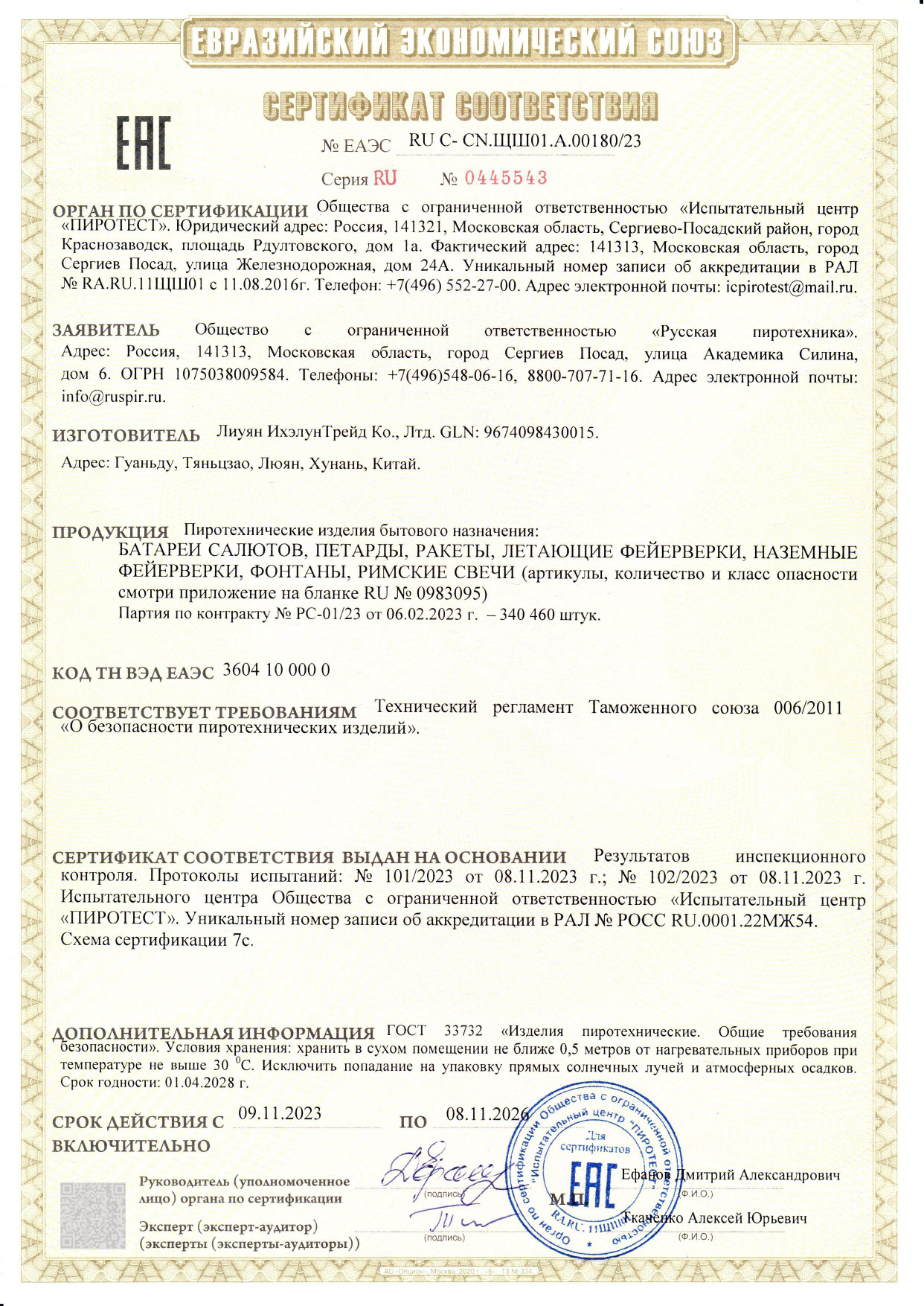 Магазин фейерверков ББ-Салют предоставляет гарантию на весь ассортимент интернет-магазина и розничных магазинов ББ-Салют! Мы торгуем пиротехникой самых лучших, проверенных торговых марок. Все изделия сертифицированы для продажи на территории России и имеют актуальный срок годности.