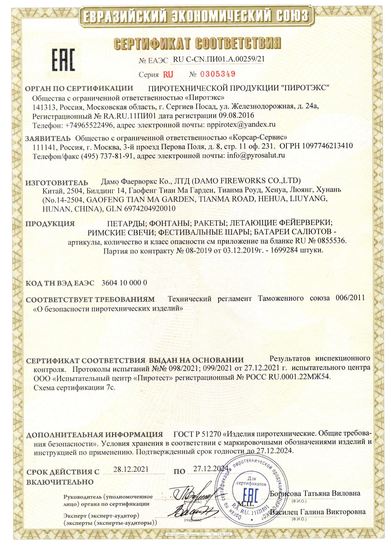 Магазин фейерверков ББ-Салют предоставляет гарантию на весь ассортимент интернет-магазина и розничных магазинов ББ-Салют! Мы торгуем пиротехникой самых лучших, проверенных торговых марок. Все изделия сертифицированы для продажи на территории России и имеют актуальный срок годности.