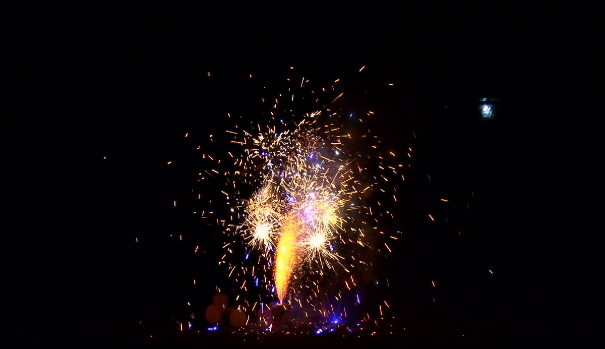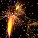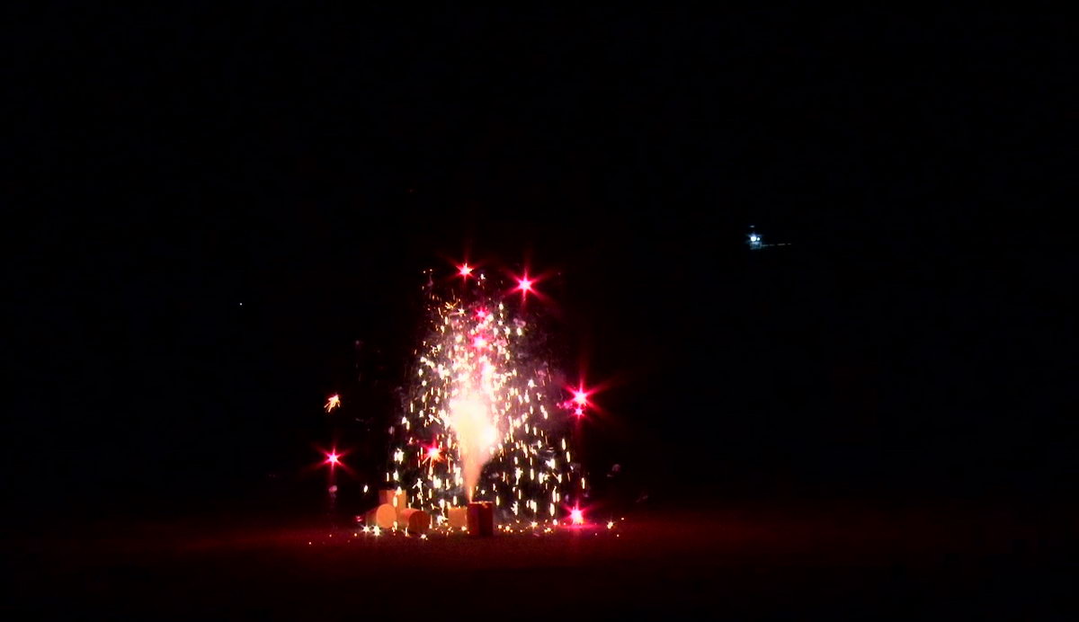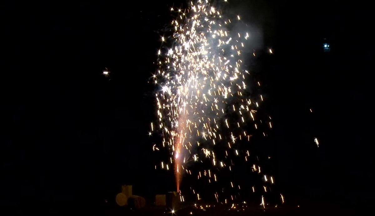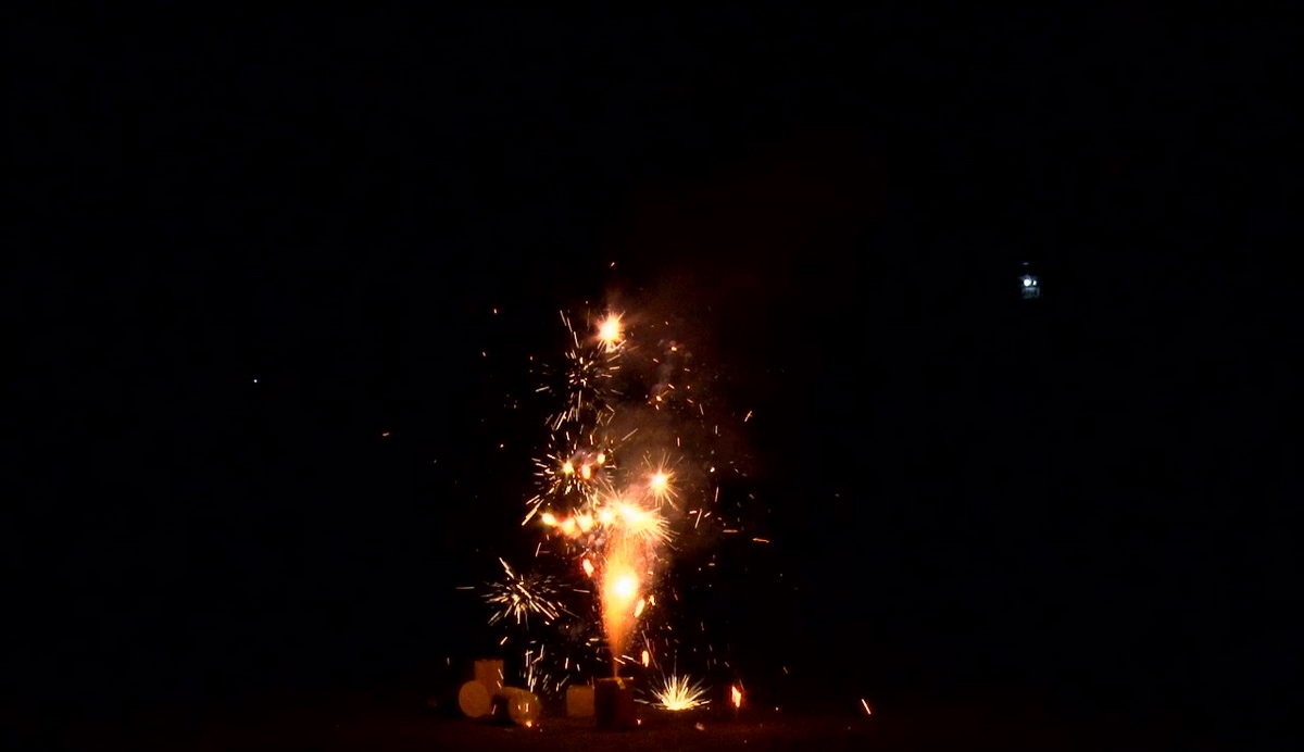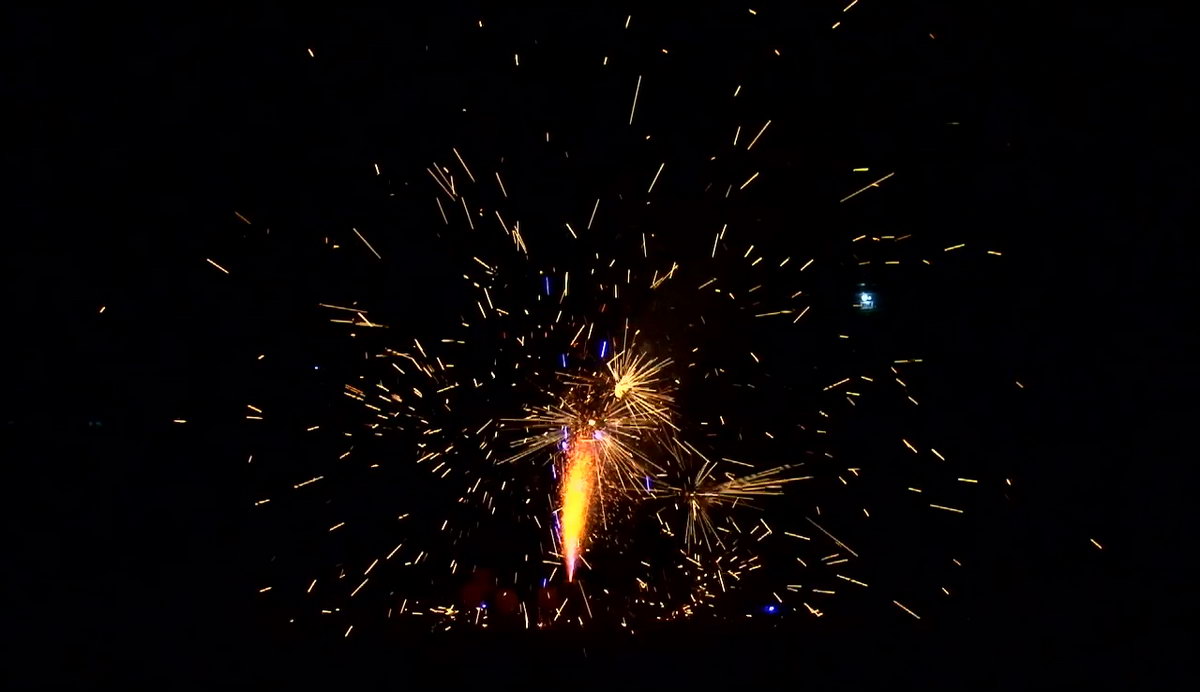 - Вертушка или "солнце" - сложная конструкция из уличных фонтанов, закрепленных в форме колеса. Фонтаны прикреплены под небольшим углом; выбрасывая искры, они создают тягу - и колесо крутится, формируя ослепительно сияющее огненное кольцо. Это очень эффектный фейерверк, но смонтировать его довольно сложно. Потребуется вертикальная поверхность типа столба или прямого дерева: в открытом поле такой фонтан не запустишь. К вертушке обычно прикладывается толстый гвоздь; правда, его довольно легко потерять - тогда подойдет обычный, длиной 12-15 см. Прибиваете вертушку к столбу через отверстие в центре. Убедитесь в надежности прибитого гвоздя! Также необходимо обеспечить зону безопасности как минимум 10 метров, т.к. в процессе вращения искры могут отлетать на довольно большое расстояние.