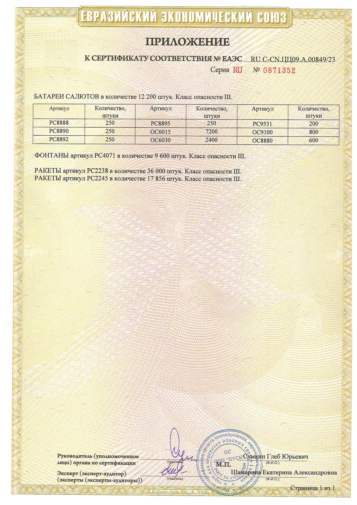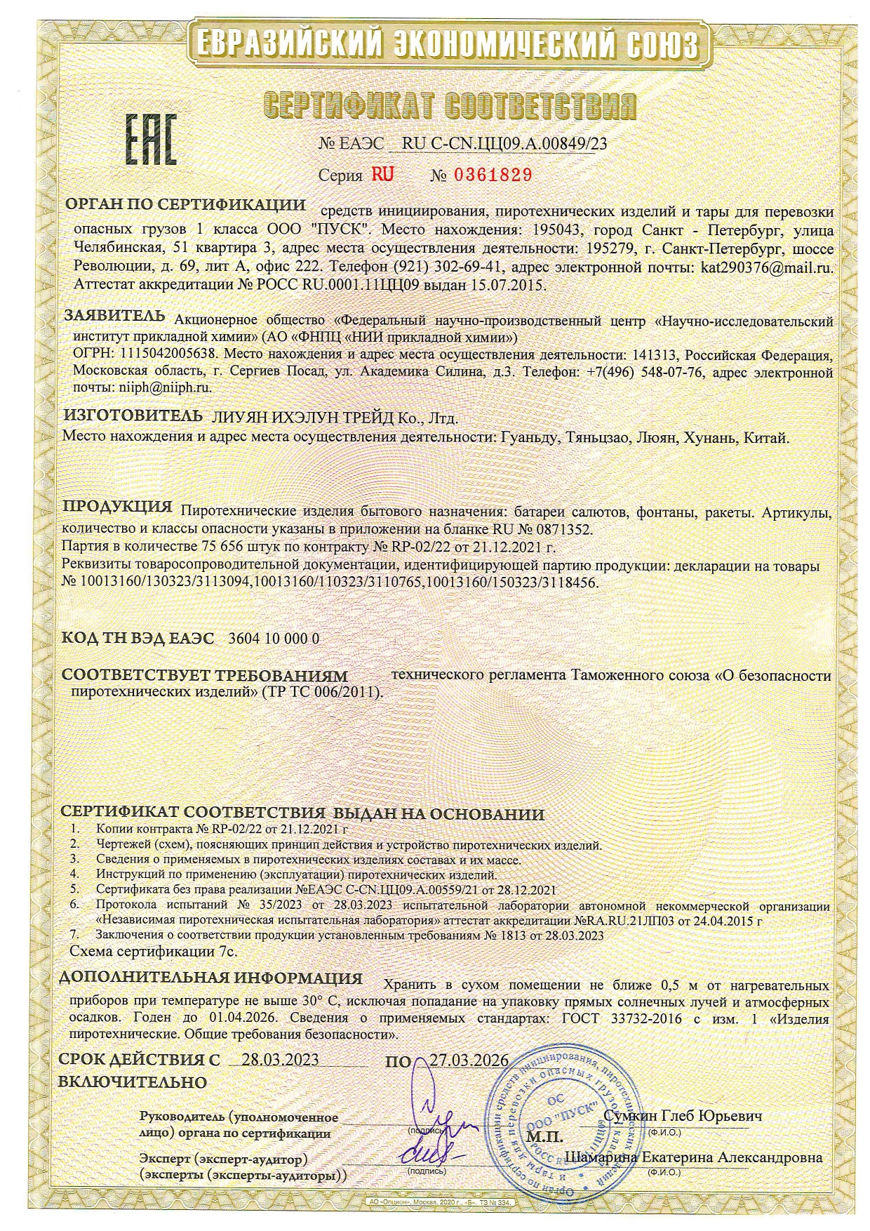 Магазин фейерверков ББ-Салют предоставляет гарантию на весь ассортимент интернет-магазина и розничных магазинов ББ-Салют! Мы торгуем пиротехникой самых лучших, проверенных торговых марок. Все изделия сертифицированы для продажи на территории России и имеют актуальный срок годности.