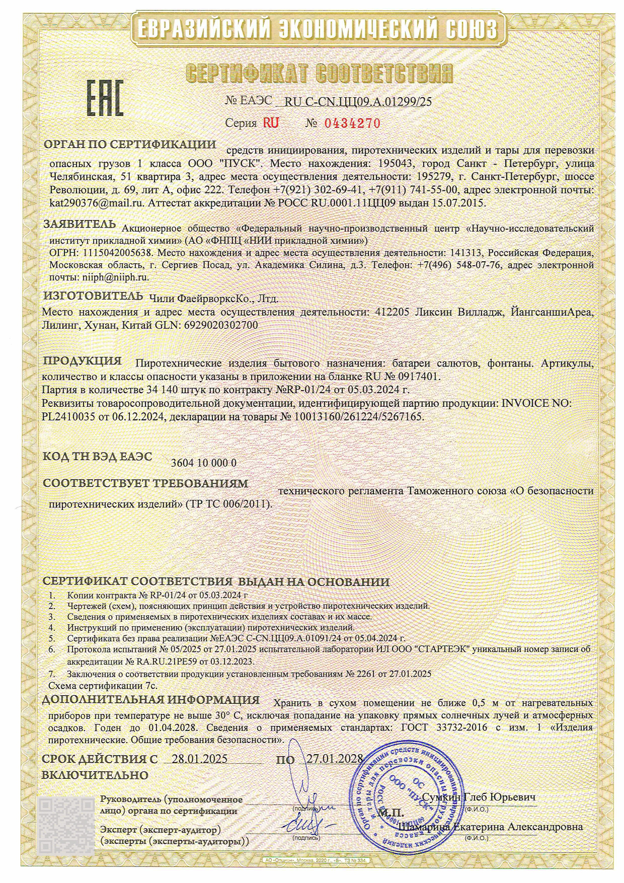 - Обратите внимание, что при покупке фейерверка Вы несете полную ответственность за соблюдение правил хранения, техники безопасности и инструкции по запуску изделия!