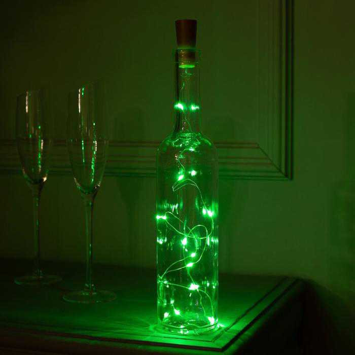Гирлянда идет в комплекте со специальной пробкой. Пробка вставляется в пустую бутылку из-под вина или шампанского, а гирлянда оборачивается вокруг бутылки. Получается очень стильное украшение Новогоднего стола.