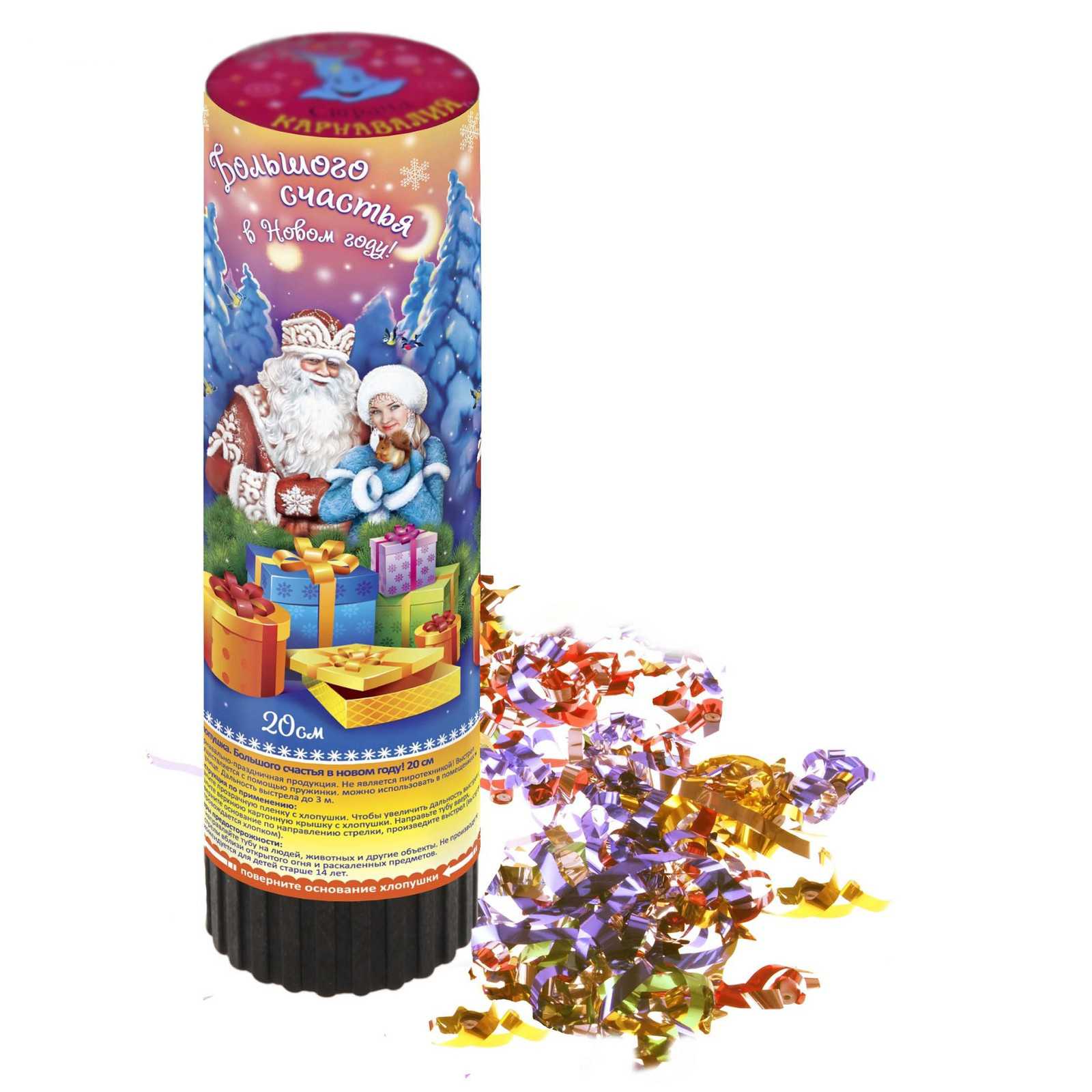 Хлопушка пружинная "Большого счастья в Новом году! Дед мороз и Снегурочка" (конфетти и серпантин, фольга) 20см