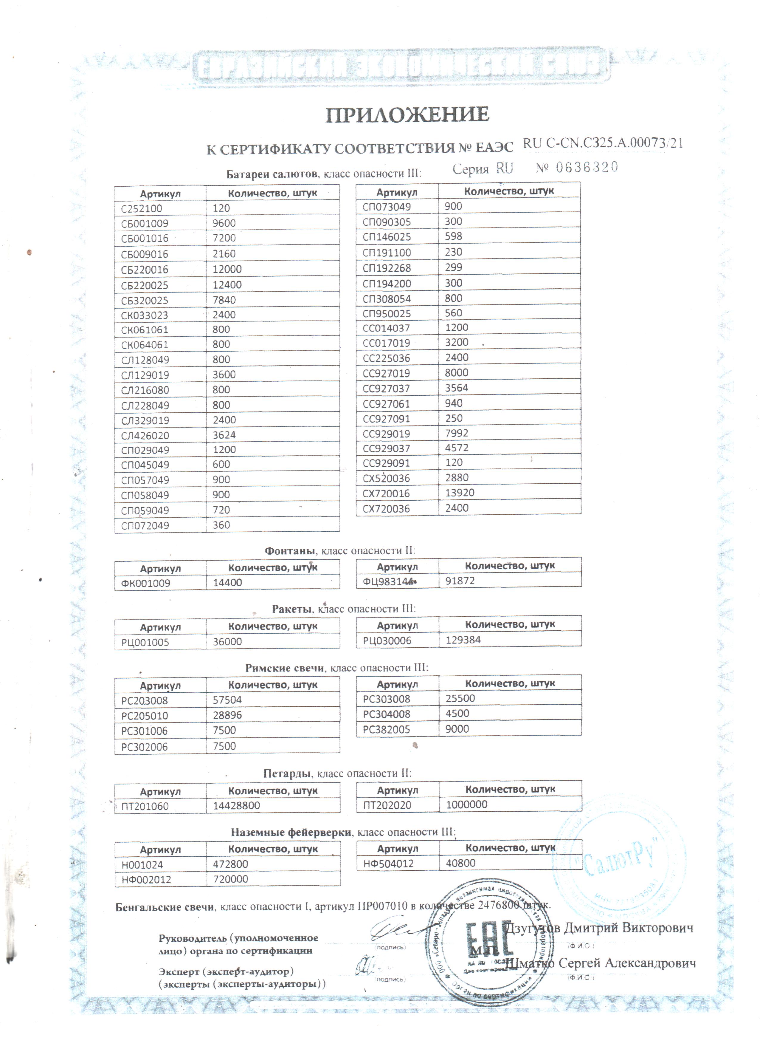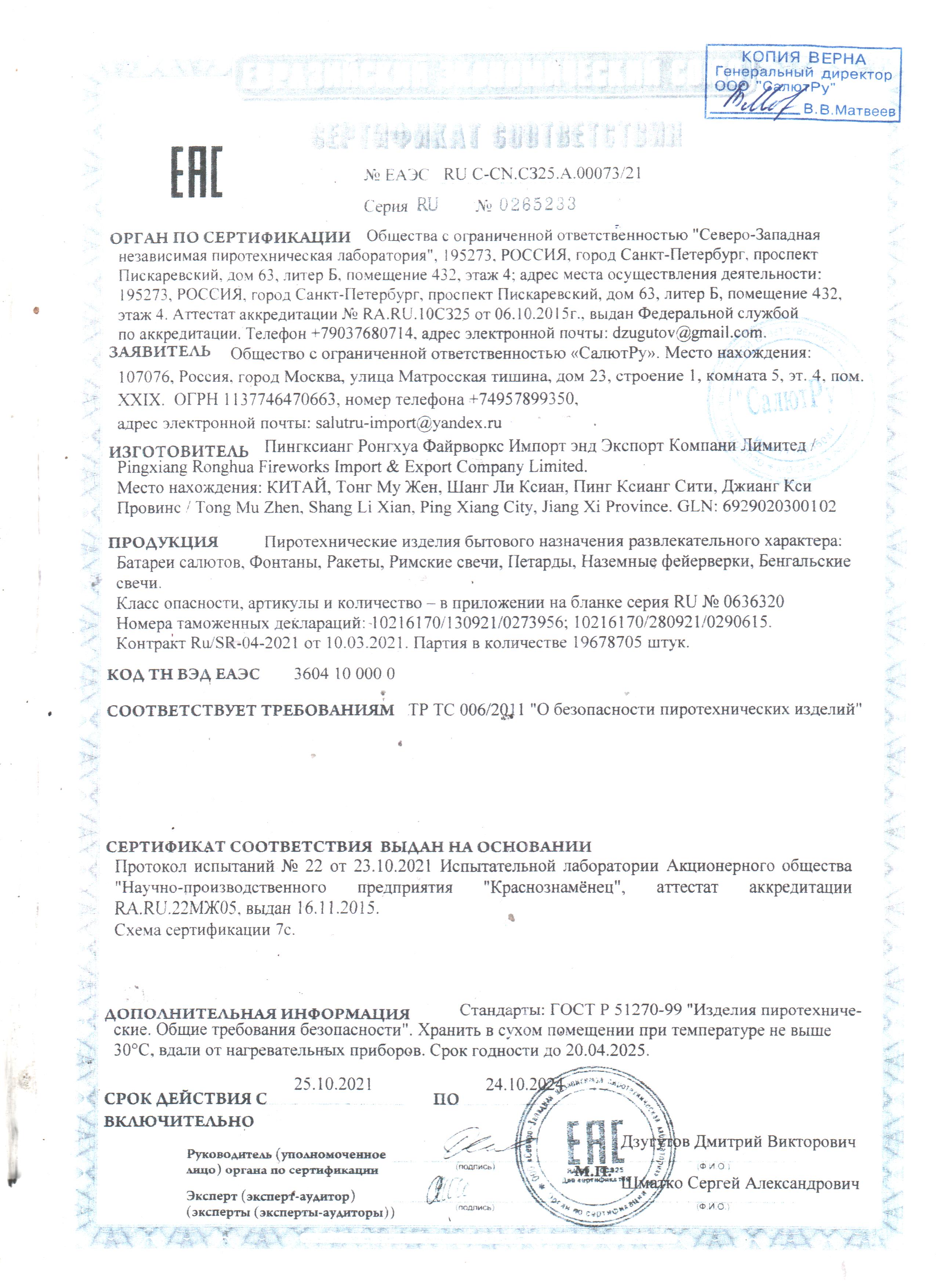 Магазин фейерверков ББ-Салют предоставляет гарантию на весь ассортимент интернет-магазина и розничных магазинов ББ-Салют! Мы торгуем пиротехникой самых лучших, проверенных торговых марок. Все изделия сертифицированы для продажи на территории России и имеют актуальный срок годности.