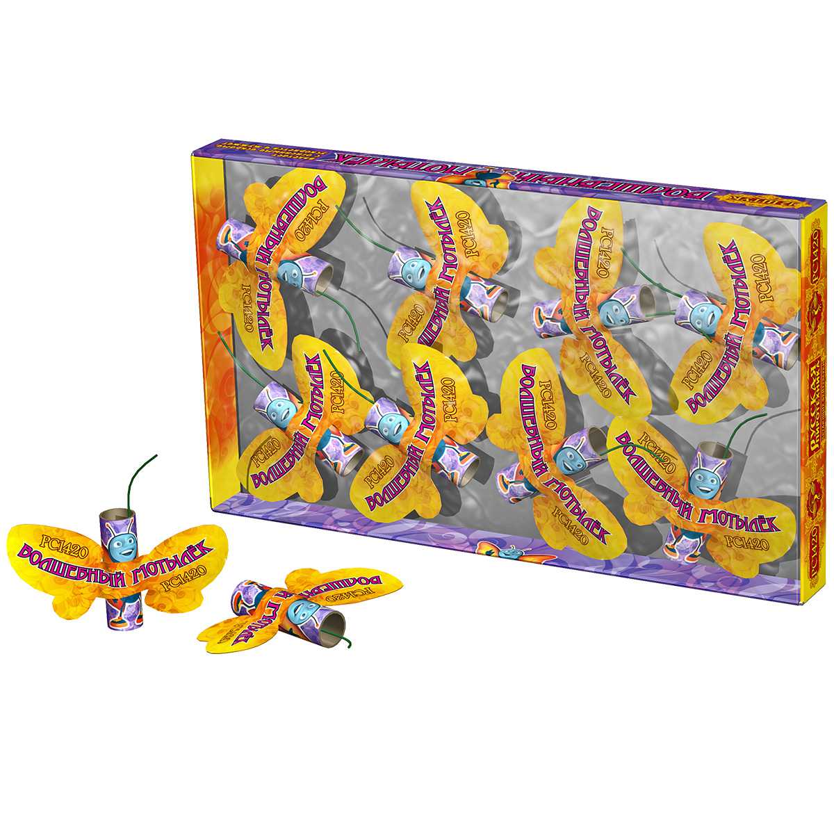 - Летающий фейерверк - картонный силуэт бабочки или пчелы, к центральной части которого прикреплено подобие петарды. Положите бабочку или пчелу на ровную горизонтальную поверхность. Сторона картонки, на которой отпечатан узор крыльев бабочки, должна смотреть вверх. Расправьте и подожгите фитиль. Если Вы все сделали правильно, через несколько секунд фейерверк взлетит вертикально вверх на несколько метров, разбрасывая огненные искры. Крупные летающие фейерверки могут также взрываться, как петарда, с громким хлопком.