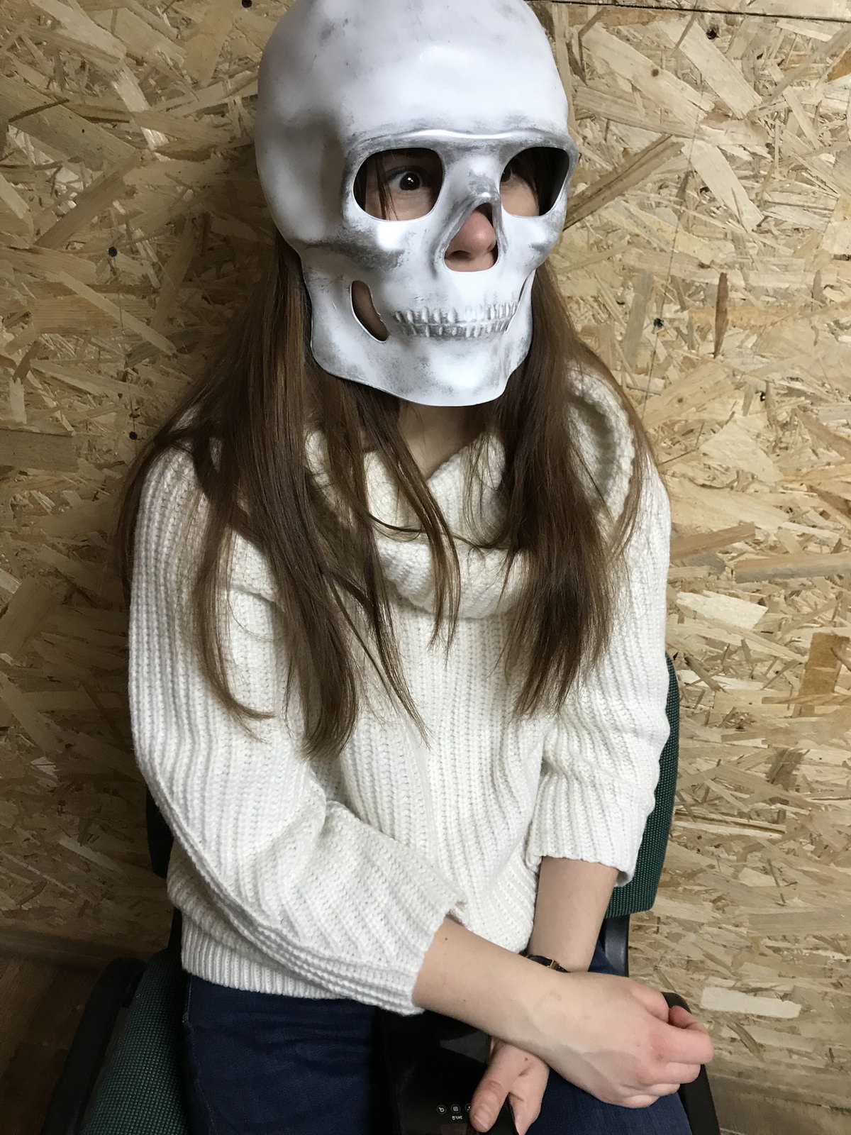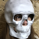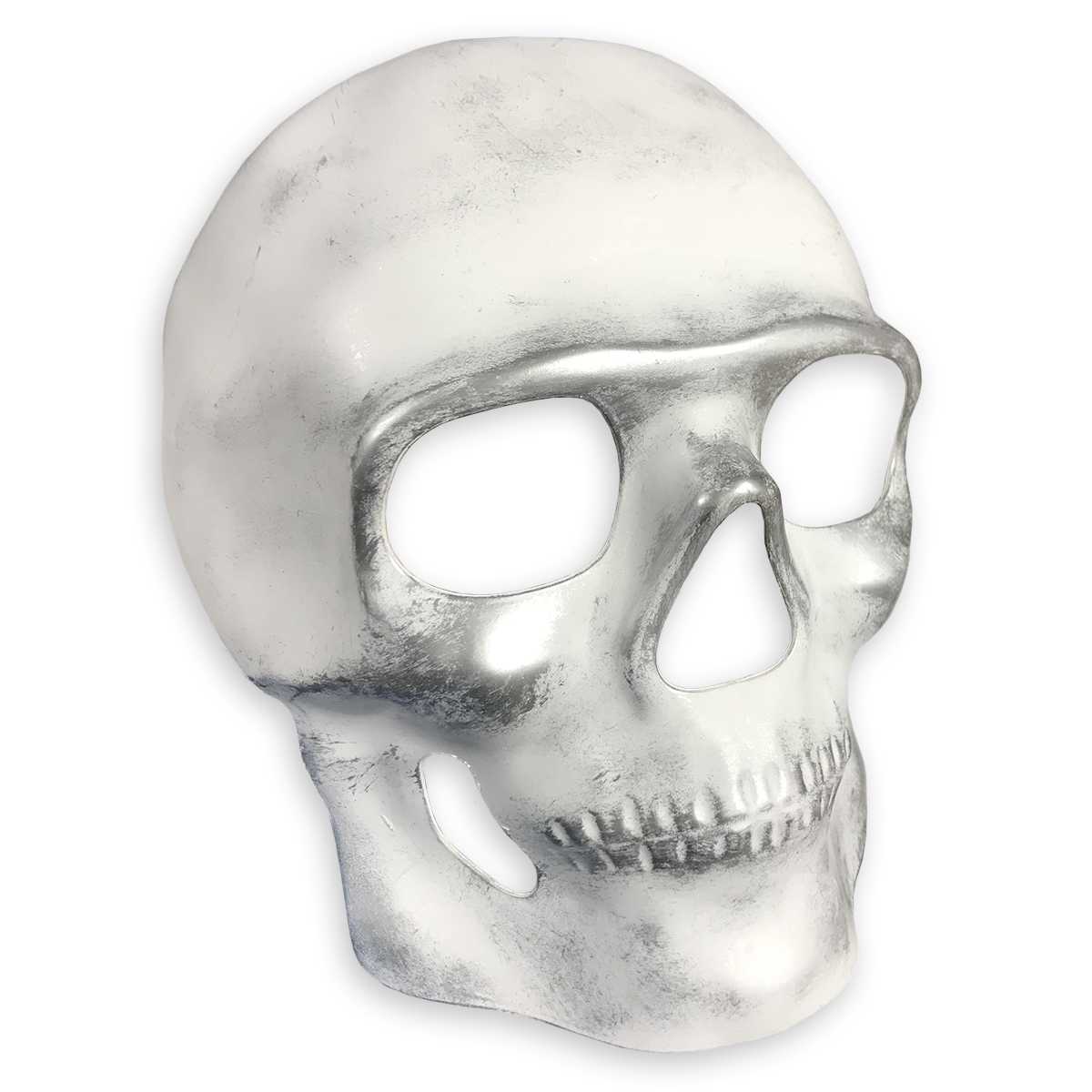 Маска для Хеллоуина в форме черепа, белого цвета (эффект состаривания). Крепится при помощи завязок. Изготовлена из пластика и текстиля.