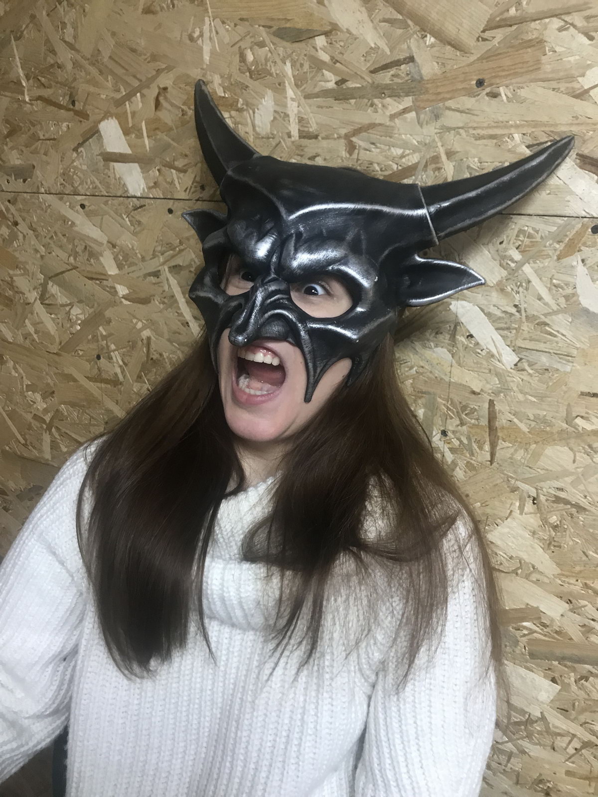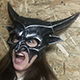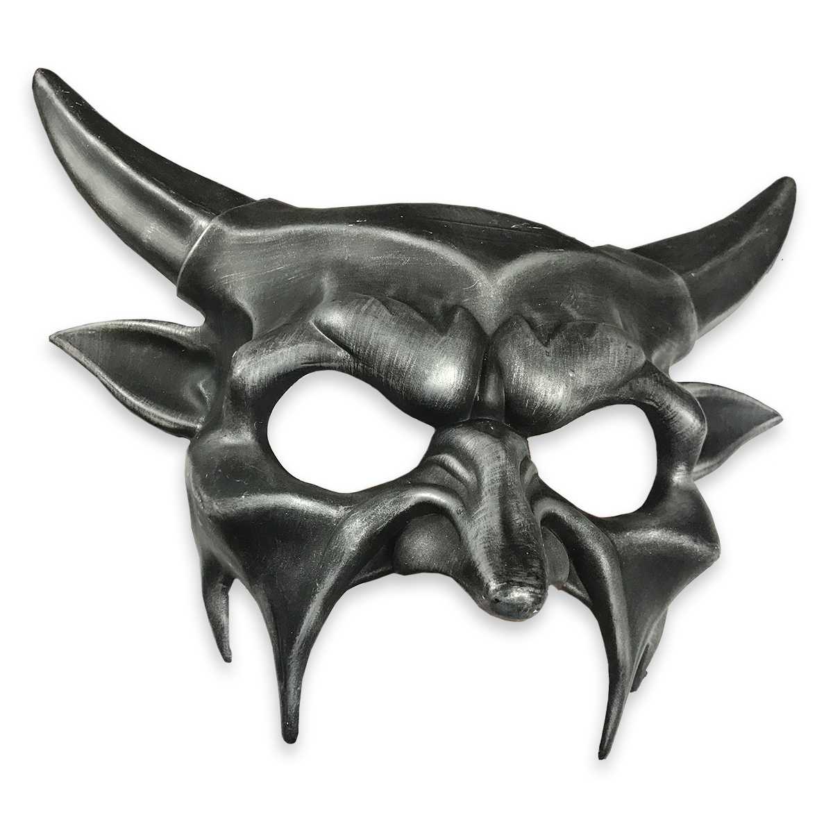 Маска карнавальная черного цвета (эффект состаривания) для Хэллоуина. Крепится при помощи завязок. Изготовлена из пластика и текстиля.