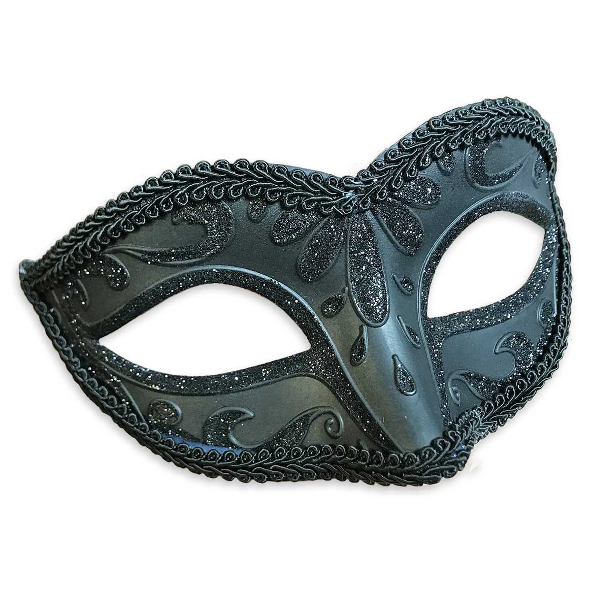 Очень качественно сделанная, венецианская маска (вид - colombina) черного цвета, украшена глиттером и тесьмой. Крепится при помощи завязок. Изготовлена из пластика и текстиля. Маска предназначена для маскарада, хэллоуина, вечеринки в клубе.