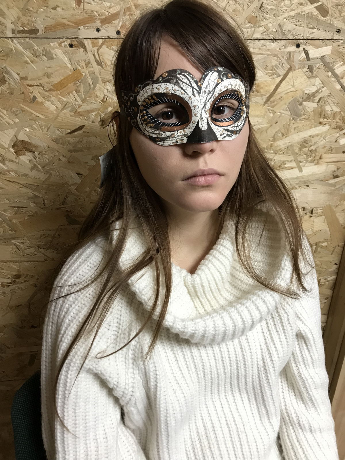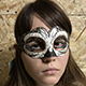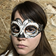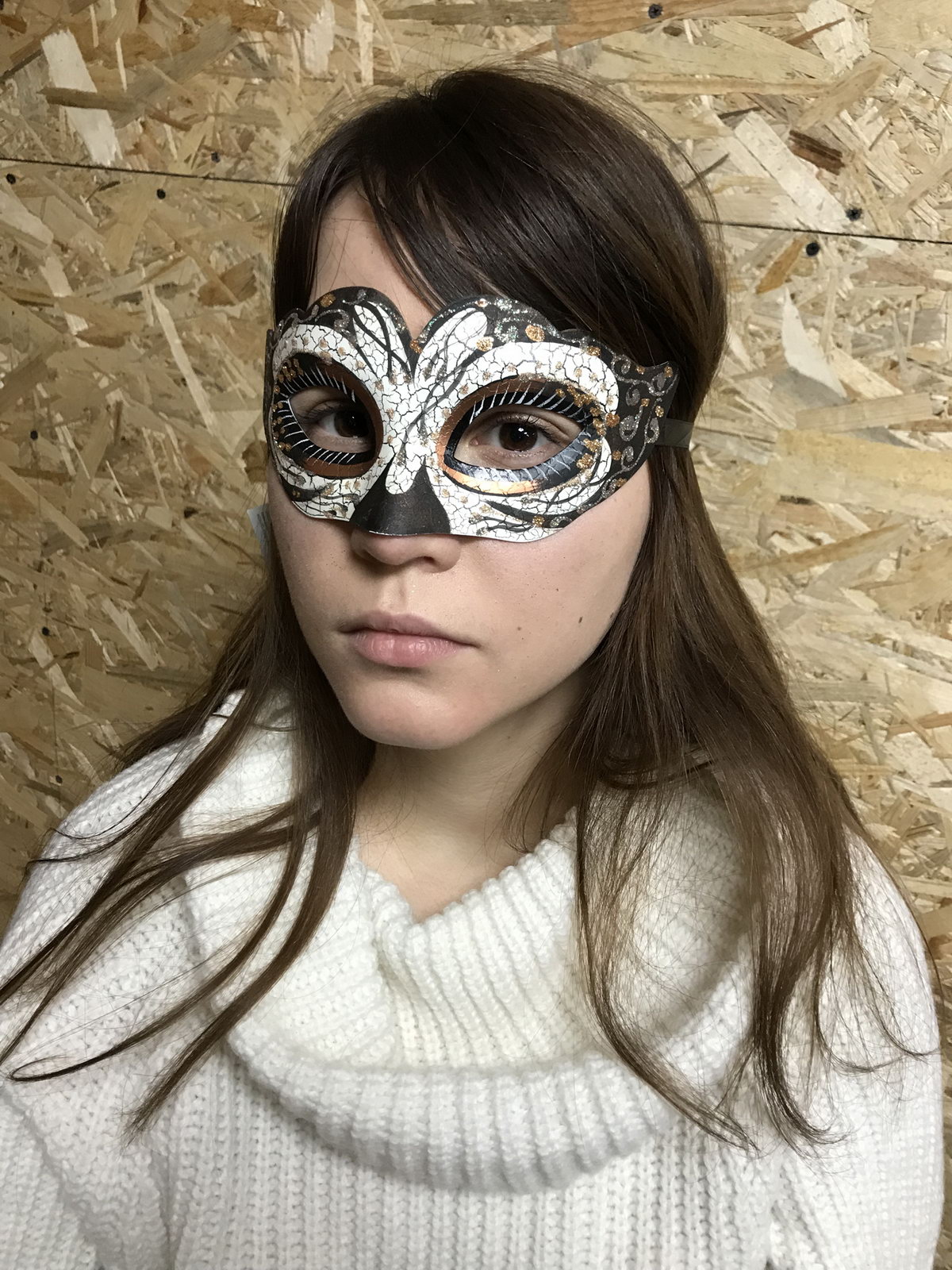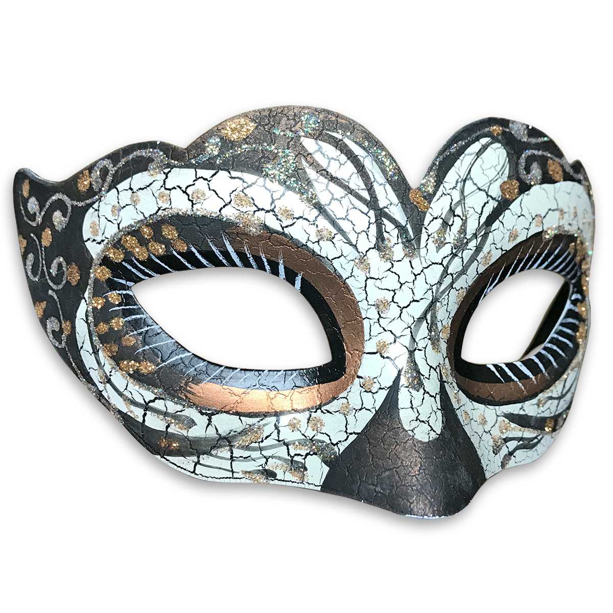 Венецианская маскарадная маска (вид - colombina) черно-белого цвета, прекрасно подойдет для карнавала или хэллоуина, украшена серебряным и золотым глиттером. Крепится при помощи завязок. Изготовлена из пластика и текстиля.