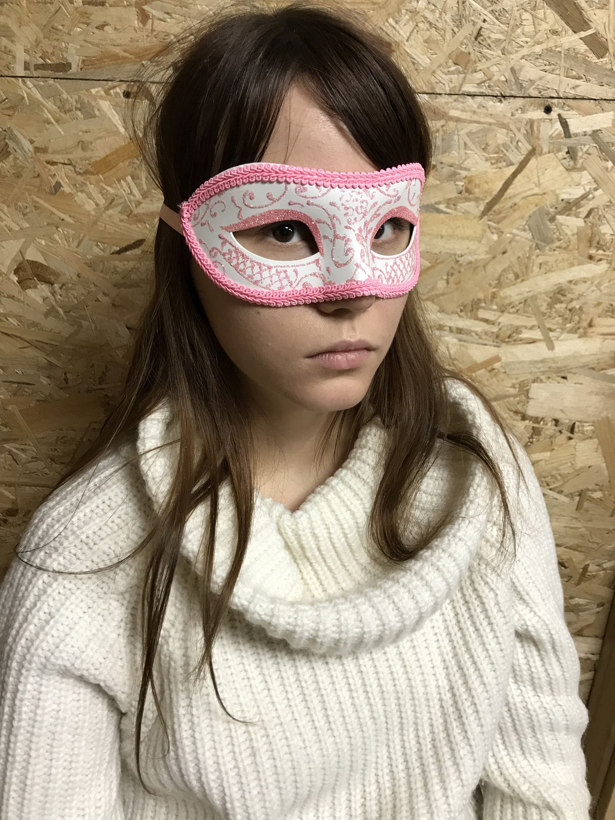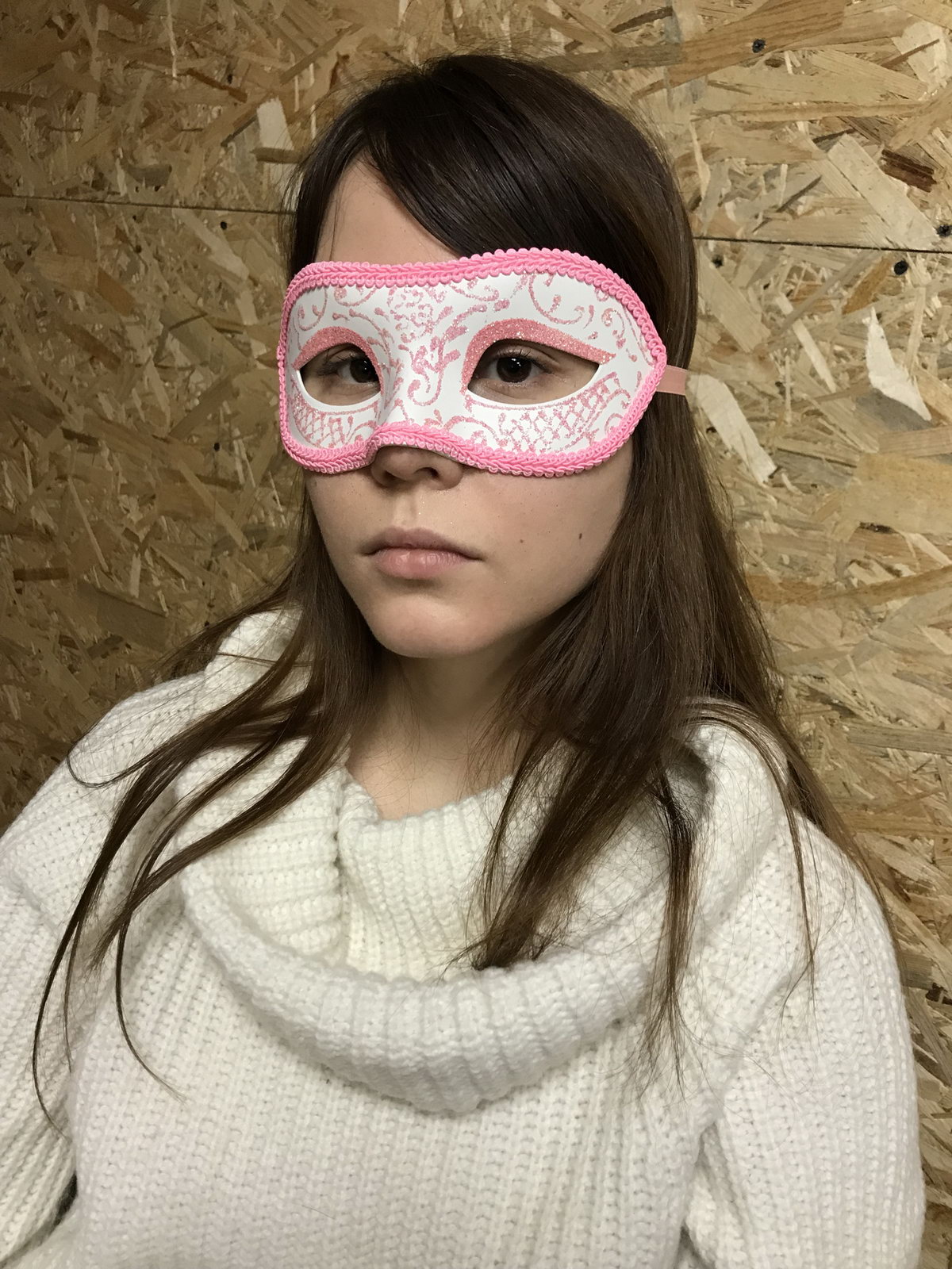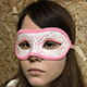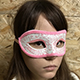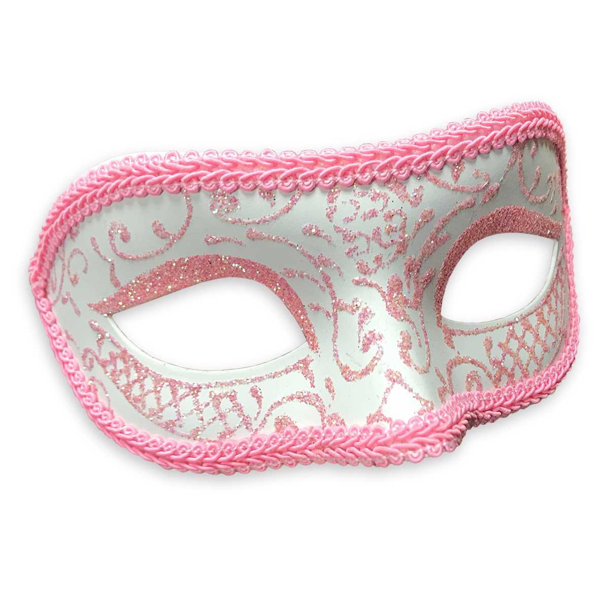 Венецианская маска (вид - colombina) белого цвета, украшена глиттером и розовой тесьмой. Крепится при помощи завязок. Изготовлена из пластика и текстиля. Маска прекрасно подойдет для хэллоуина или любого другого маскарада.