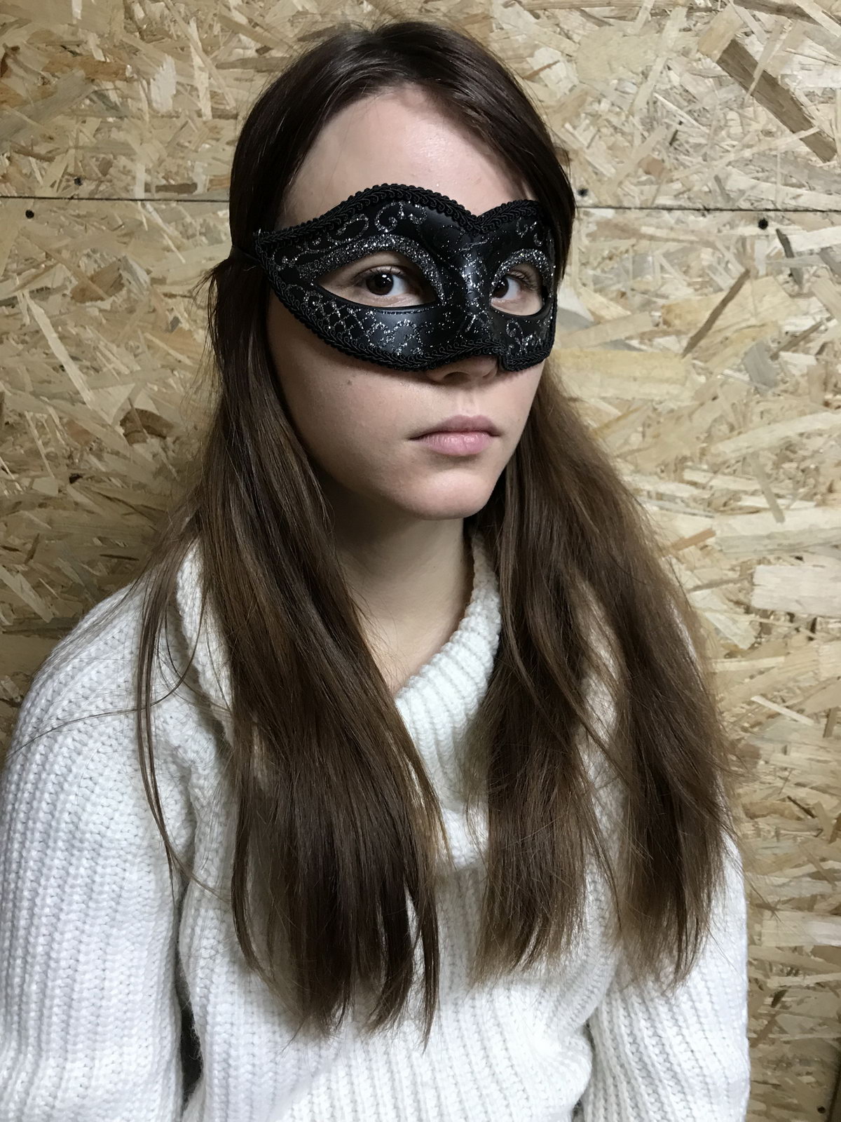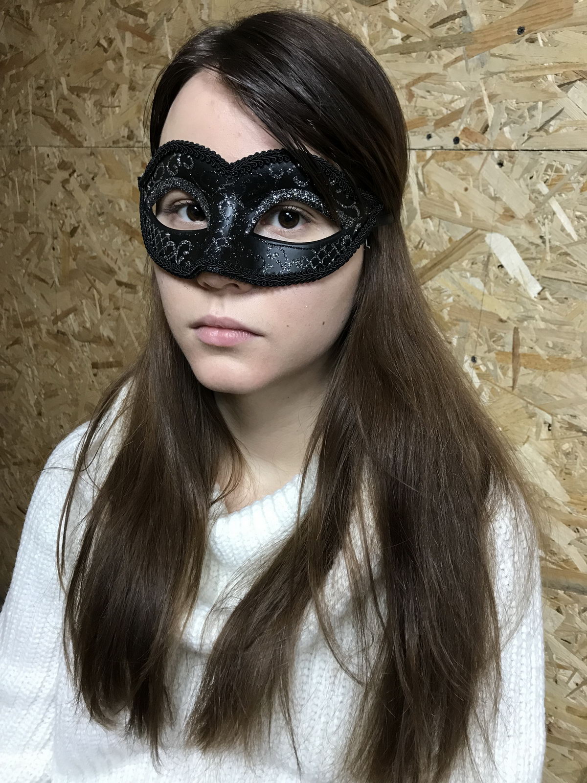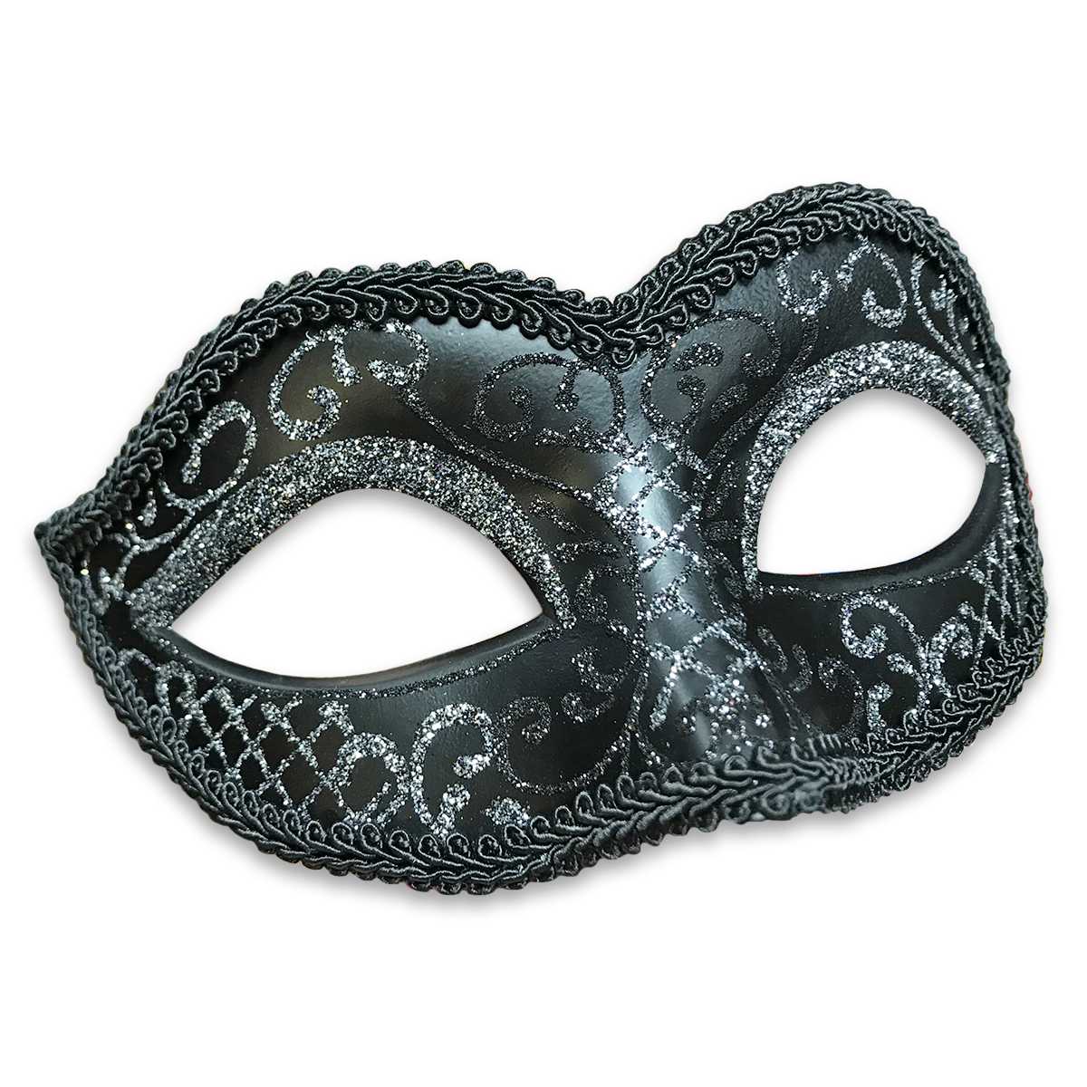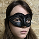 Венецианская маска (вид - colombina) черного цвета, украшена глиттером и черной тесьмой. Крепится при помощи завязок. Изготовлена из пластика и текстиля. Прекрасно подойдет для карнавала либо Хэллоуина.
