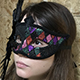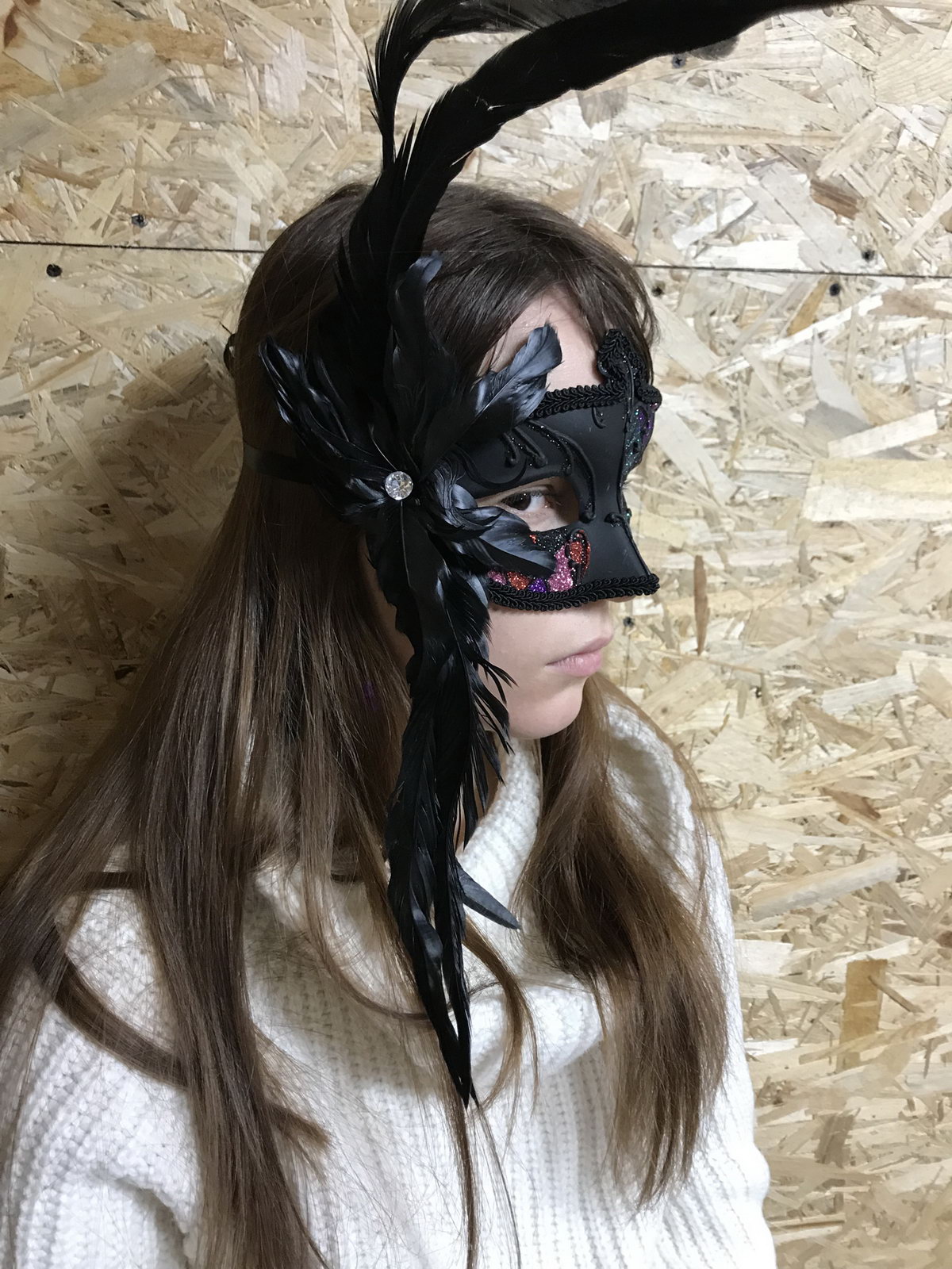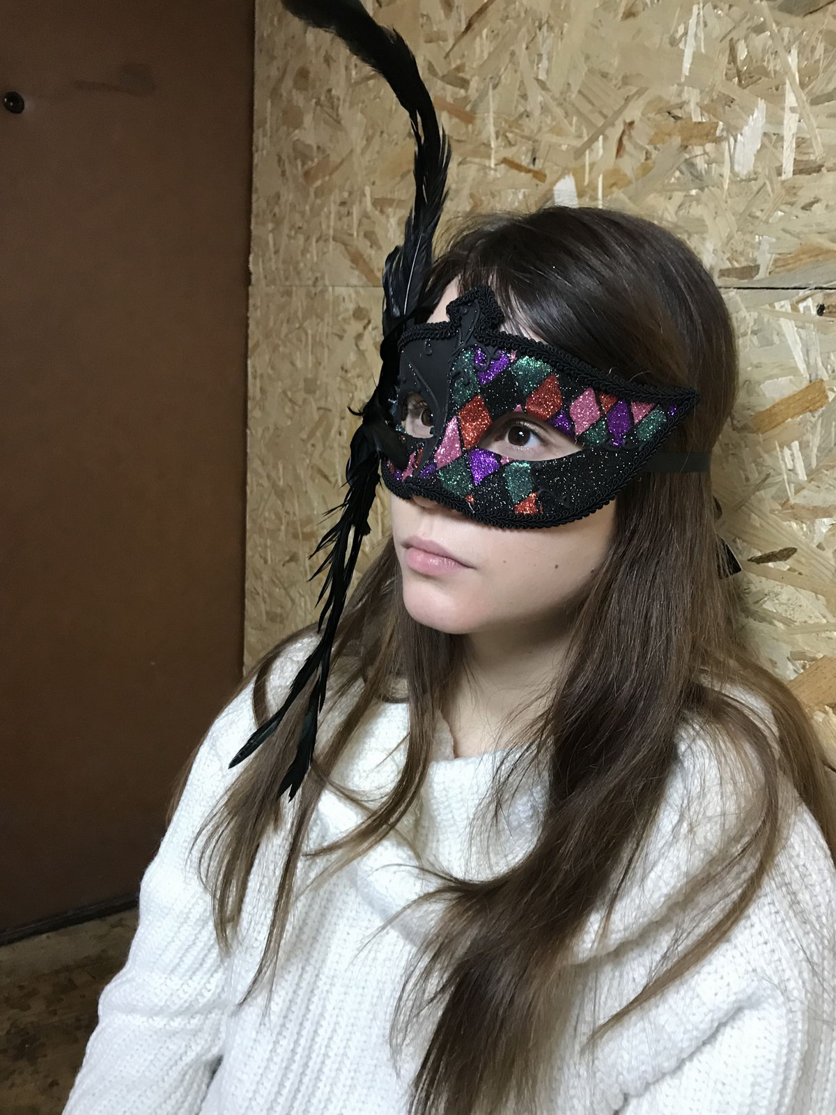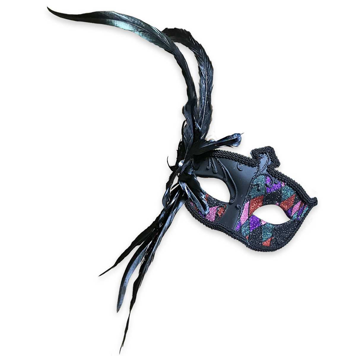 Венецианская маска (вид - colombina ciuffo) черного цвета, декорирована разноцветным глиттером, черными перьями, прозрачным кристаллом и черной тесьмой. Крепится при помощи завязок. Изготовлена из пластика и текстиля. Маска украсит любую вечеринку или маскарад.