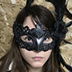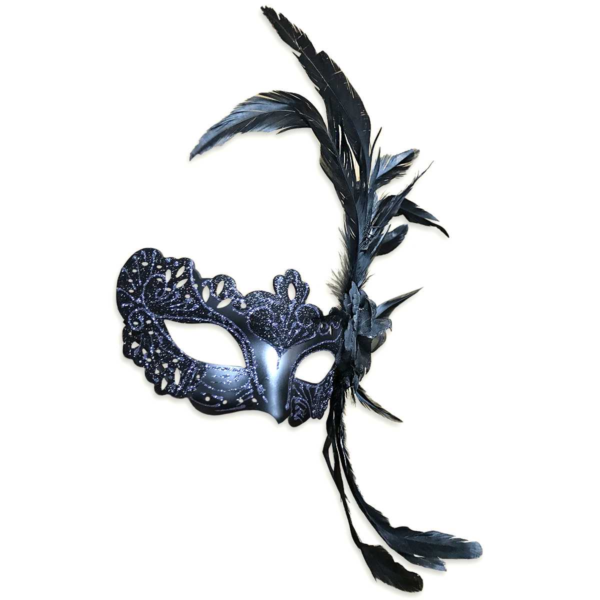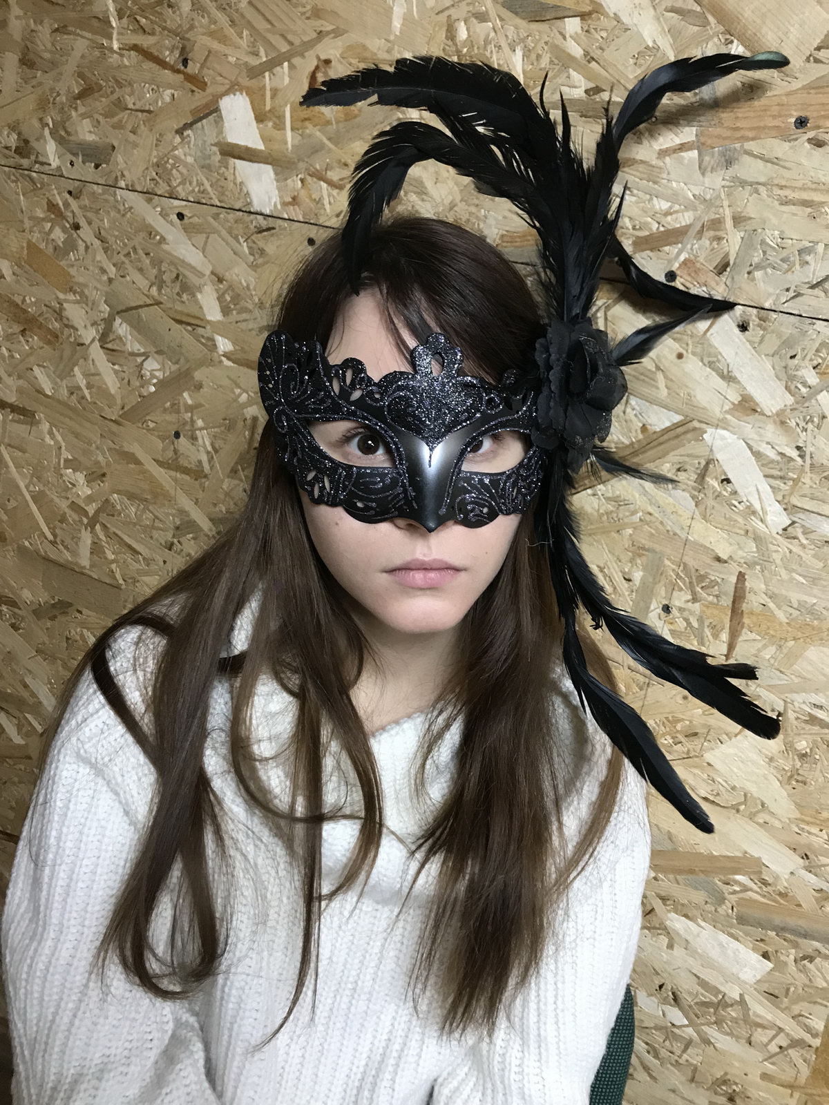 Венецианская маска (вид - colombina ciuffo) черного цвета, украшена серебряным глиттером, черными перьями и декоративным цветком. Крепится при помощи завязок. Изготовлена из пластика и текстиля. Отлично подойдет для маскарада, в том числе и для Хэллоуина