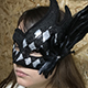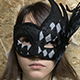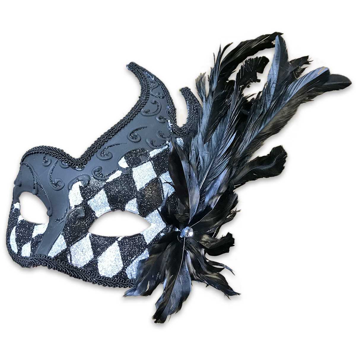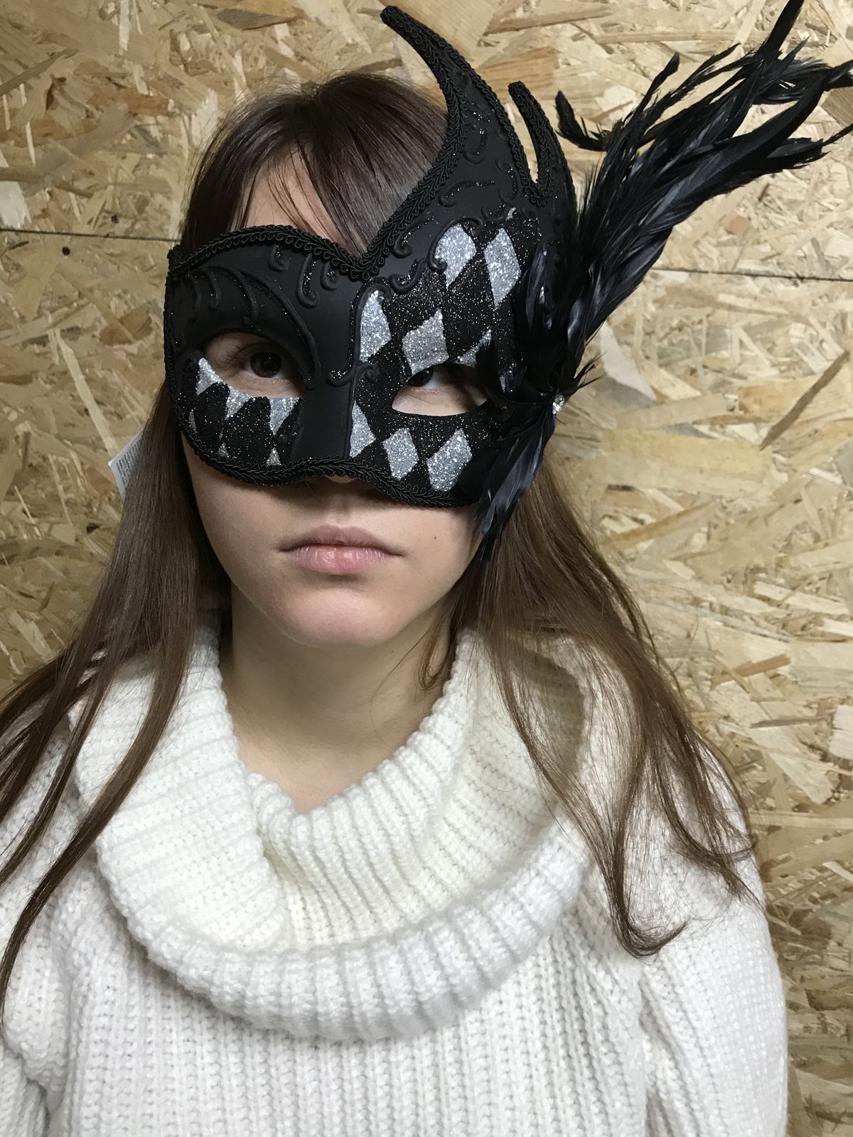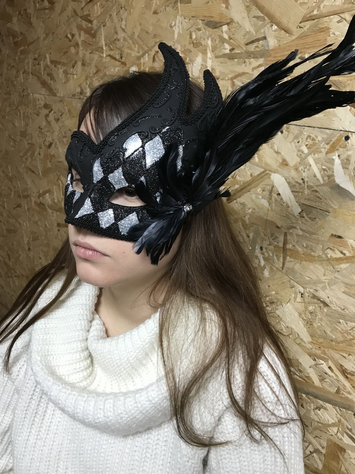 Венецианская маска (вид - colombina ciuffo) черного цвета, декорирована черно-белым глиттером, черными натуральными перьями, прозрачным кристаллом и черной тесьмой. Крепится при помощи завязок. Изготовлена из пластика и текстиля.