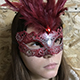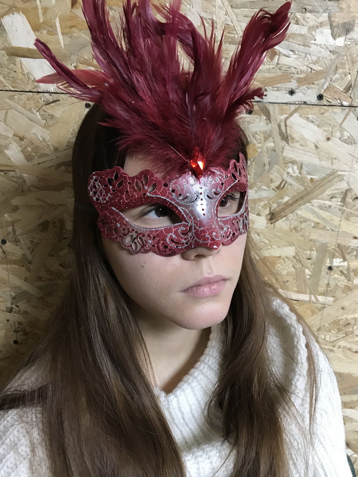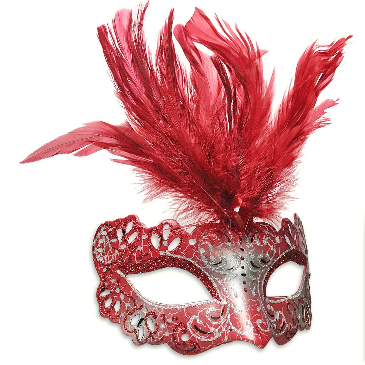 Венецианская маска (вид - colombina ciuffo) красного цвета, декорирована разноцветным глиттером, красными натуральными перьями и прозрачным кристаллом. Крепится при помощи завязок. Изготовлена из пластика и текстиля.