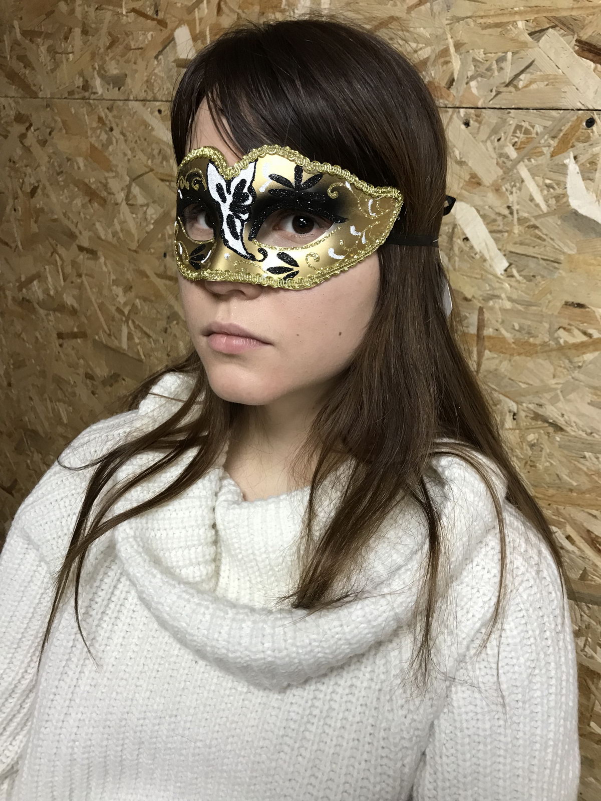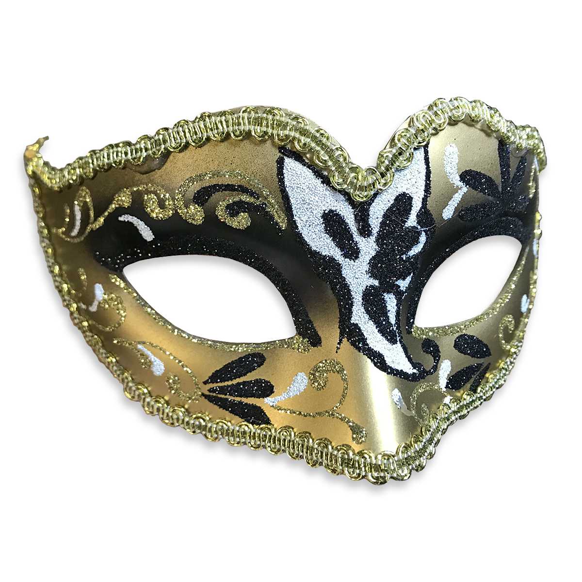 Золотая карнавальная маска из Европы. Сделана очень качественно (вид - colombina) золотистого цвета, украшена глиттером и тесьмой. Крепится при помощи элегантных завязок. Изготовлена из пластика и текстиля. Маска предназначена для маскарада, хэллоуина, вечеринки в клубе.