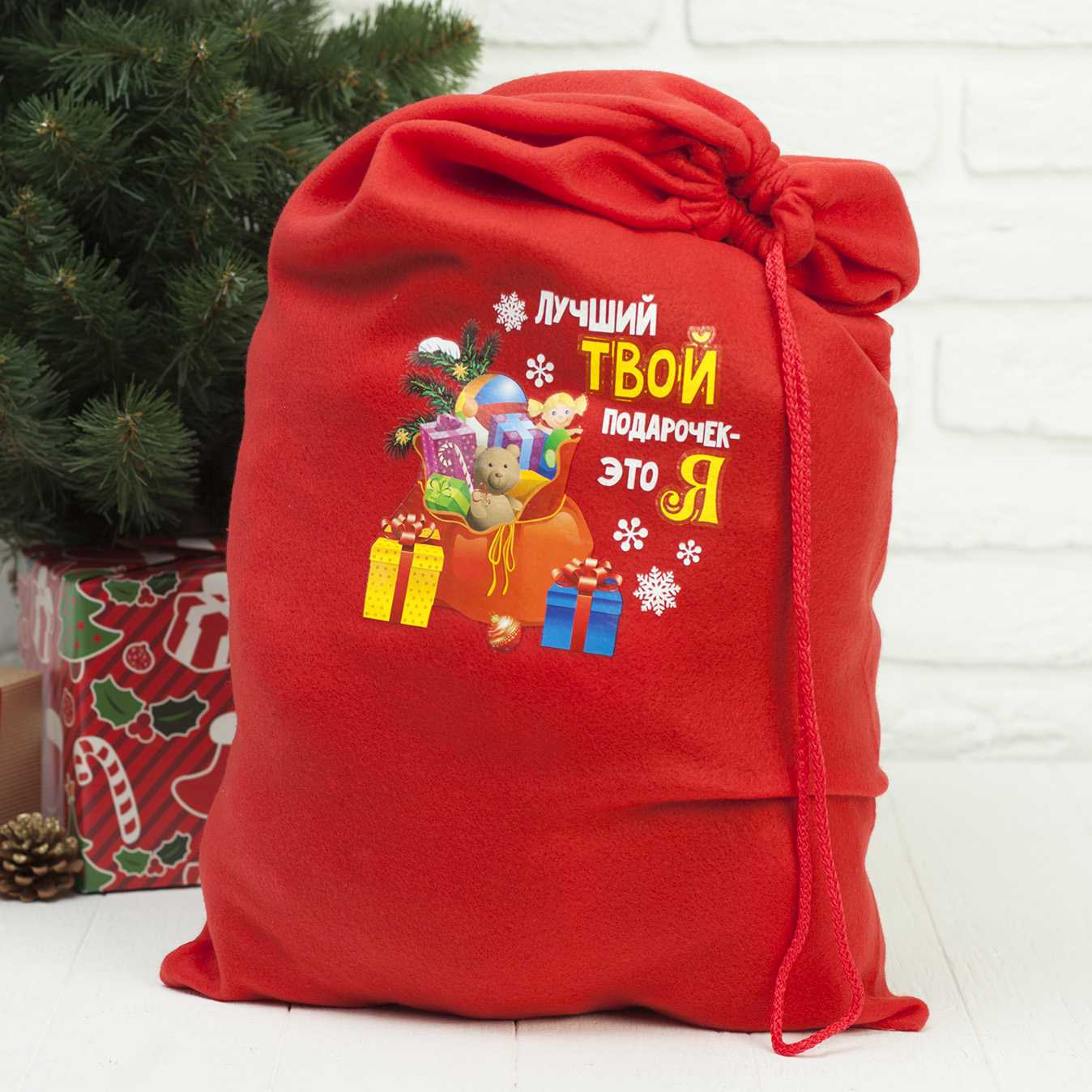 Мешок для подарков Деда Мороза ярко-красного цвета с завязкой (шнур) с цветной наклейкой.
