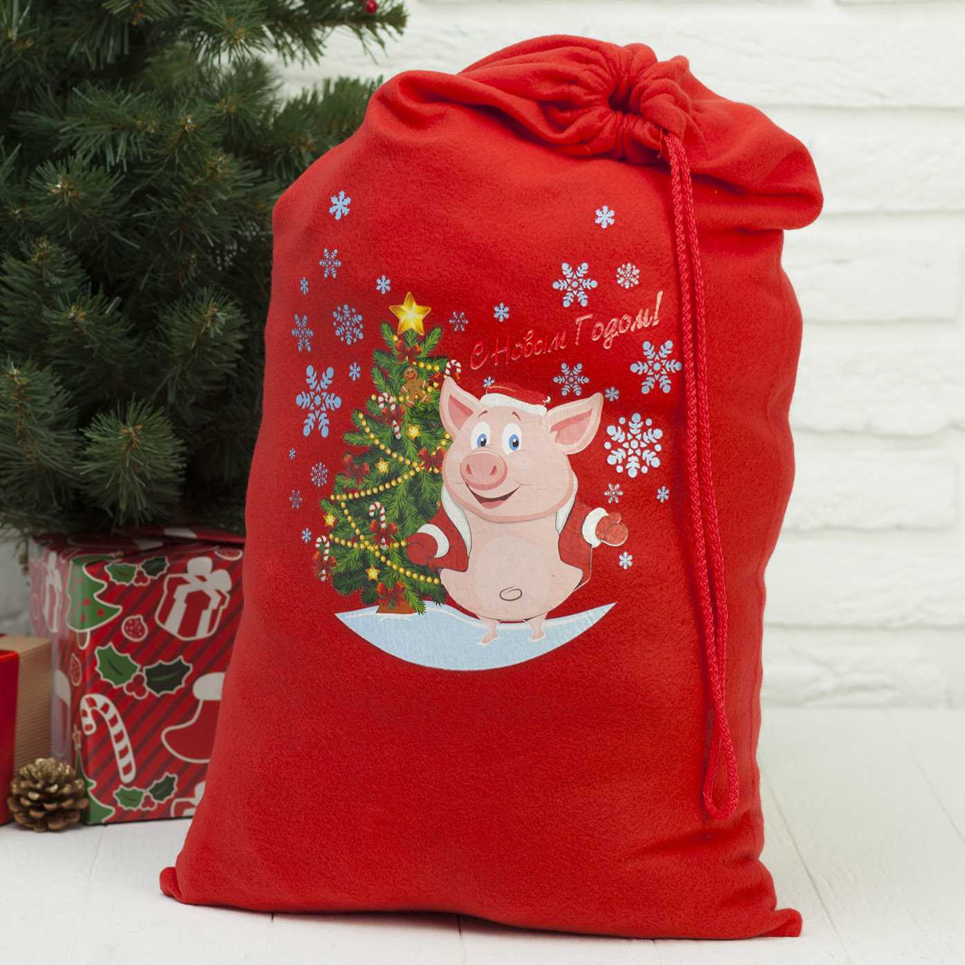 Мешок для подарков Деда Мороза ярко-красного цвета с завязкой (шнур) с цветной наклейкой.