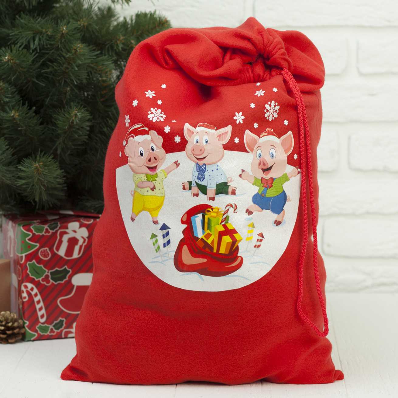 Мешок для подарков Деда Мороза ярко-красного цвета с завязкой (шнур) с цветной наклейкой.