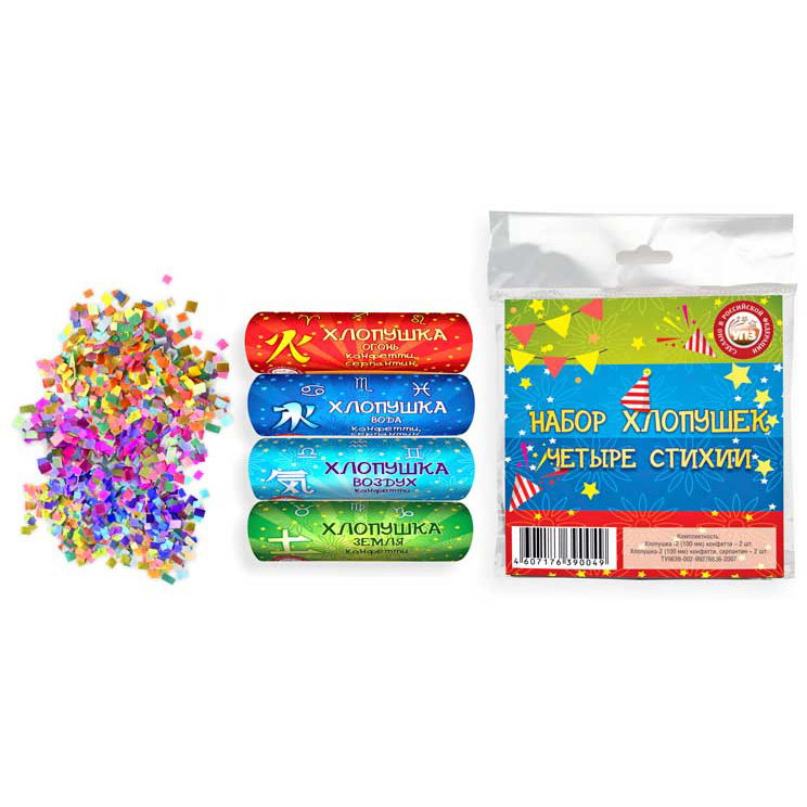Набор состоит из 4 хлопушек. Каждая хлопушка символизирует определенную стихию.