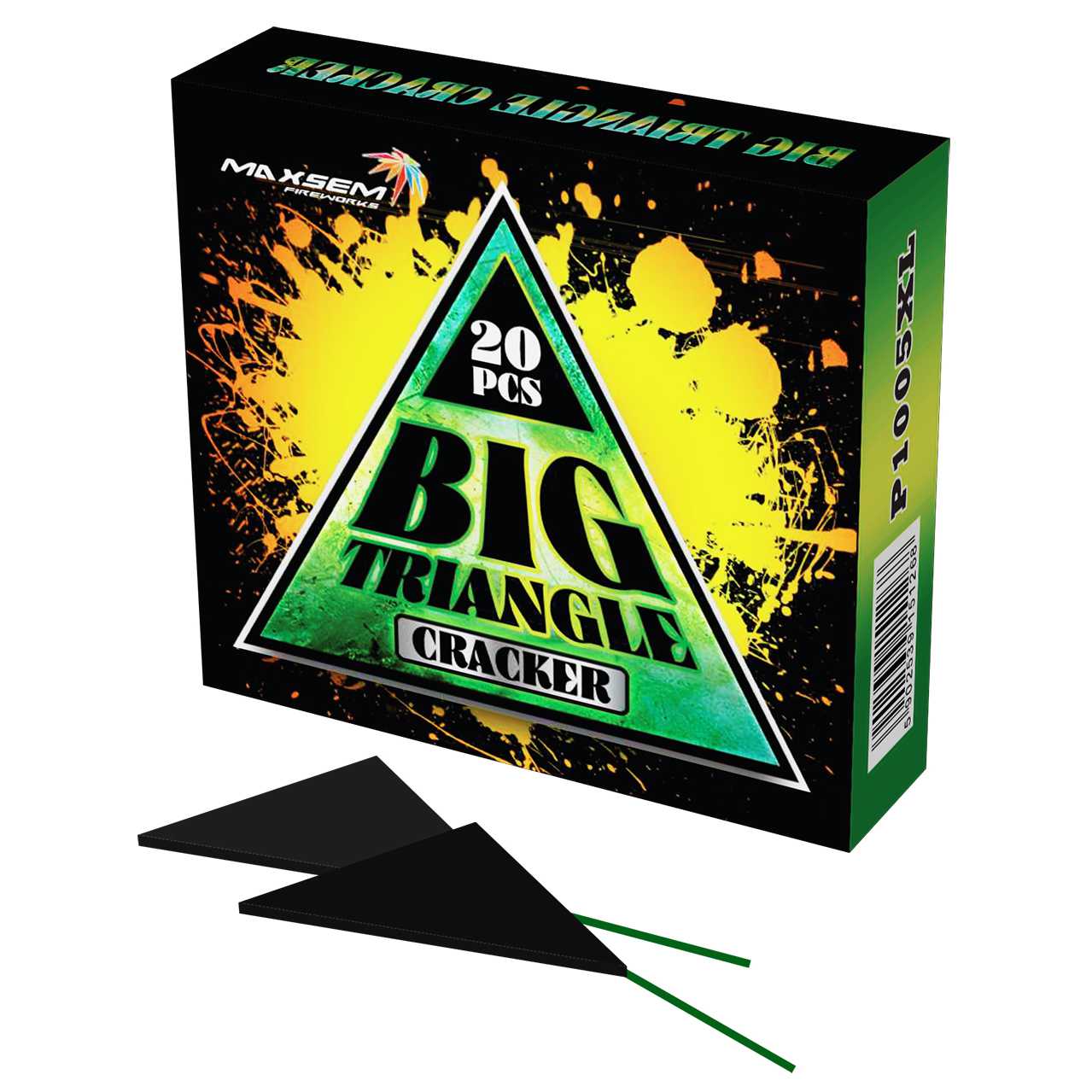 В упаковке петард "Big Triangle Cracker" находится ровно двадцать петард. Внешне петарды выглядят, как черные равнобедренные треугольники с длинным фитилем. Сделаны петарды из плотного картона. Петарды-треугольники популярны из-за своего удобства, их удобно носить в кармане, они легкие и не сыпятся. Крупные треугольники повышенной мощности - это все, о чем может мечтать настоящий петардист!