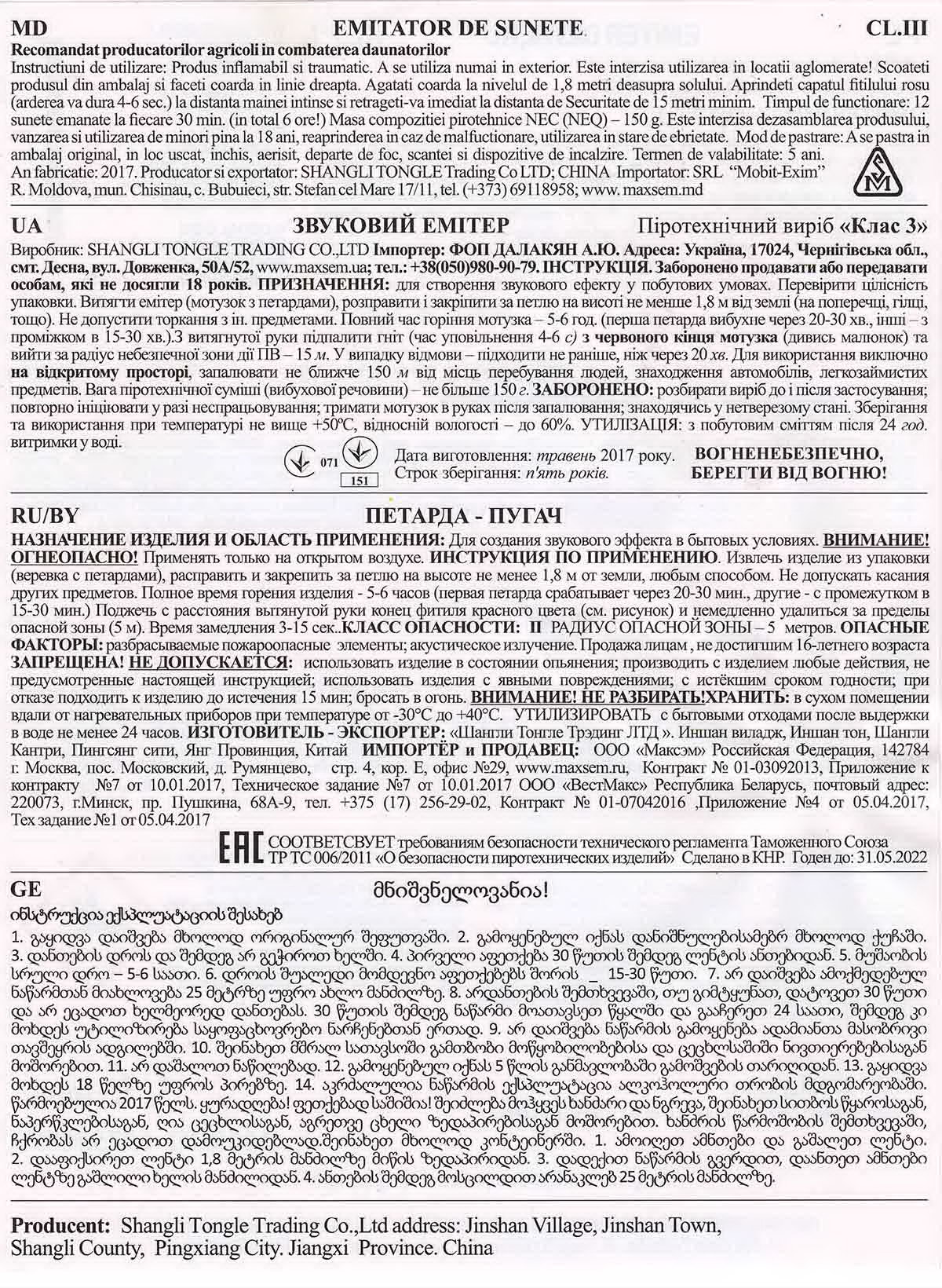 Петарды - пугач P1003 - это оригинальное пиротехническое изделие. Оно предназначено для отпугивания птиц и животных. Время работы около 6 часов, за это время происходит 12 оглушительных хлопков с интервалом в 20-30 минут, что отлично подойдет садоводам для эффективной защиты урожая от «непрошеных гостей». Другое возможное применение - отпугивание диких животных от туристической стоянки. Внимание! Изделие пожароопасно, как любая пиротехника. Состоит из набора петард, закрепленных на медленно тлеющем фитиле. При использовании данного устройства соблюдайте повышенную осторожность: необходимо удостовериться, что от тлеющего фитиля не загорится сухая трава, листья и проч. Использовать только по прямому назначению (отпугивание птиц и животных).