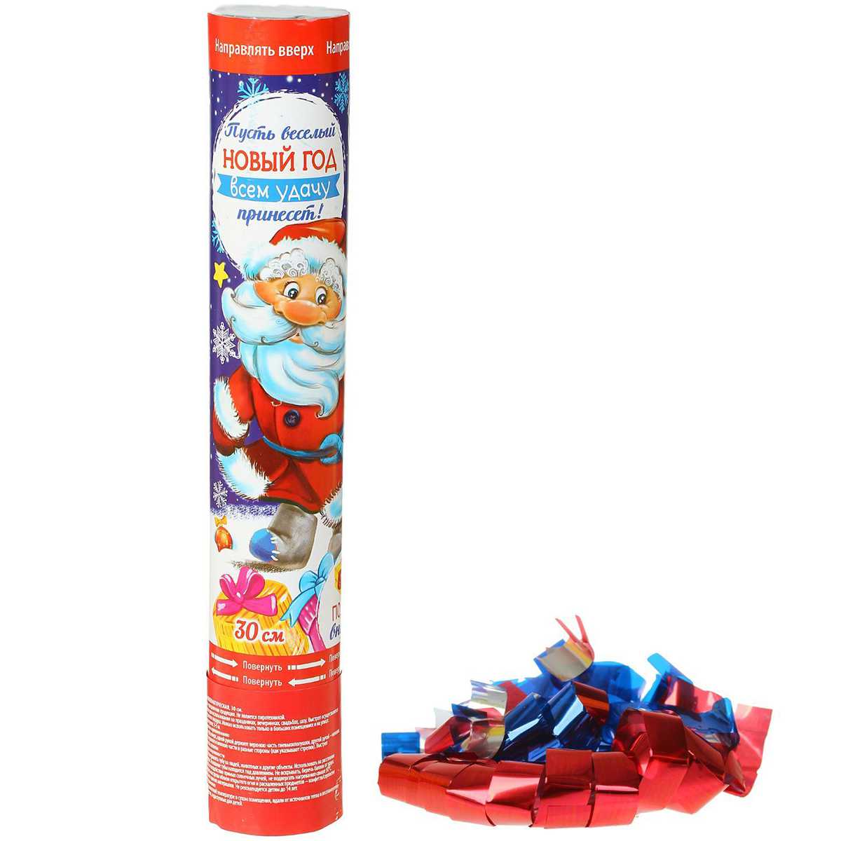 Хлопушка выстреливает ленты яркого фольгированного серпантина на длину 6-8 метров.