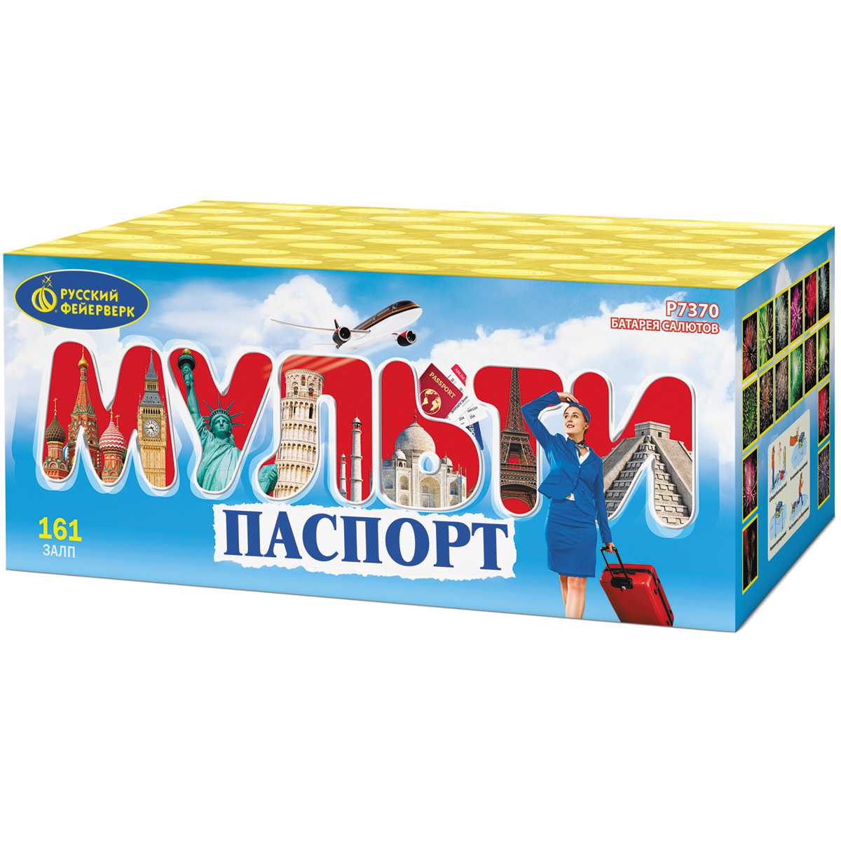 Богатый на эффекты фейерверк "Мультипаспорт" удивит зрителя самыми завораживающими цветовыми сочетаниями, а также магическим блеском, громкими взрывами, свистом и супер-треском! Вы увидите фантастически яркие красные, фиолетовые и зеленые звезды с длинными золотыми хвостами. Очень завораживают - белые, золотистые и зеленые, мерцающие сферы. Нельзя оставить без внимания и потешные свистящие змейки. Это эффект, когда закручивающаяся, серебристая дорожка стремительно летит вверх. Внезапности и драйва добавляют этому салюту - облака трещащих разрывов. Шокируют зрителя и двухуровневые залпы в разных цветовых вариациях. На верхнем уровне кометы раскрываются звездами, а на нижем уровне - трещащие искры. Финальный аккорд фейерверка "Мультипаспорт" - сочетание сотен ниспадающих нитей серебристого цвета и синих звезд. Мы считаем, что это идеальное завершение этого грандиозного представления, а возможно и вашего праздника!