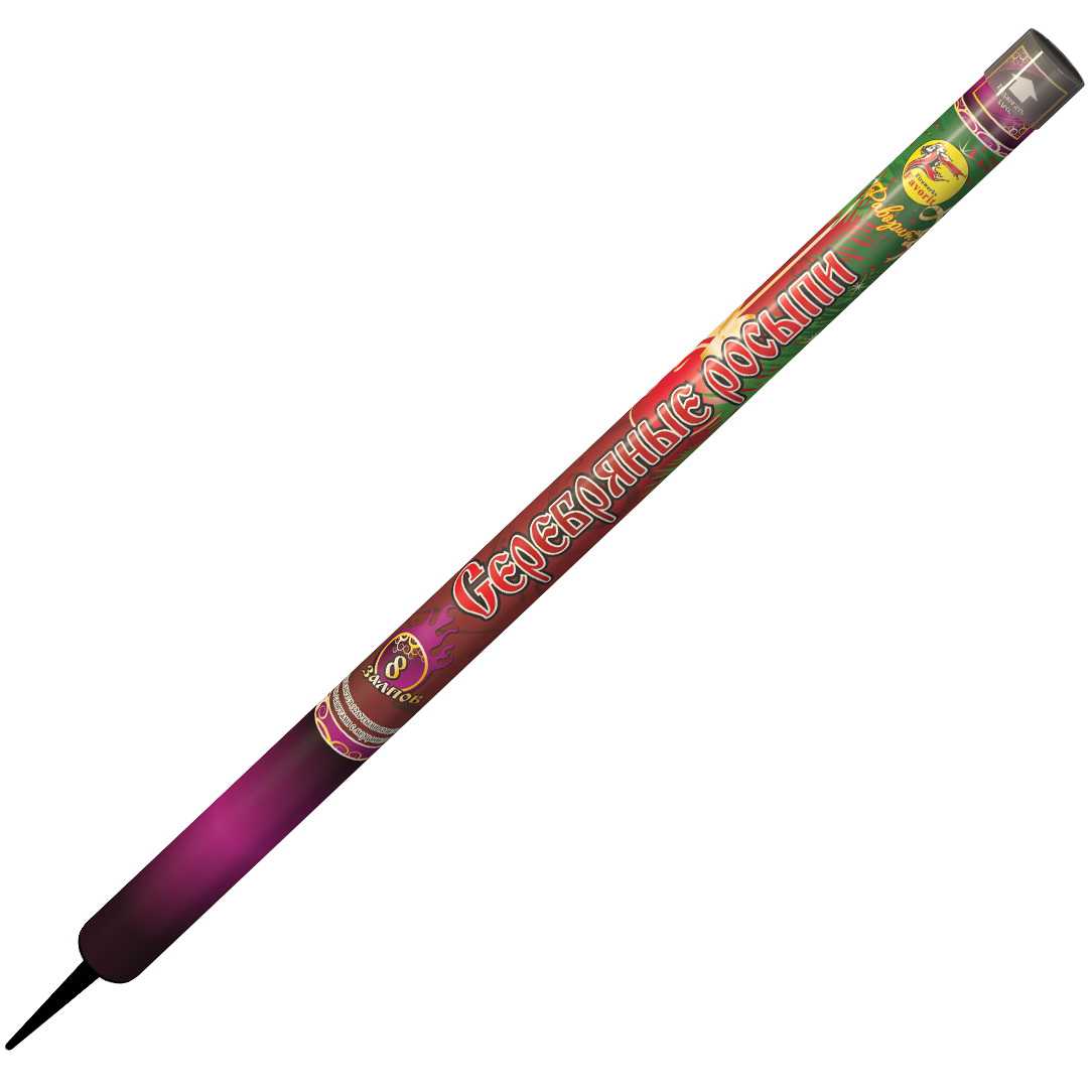 "Серебряные россыпи" - мощные римские свечи. 8 залпов раскрываются кометами, разноцветными салютами, мерцанием и треском. В упаковке две полуторадюймовых свечи.