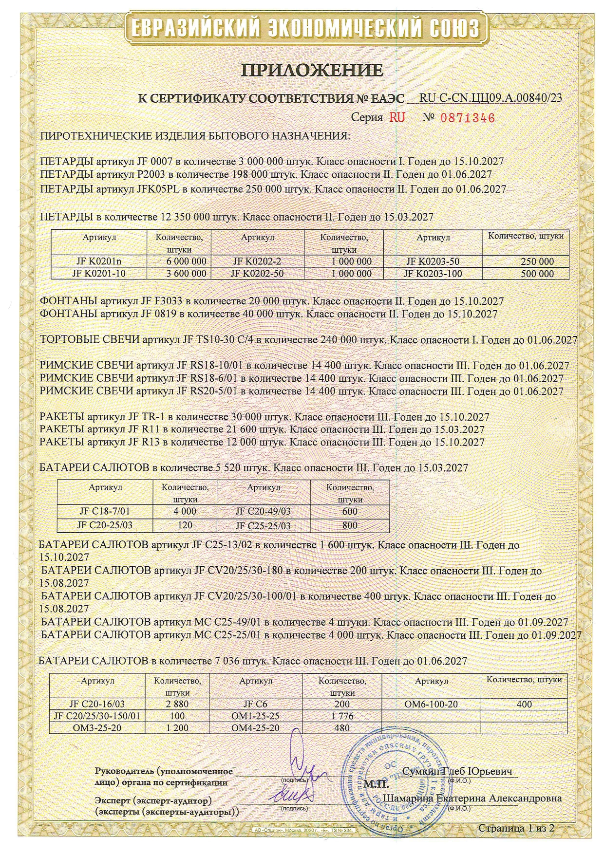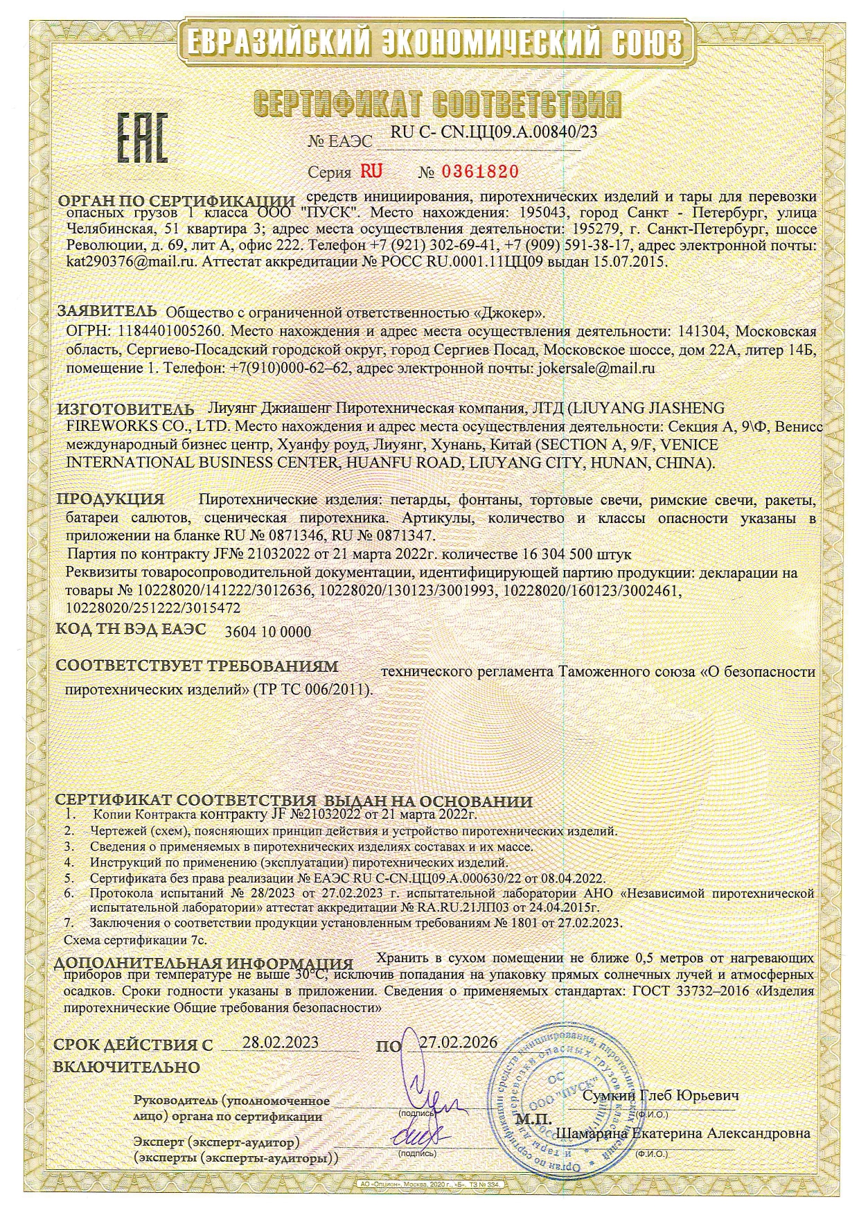 Магазин фейерверков ББ-Салют предоставляет гарантию на весь ассортимент интернет-магазина и розничных магазинов ББ-Салют! Мы торгуем пиротехникой самых лучших, проверенных торговых марок. Все изделия сертифицированы для продажи на территории России и имеют актуальный срок годности.
