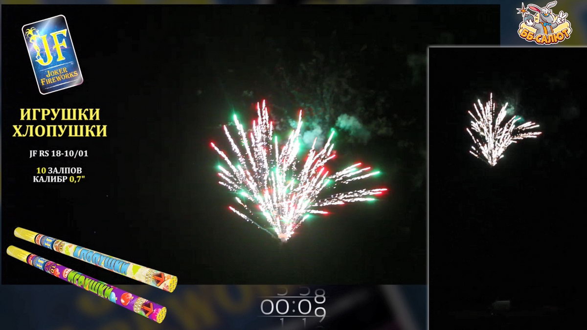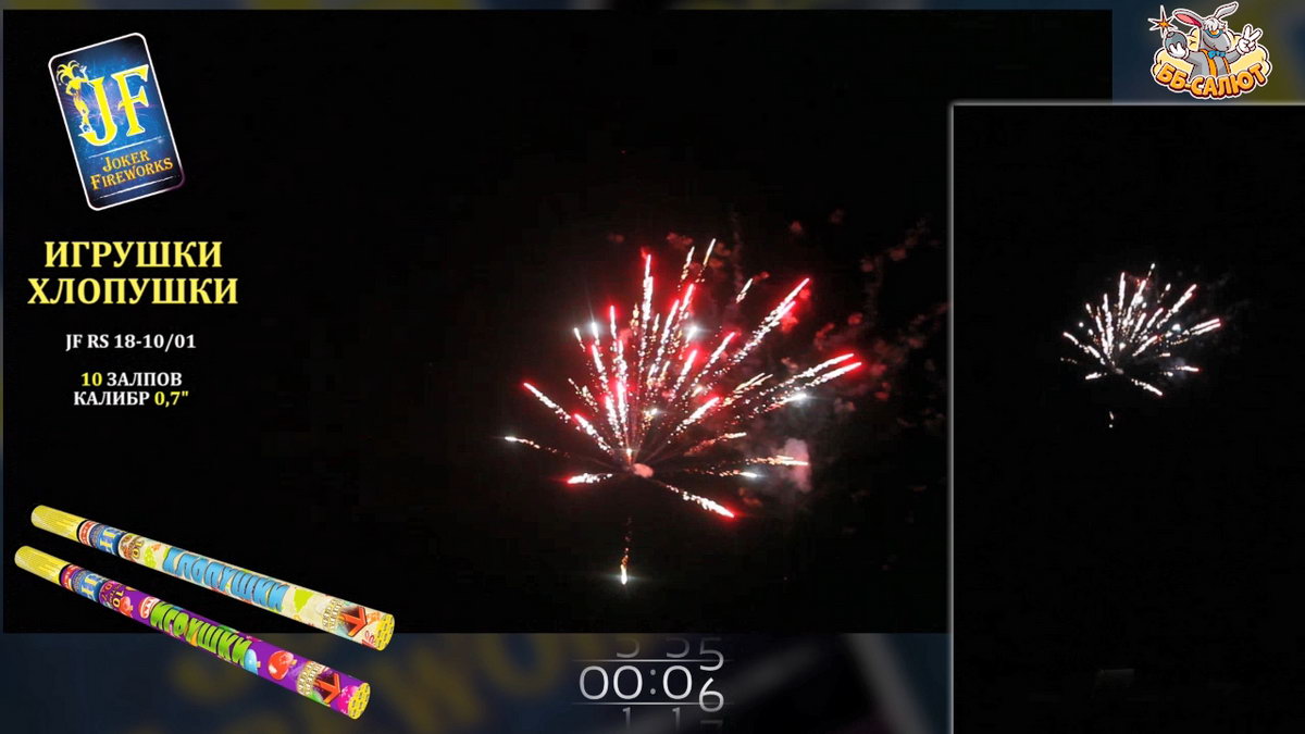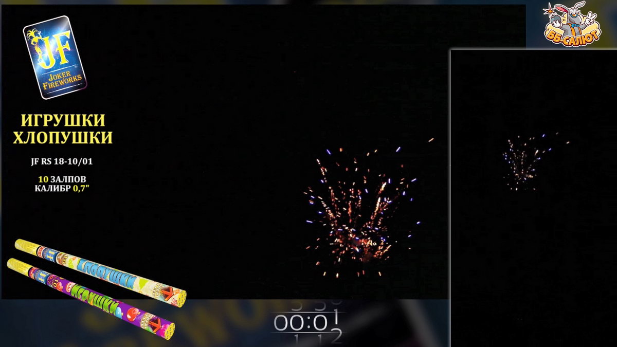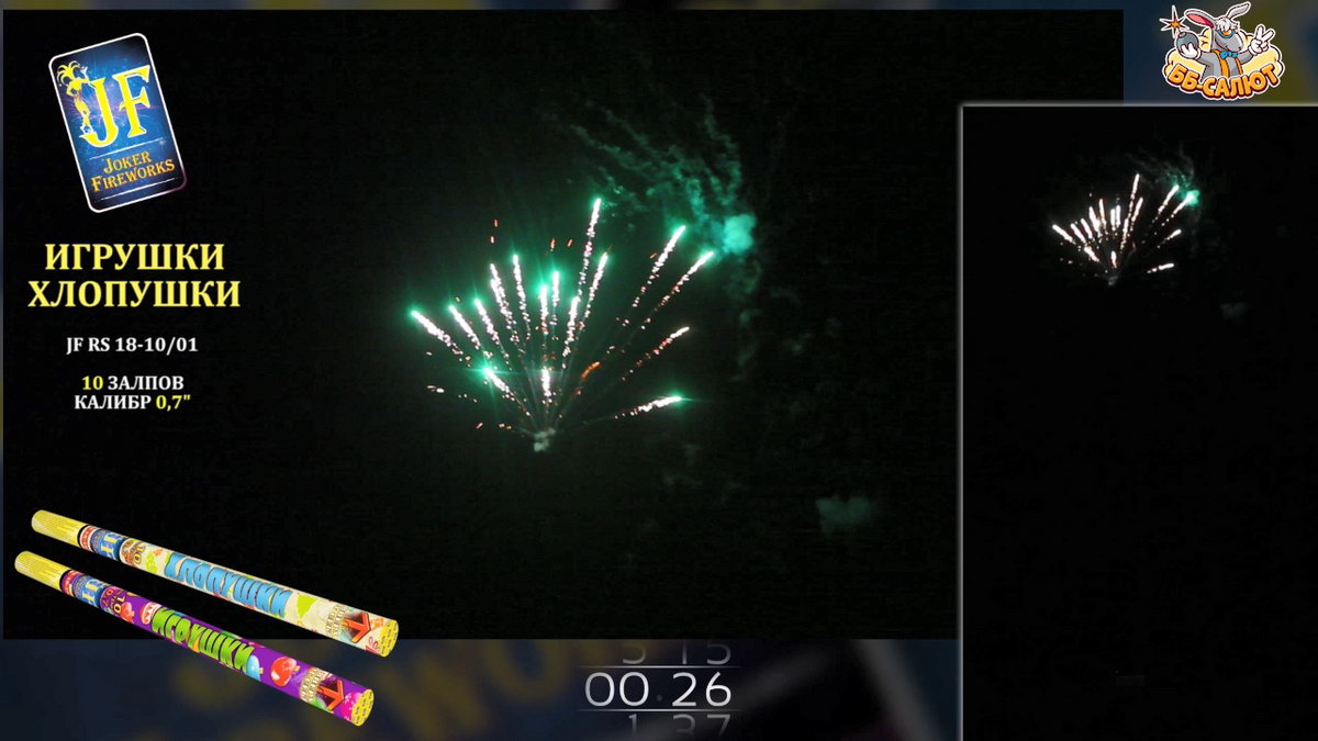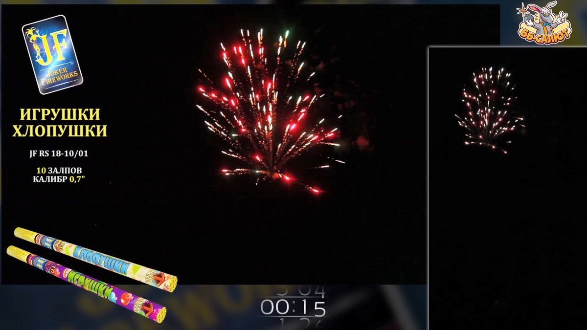 1. Свеча 1 - Серебряная пальма с треском, красная пальма с белым мерцанием, зелёная пальма с треском, красное и зелёное мерцание, хризантема. 2. Свеча 2 - Синий пион с треском, красное мерцание, красно-зелёная пальма с треском, красный пион с зелёным мерцанием.